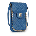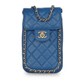 The Chain Around Phone Pouch from Chanel is the perfect accessory to complete any outfit. The bright blue lambskin leather is complimented with a classic CC twist lock closure with the classic leather interwoven chain strap. This bag is an easy, efficient way to carry your phone and be completely handsfree. This stunning little gem is a well-worthy addition to your handbag collection.