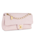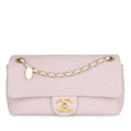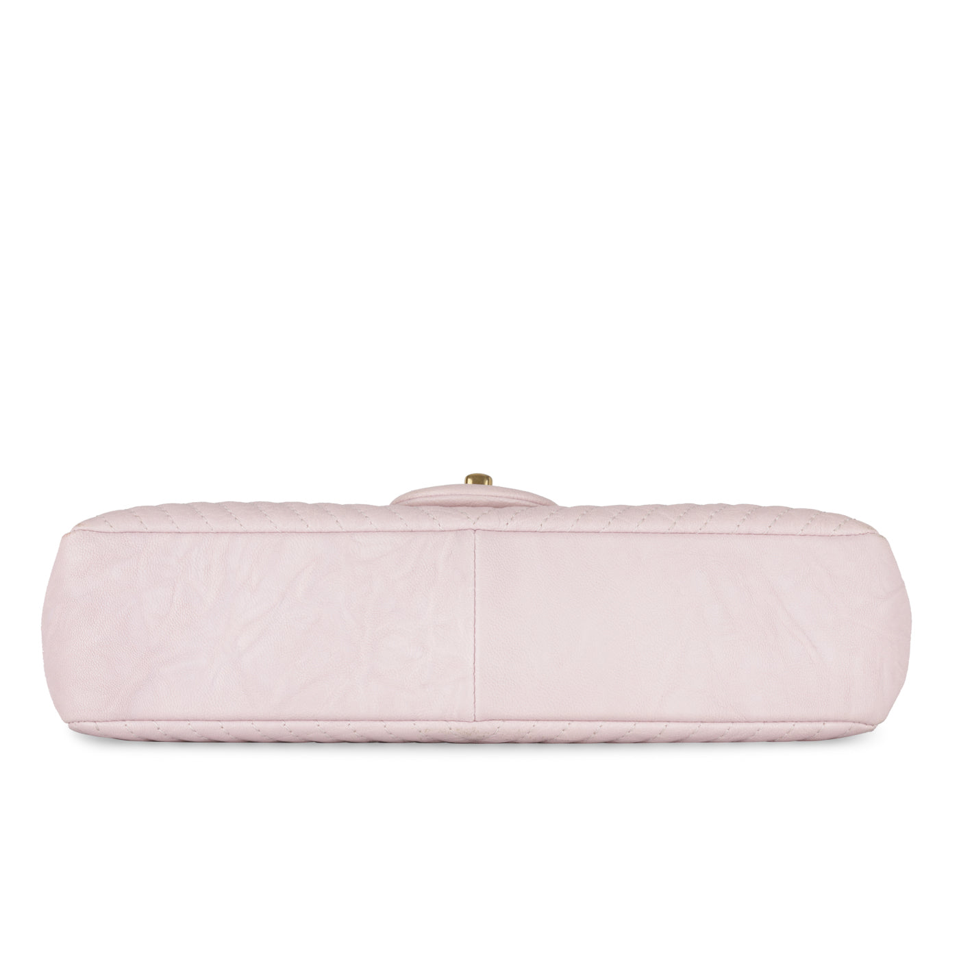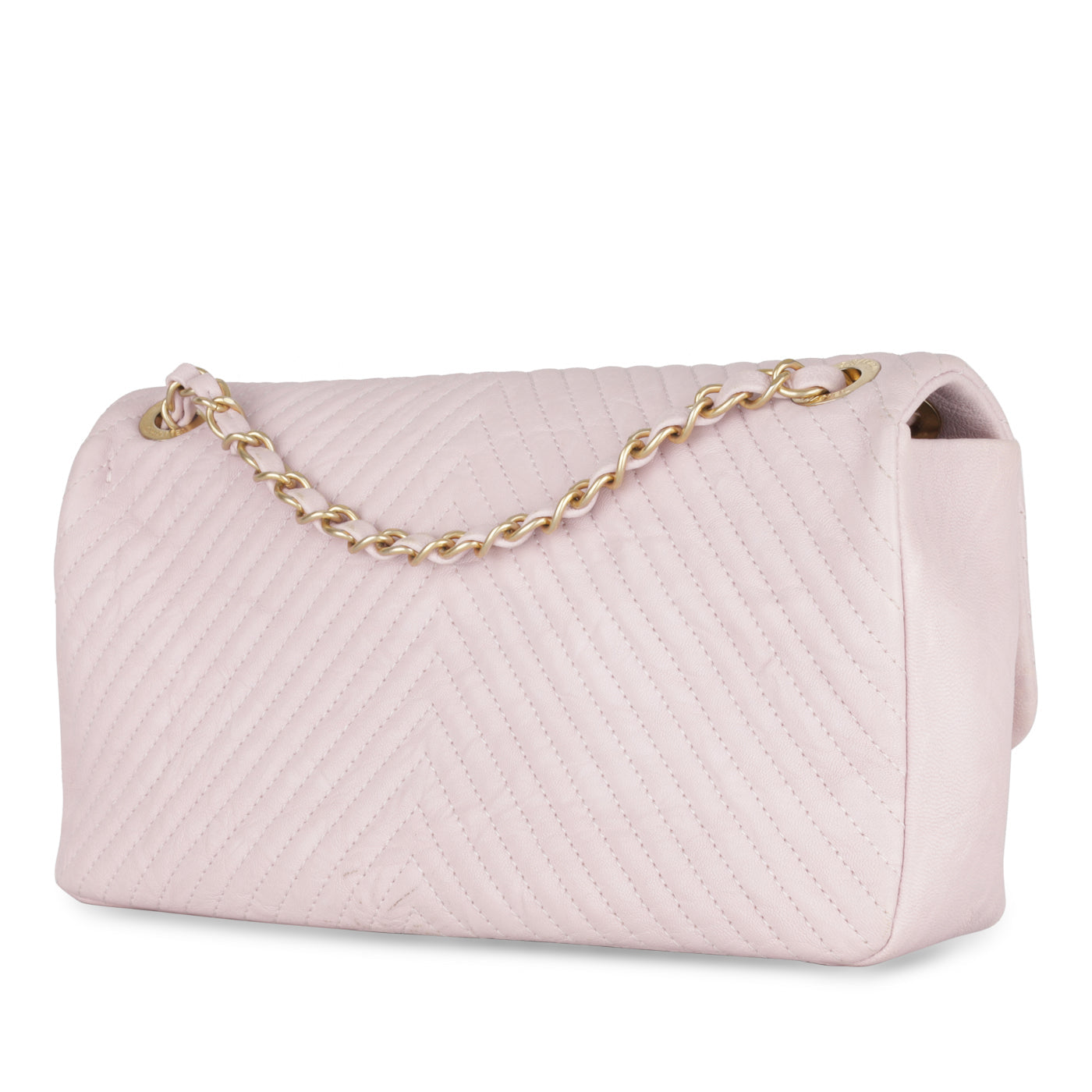 The stunning seasonal chevron flap bag from Chanel is definitely a bag every woman should have in her closet. Carefully crafted in pink goatskin leather and champagne gold tone hardware, this classic and timeless piece is one you'll have forever. Its the perfect option for day-to-night wear. Throw your every day essentials inside the spacious compartment while you add a touch of elegance to your casual outfit.