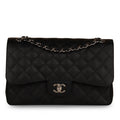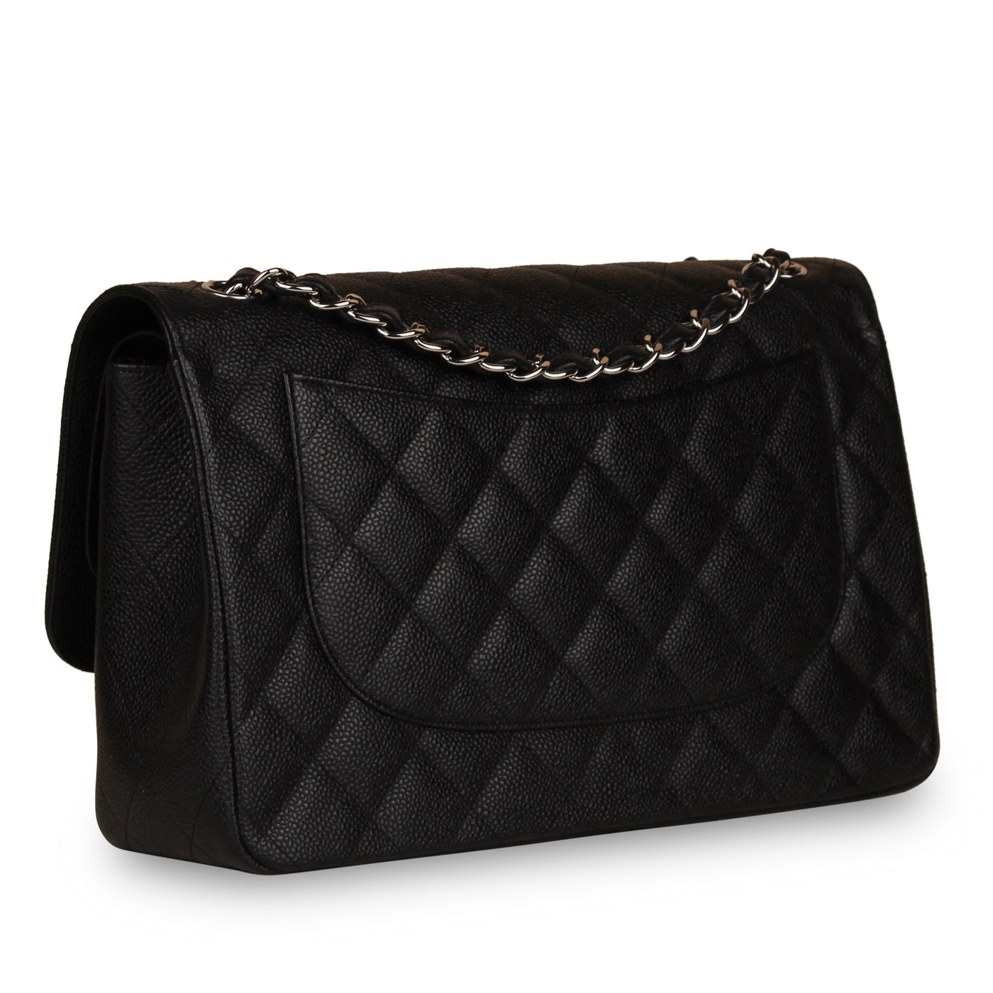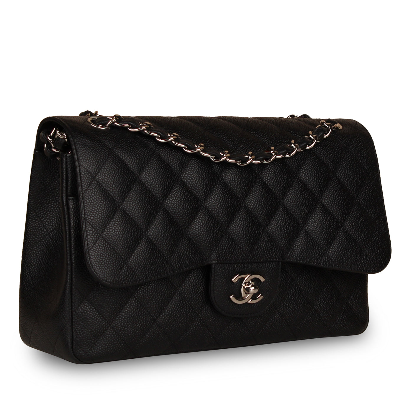 Chanel continues to present its signature line of Classic Flap bags. Under the creative direction of Karl Lagerfeld, the Classic Flap is perhaps the most acclaimed bag in all of fashion history. Timeless, elegant and sophisticated, it's no wonder the Classic Flap is, well, a classic. Featuring its infamous quilted caviar leather and interwoven chain / leather strap, the Jumbo is an absolute must-have in any luxury handbag collection. Not only is this highly coveted, stunning black bag the perfect compliment to pretty much anything you have in your wardrobe, but it's also an investment piece that will never lose its value. Embodying elegance and traditional femininity to a T, a Chanel bag is a purchase you won't ever regret.