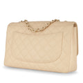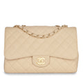 The Classic Flap is perhaps the most acclaimed bag in all of fashion history. Timeless, elegant and sophisticated, it's no wonder the Classic Flap is, well, a classic. Featuring its infamous quilted caviar leather and interwoven chain / leather strap, the Jumbo is an absolute must-have in any luxury handbag collection. Not only is this highly coveted, this stunning beige bag the perfect accessory to compliment anything in your wardrobe, but it's also an investment piece that will never lose its value.
