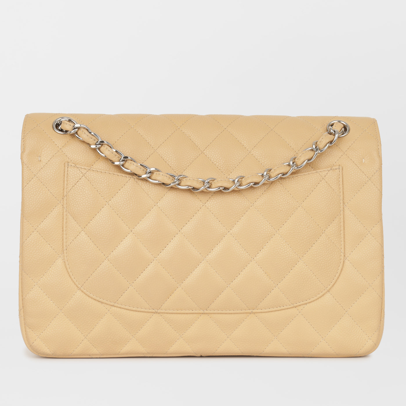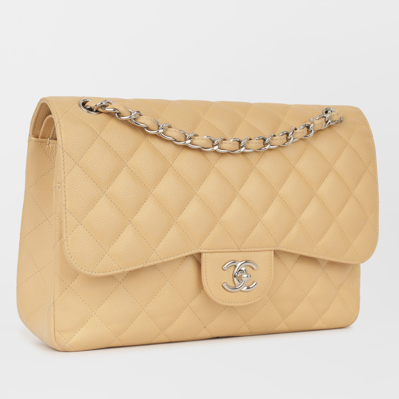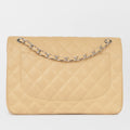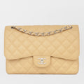 The Classic Flap is perhaps the most acclaimed bag in all of fashion history. Timeless, elegant and sophisticated, it's no wonder the Classic Flap is, well, a classic. Featuring its infamous quilted caviar leather and interwoven chain / leather strap, the Jumbo is an absolute must-have in any luxury handbag collection. Not only is this highly coveted, this stunning beige bag the perfect accessory to compliment anything in your wardrobe, but it's also an investment piece that will never lose its value.