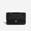 Chanel continues to present its signature line of Classic Flap bags. Under the creative direction of Karl Lagerfeld, the Classic Flap is perhaps the most acclaimed bag in all of fashion history. Timeless, elegant and sophisticated, it's no wonder the Classic Flap is, well, a classic. Featuring its infamous quilted caviar leather and interwoven chain / leather strap, the Jumbo is an absolute must-have in any luxury handbag collection.