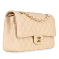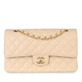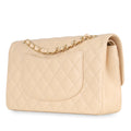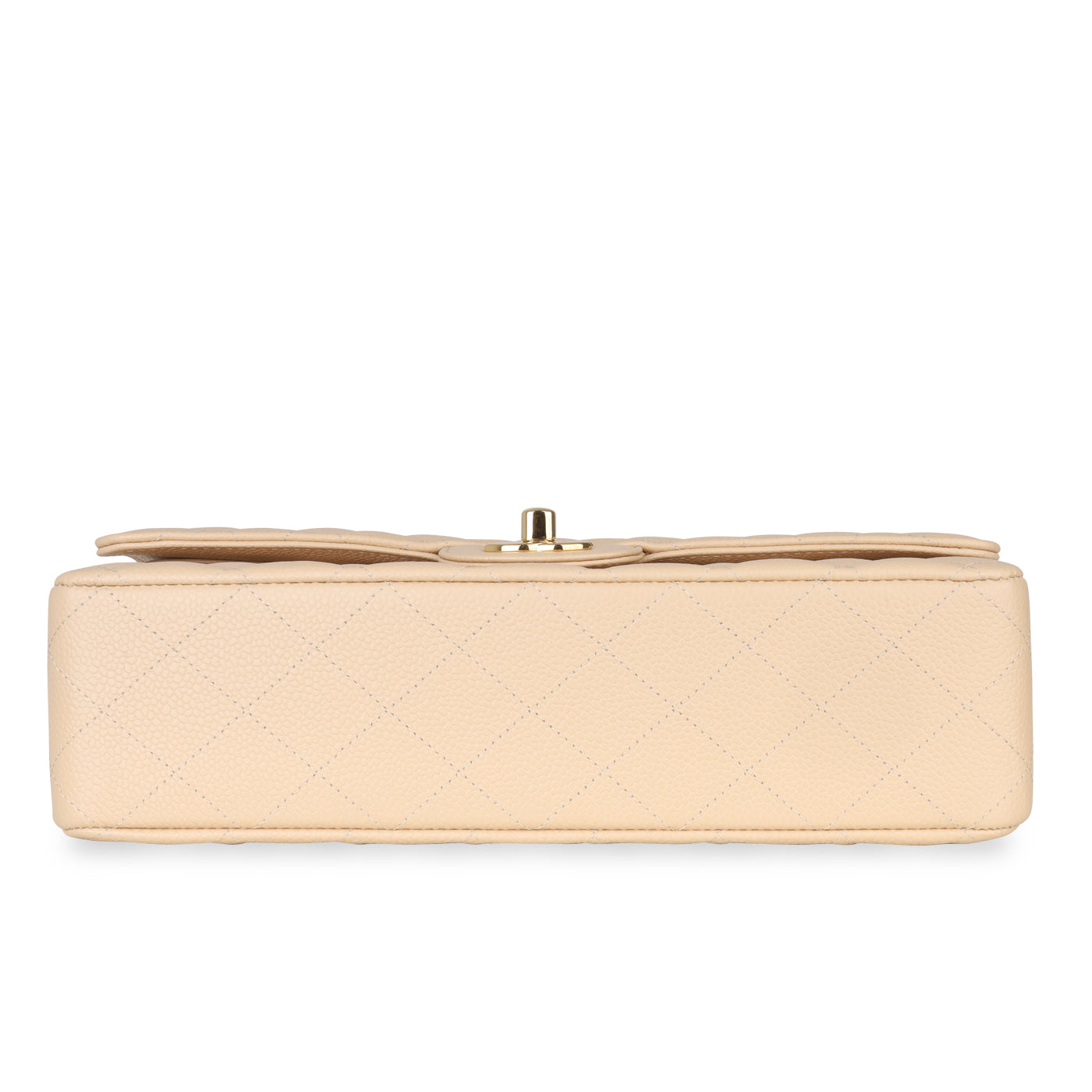 There is no better investment than a Chanel classic flap bag. This Classic Flap in Medium is one of the most sought after pieces. It is impeccably crafted in beige caviar leather and champagne gold hardware. The chain is interwoven with leather and can be worn on either a single shoulder strap or doubled up.