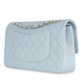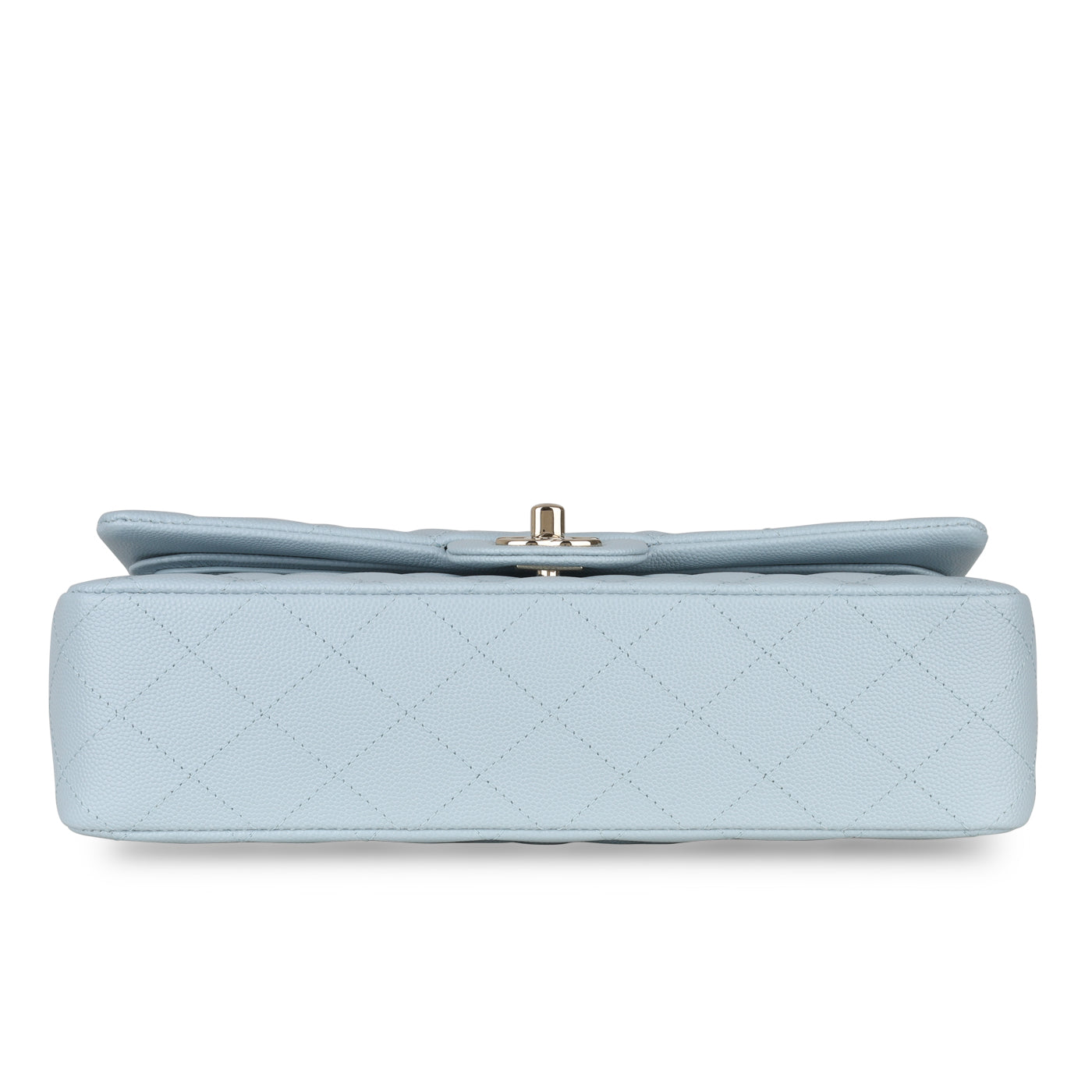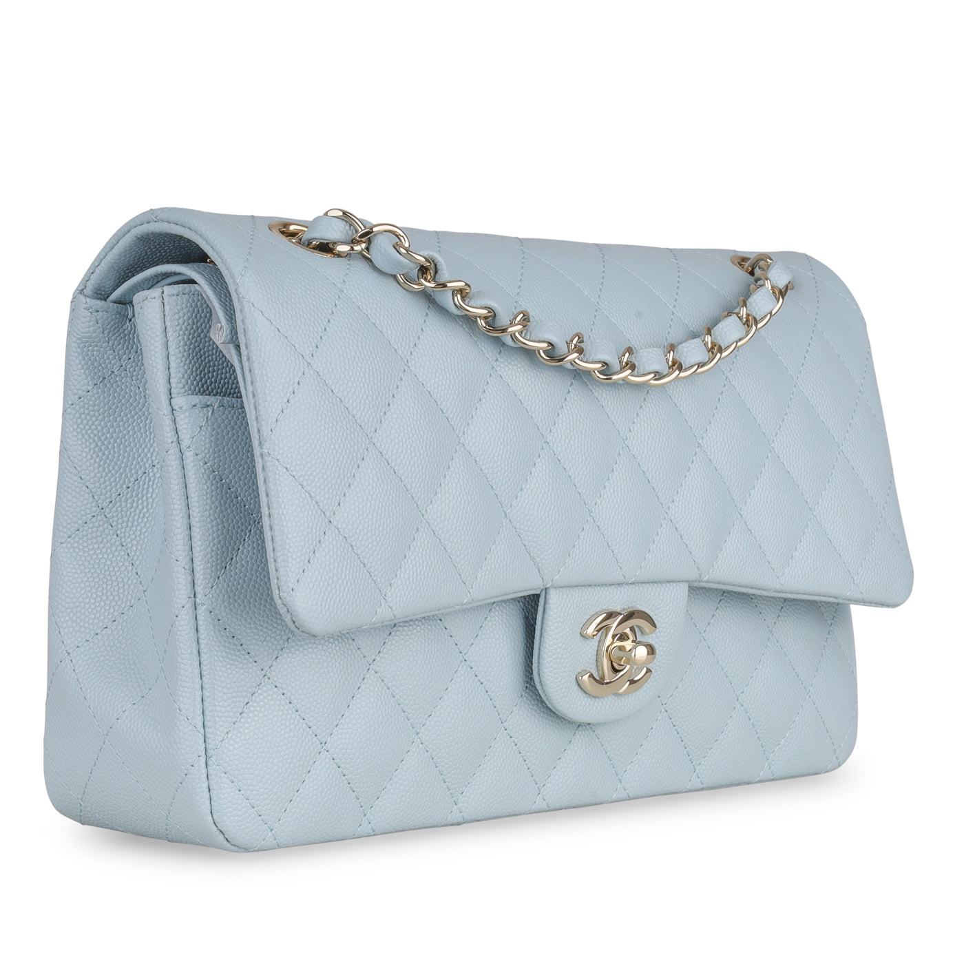 There is no better investment than a Chanel classic flap bag. This Classic Flap in Medium is one of the most sought after pieces. It is impeccably crafted in baby blue caviar leather and champagne gold hardware. The chain is interwoven with leather and can be worn on either a single shoulder strap or doubled up.