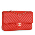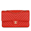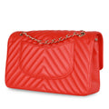 This unique Classic Chanel bag is crafted in bright red leather and detailed with chevron stitching. The chain is interwoven with leather and can be worn on either a single shoulder strap or doubled up. A rare piece, this will definitely add some excitement to any outfit.