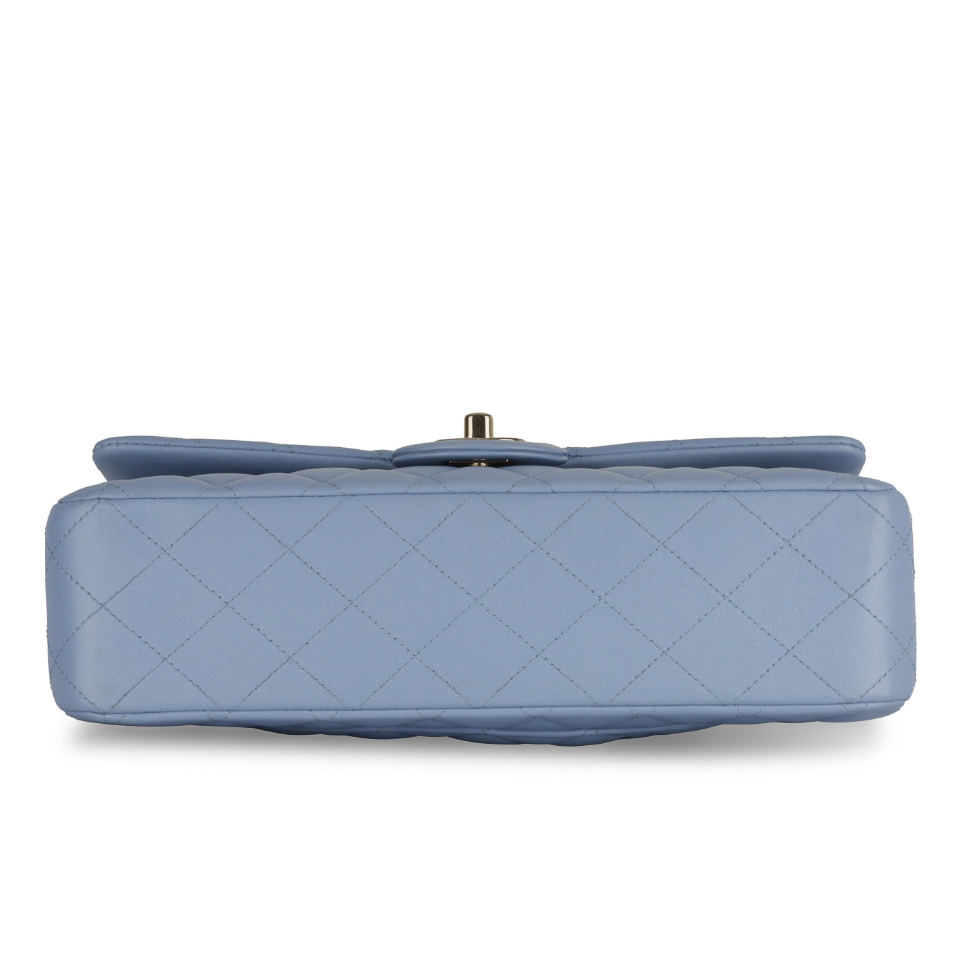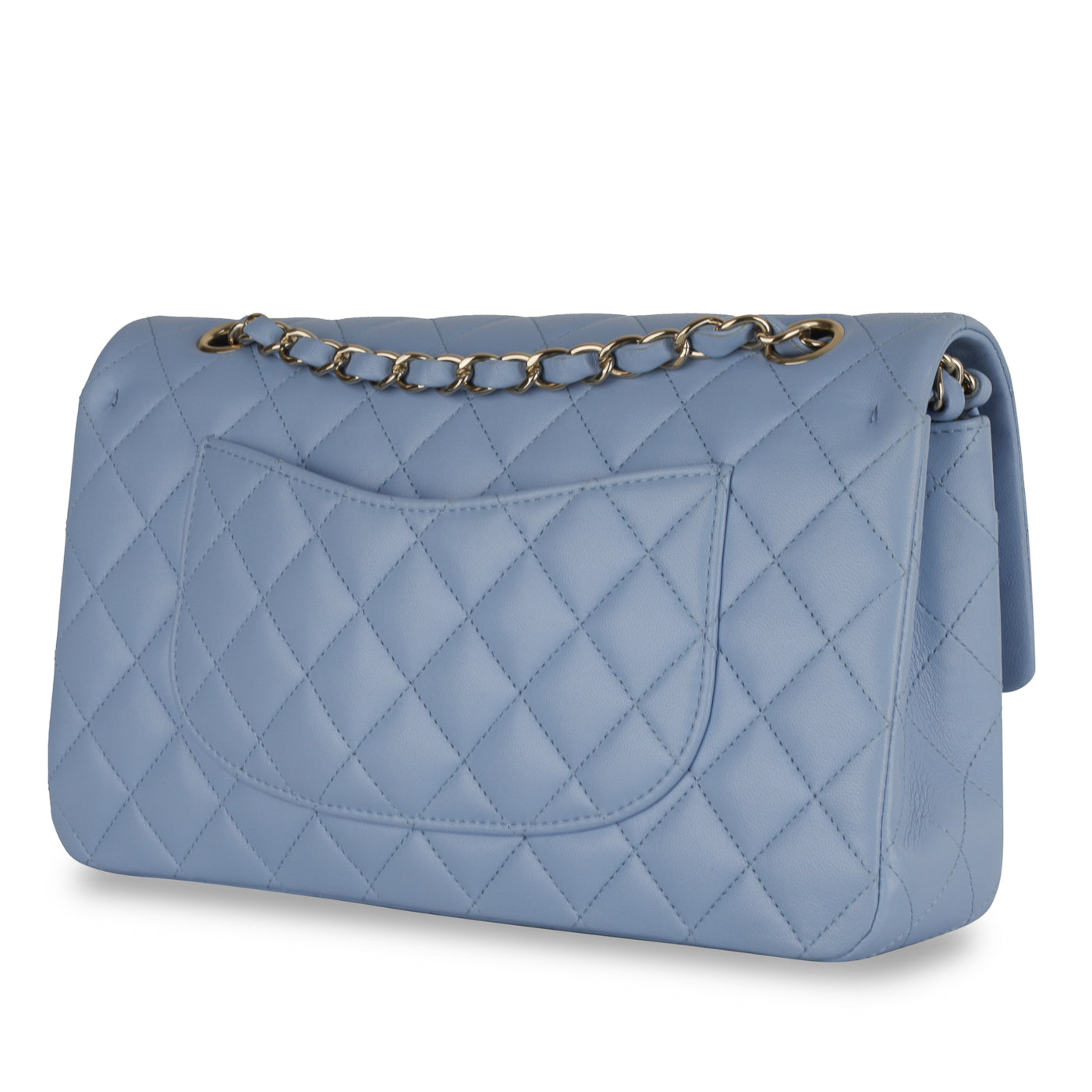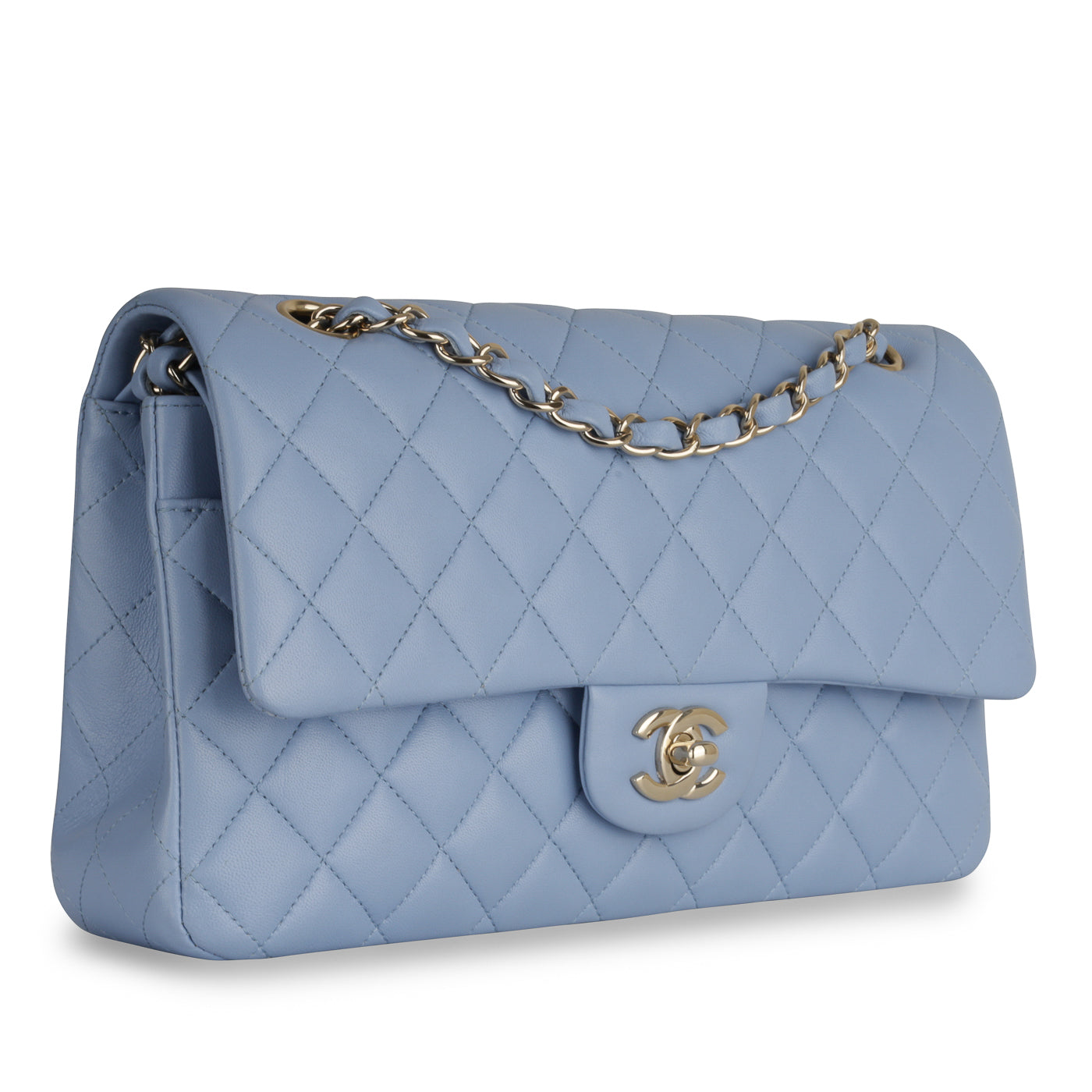 The enviable Double Flap bag is crafted in the soft and buttery lambskin leather and detailed with fine stitching and champagne gold hardware. The chain is interwoven with leather and can be worn on either a single shoulder strap or doubled up. The blue colour means this bag pops as a statement in any wardrobe!