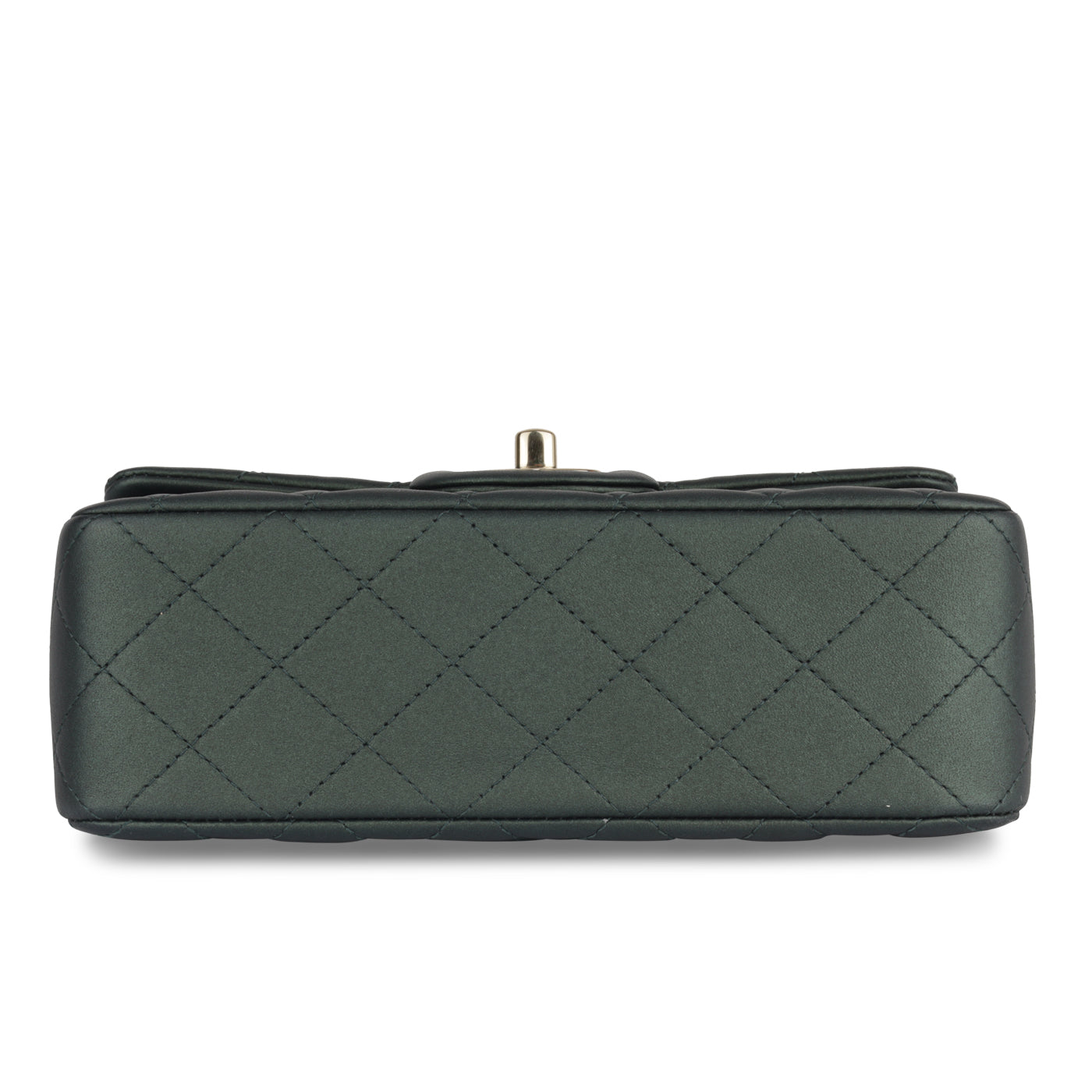 The mini rectangular flap bag from 2022 is an absolute vision. Crafted from metallic dark green lambskin leather, it is the perfect little piece is definitely hard to get your hands on. The perfect accessory for basically anything, this mini Chanel is the ideal complement to any outfit for any occasion.