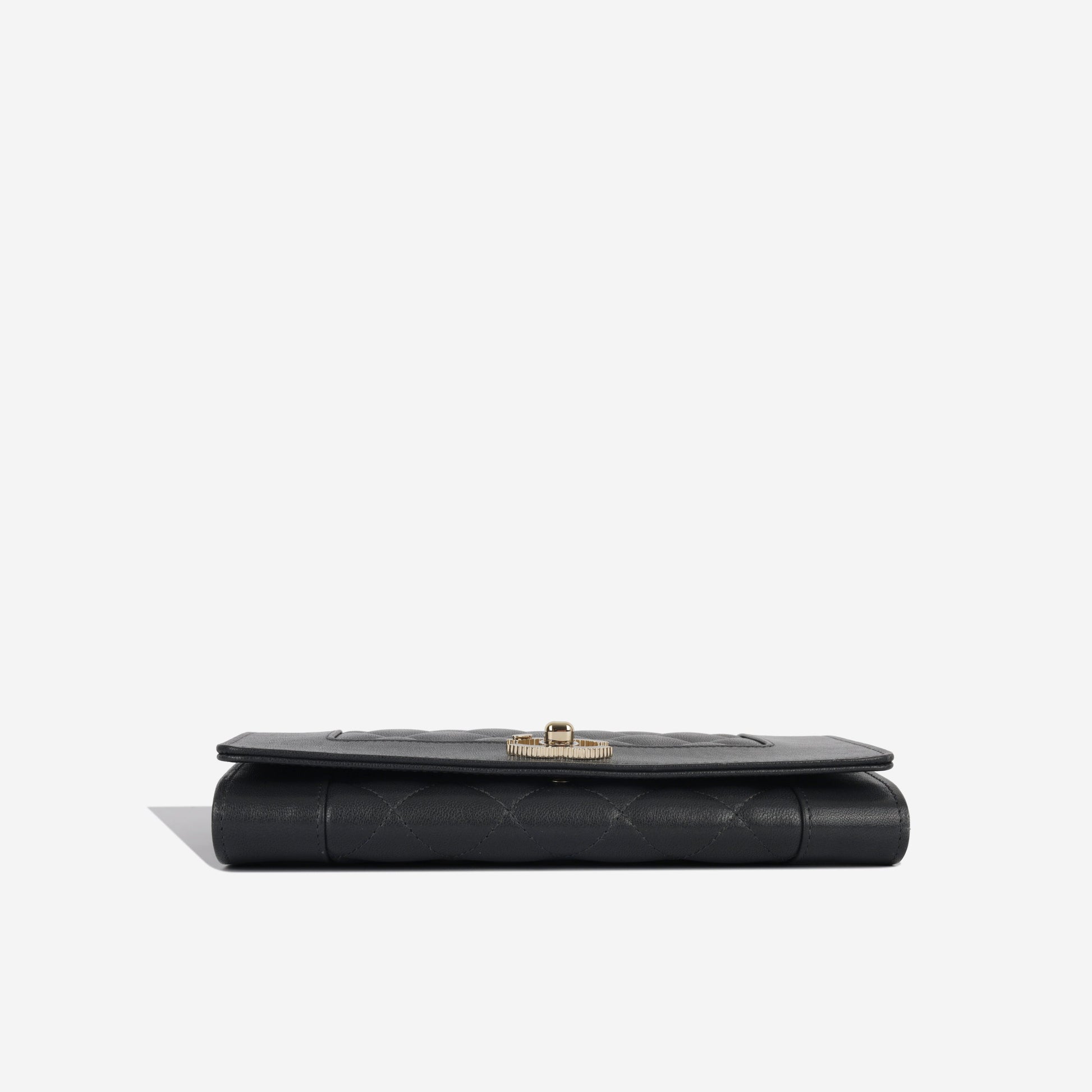 The Mademoiselle flap wallet from French fashion house Chanel is a rare find, featuring the signature central quilted lambskin, contrasted against a smooth leather panel round the edges. The beautiful shade of charcoal grey can be worn throughout the year, and the champagne gold tone hardware is the iconic choice to make to stand out from the crowd.