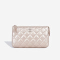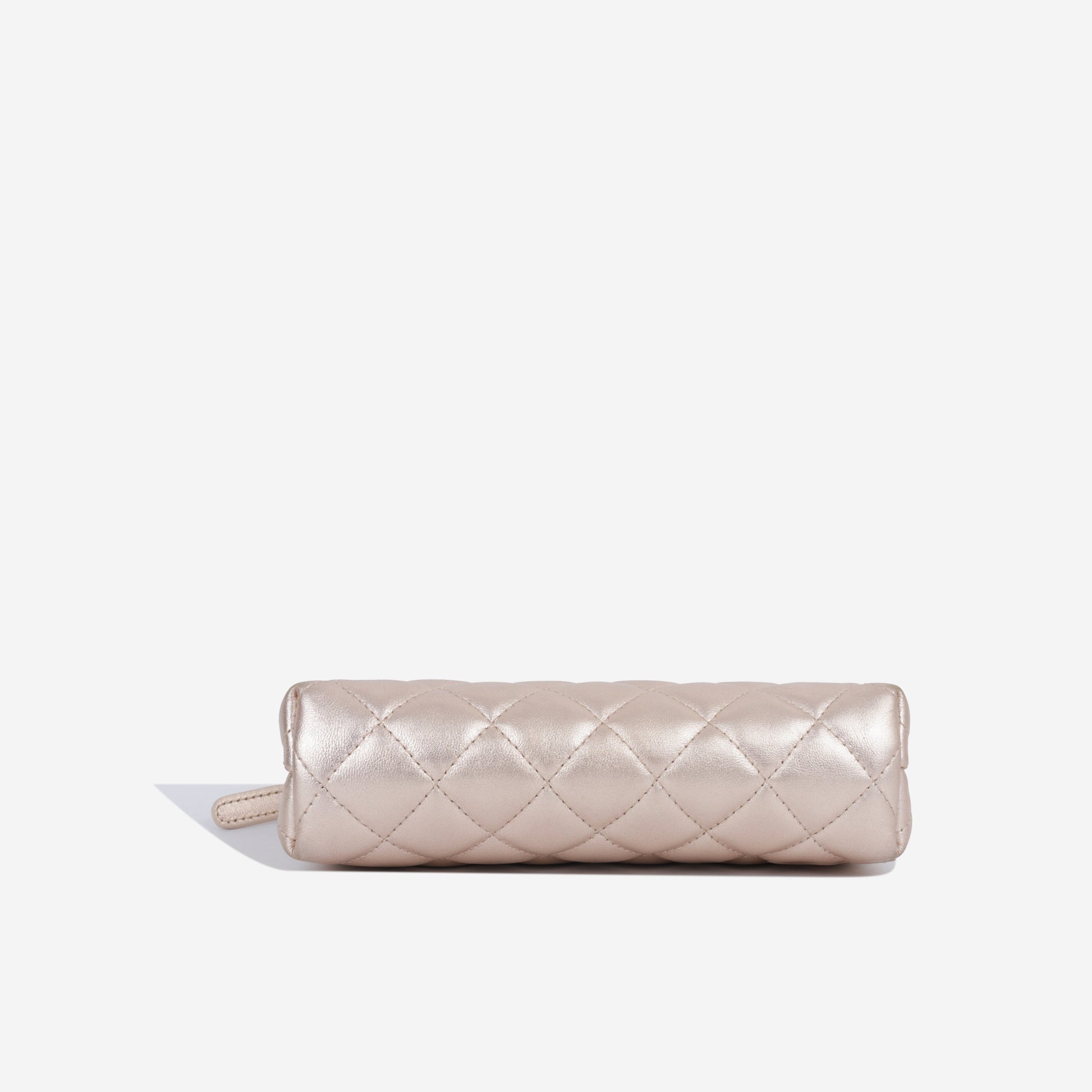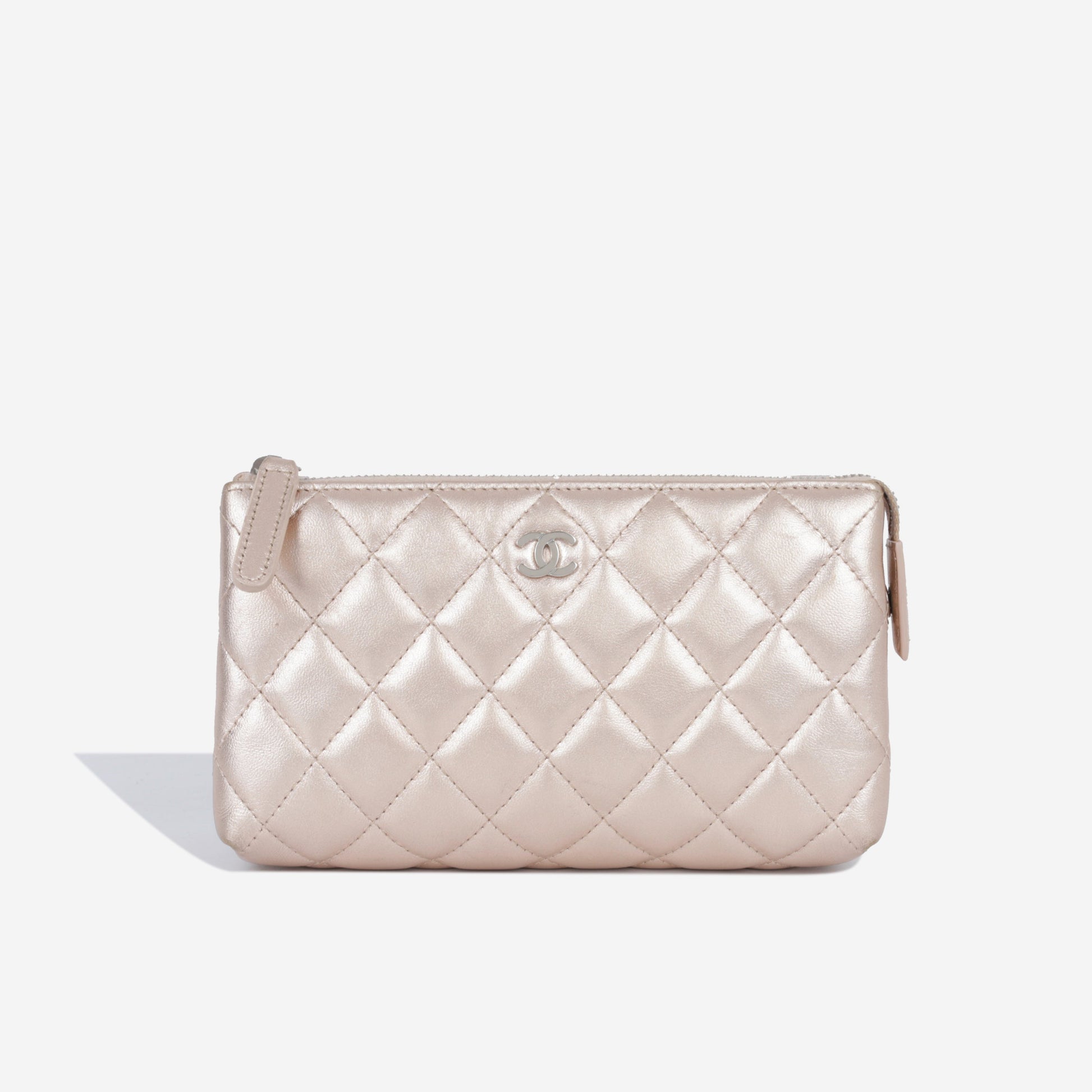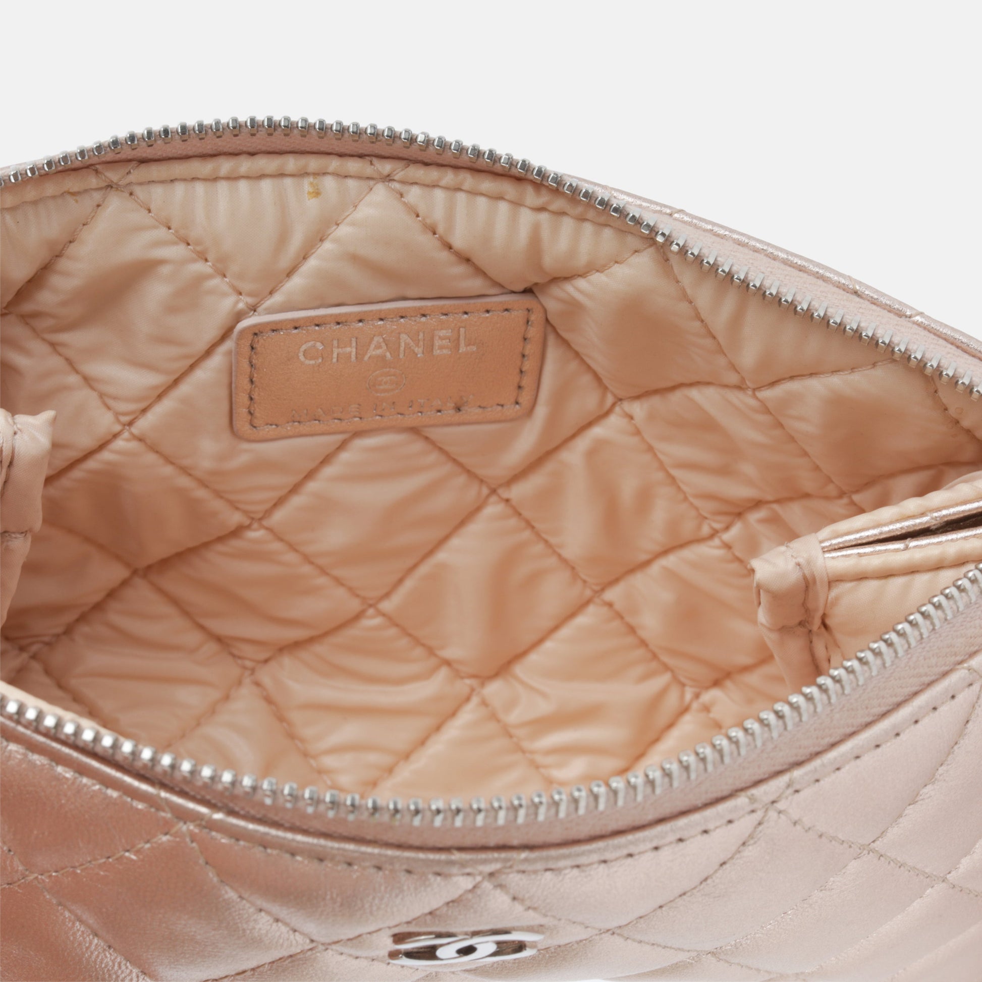 Crafted from metallic leather in a rosé tone, Chanel presents their eye-catching O-case mini pouch. With the signature CC logo in silver tone hardware, this piece is sleek, stylish and sophisticated. The perfect little piece to add to your handbag and keep your belongings safe, this item is elegant and feminine.