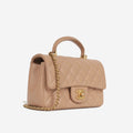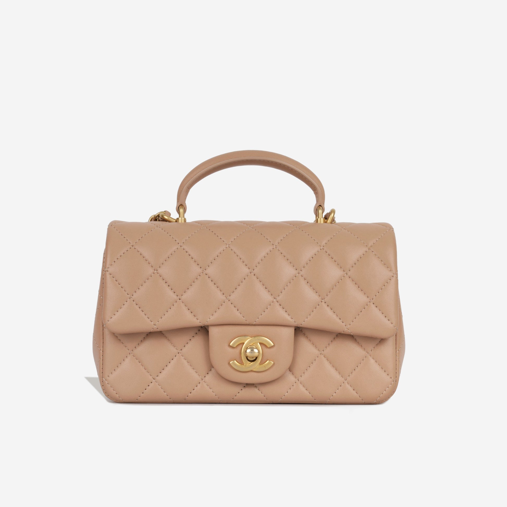 The mini rectangular Chanel flap bag comes with an updated feature of the top handle. Crafted from lambskin leather and coupled with champagne gold-tone hardware, this little Chanel is definitely hard to get your hands on.