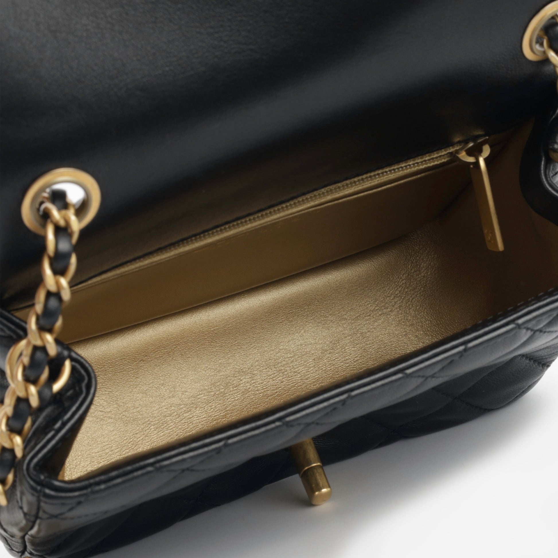 The Chanel Pearl Crush mini square flap bag is an absolute vision. We love her, to say the very least. Crafted from black lambskin leather with brushed gold-tone hardware, this perfect little piece is extremely hard to get your hands on. The perfect accessory for basically anything, this mini Chanel is the ideal compliment to any outfit for any occasion.