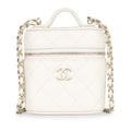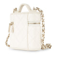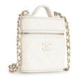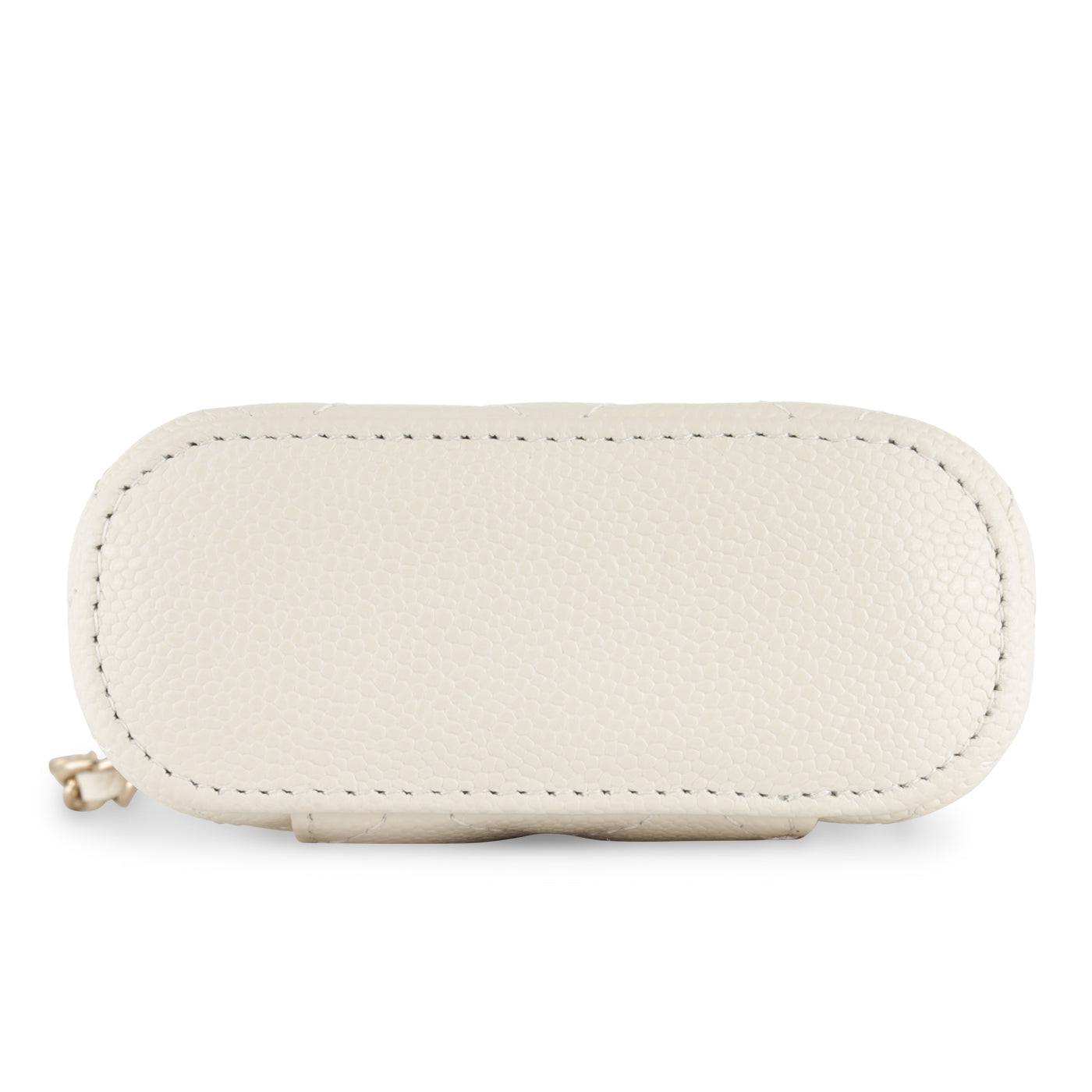 Primarily developed for storing your tiny beauty essentials and other small necessities, the vanity case has come a rather long way since its birth. With the “mini bag” remaining at the forefront of fashion accessory trends, this petite piece is the farthest thing from just a functional case. This vanity case is crafted in white caviar hardware and complimented with champagne gold toned hardware.