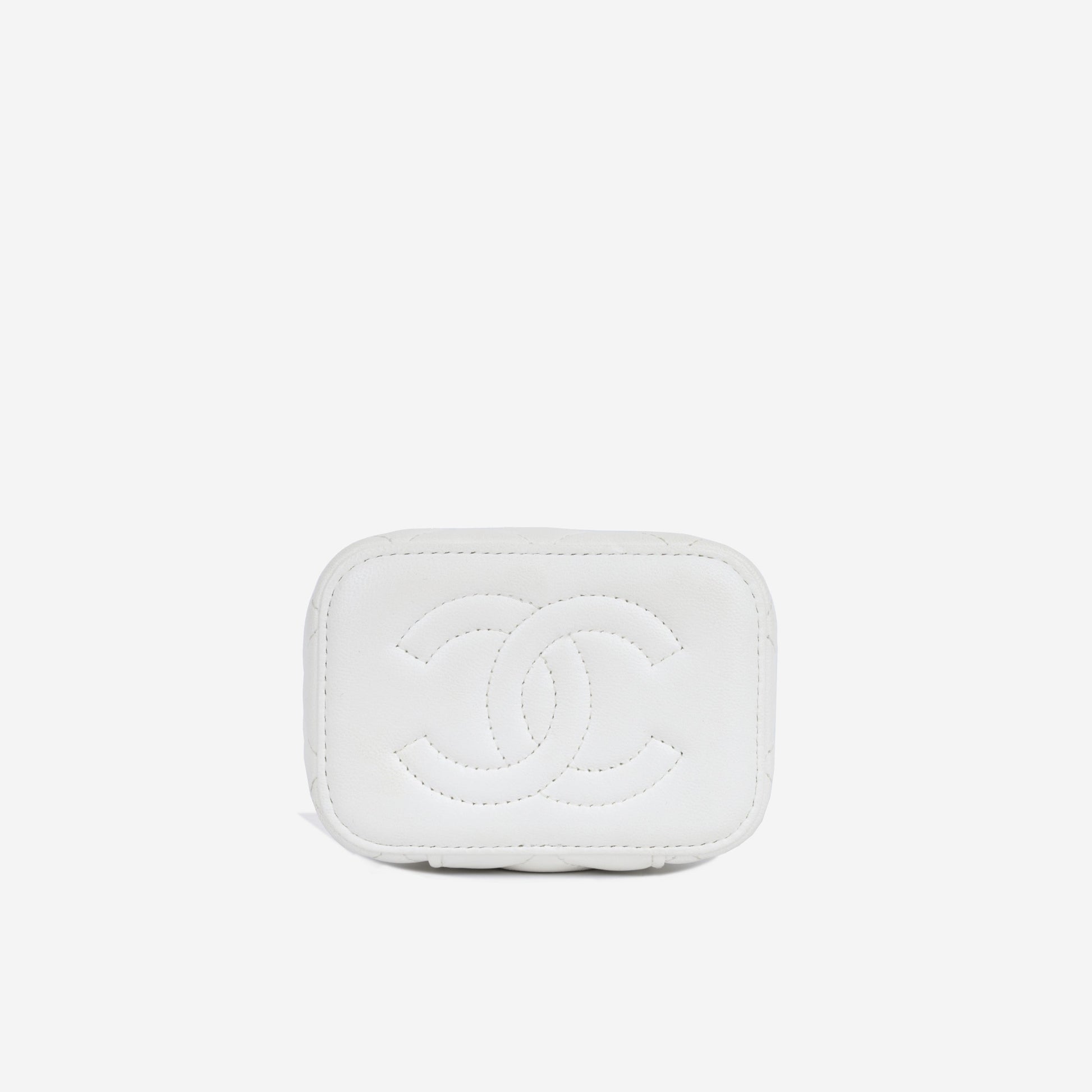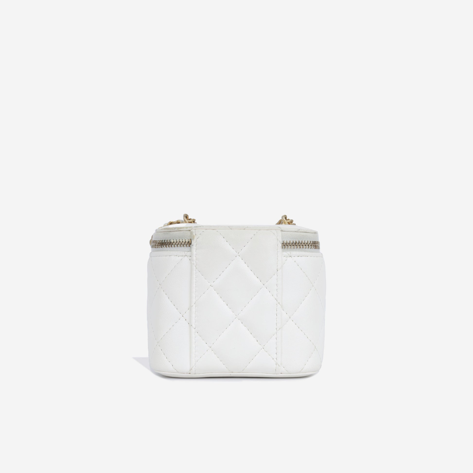 Primarily developed for storing your tiny beauty essentials and other small necessities, the vanity case has come a rather long way since its birth. With the “mini bag” remaining at the forefront of fashion accessory trends, this petite piece is the farthest thing from just a functional case. This vanity case is crafted in white lambskin hardware and complimented with champagne gold toned hardware.