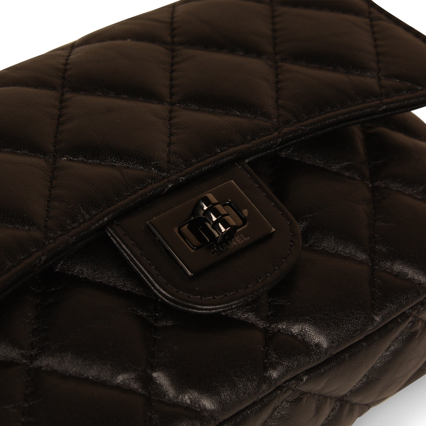 - ‘Chanel’ logo embossed in leather