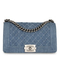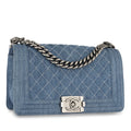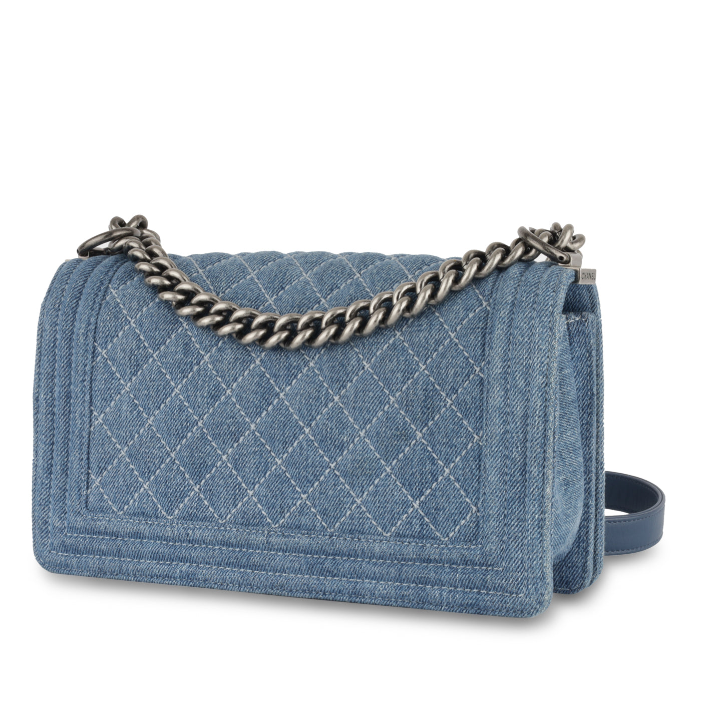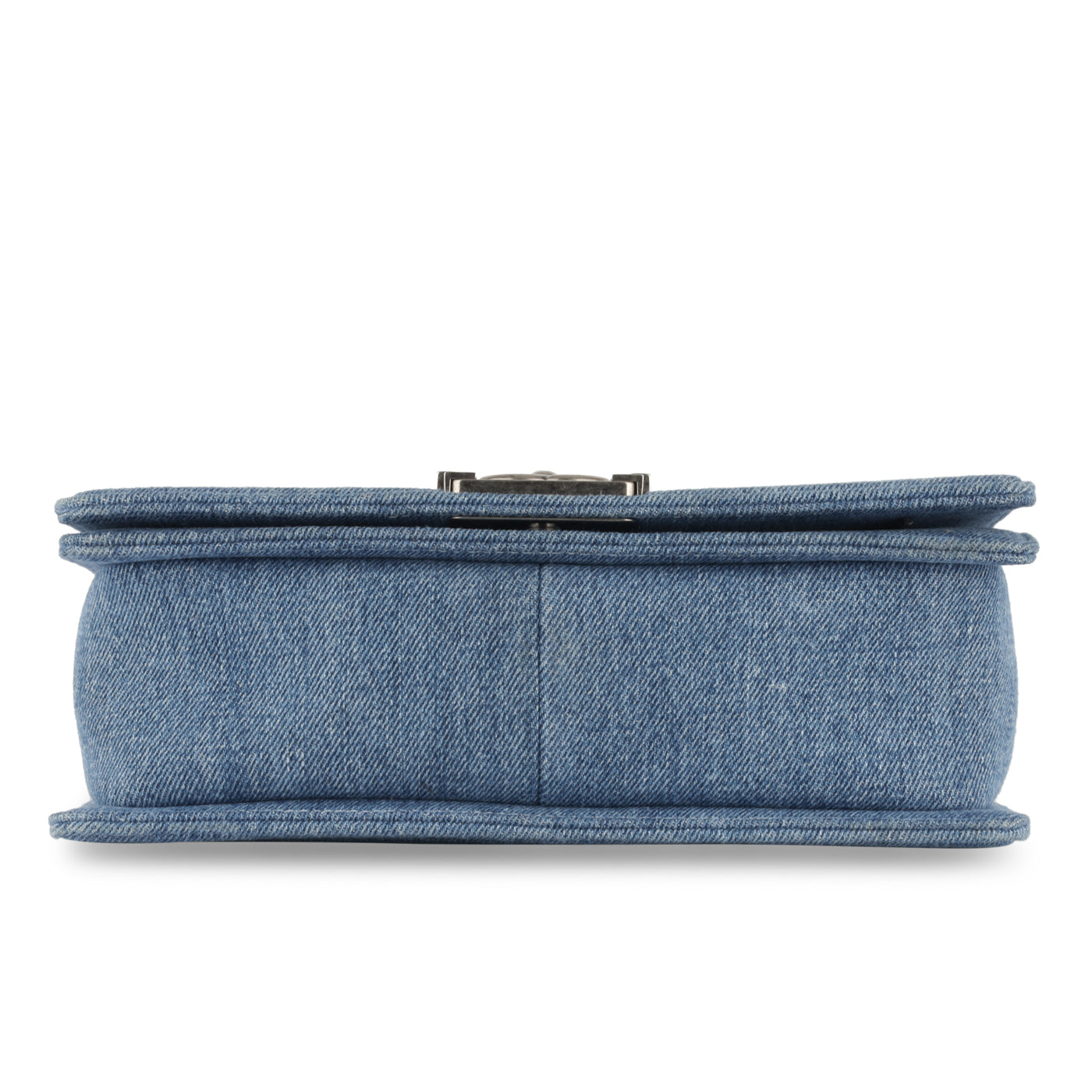 Chanel presents one of its highly acclaimed and most sought-after bags, the Chanel Boy Bag in size Old Medium in this wonderful denim wash combined with ruthenium hardware. As designed by Karl Lagerfeld, the Boy Bag collection was established to embody boyish charm and femininity. Large enough to fit in all your daily essentials, this is the perfect piece you need for 2022.