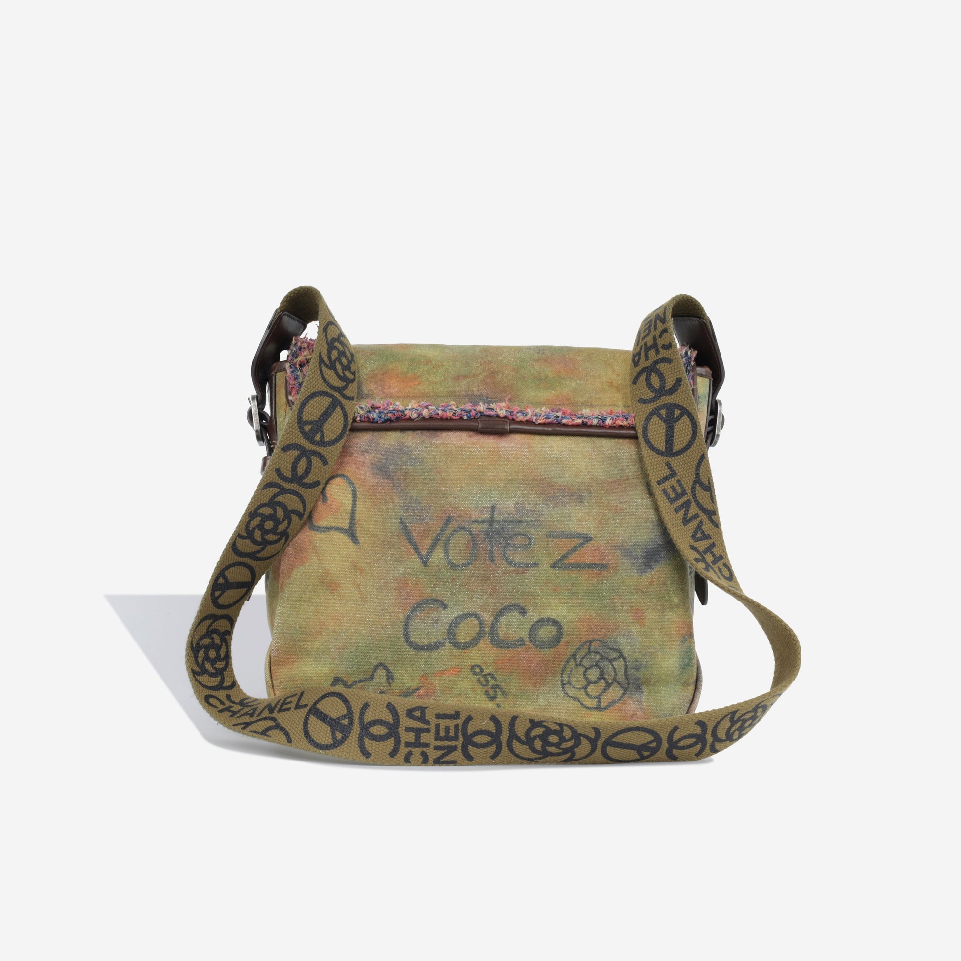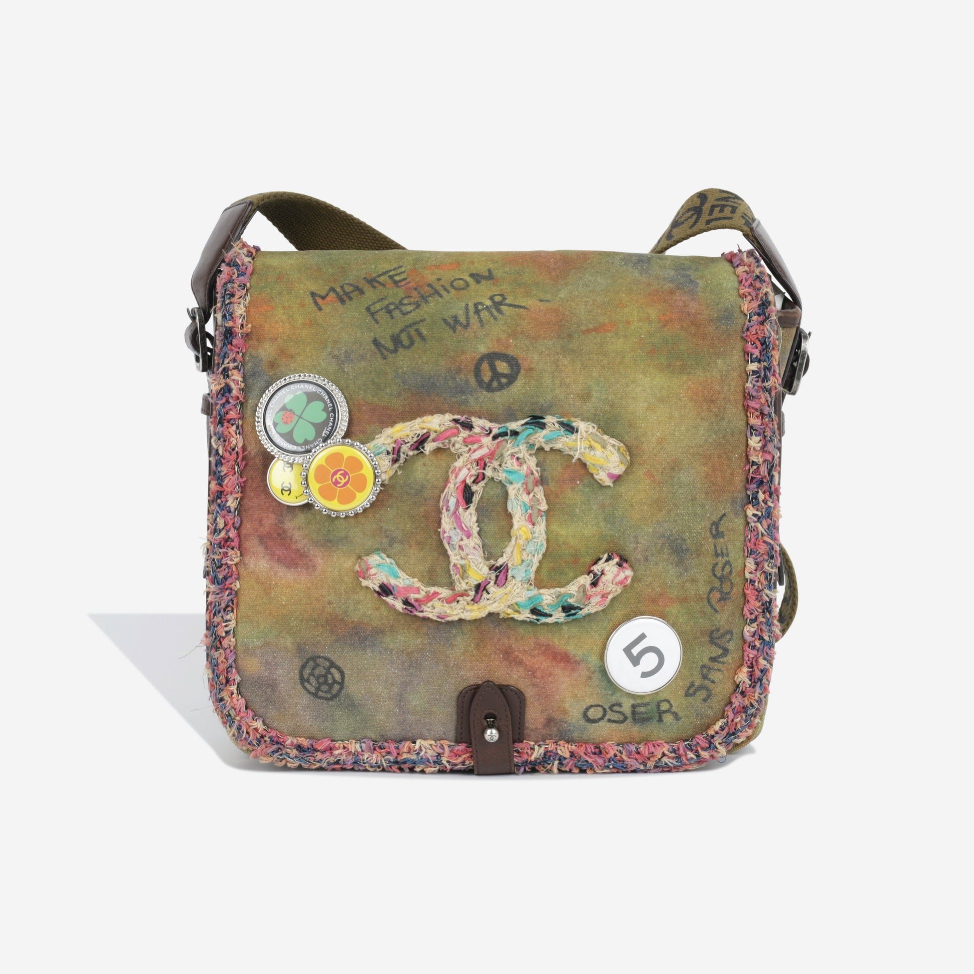 The On the Pavement messenger bag was sold out all over the world, after its launch in 2015. The runway at the Grand Palais was decorated with pavements and puddles, and the clothes and accessories carried important messages making a statement to all that witnessed. This particular bag is beautifully created with green fabric and carries so many intricate details, such as badges and mixed materials. This is truly a special piece highlighted in Chanels rich history, and should be treasured forever.