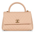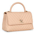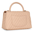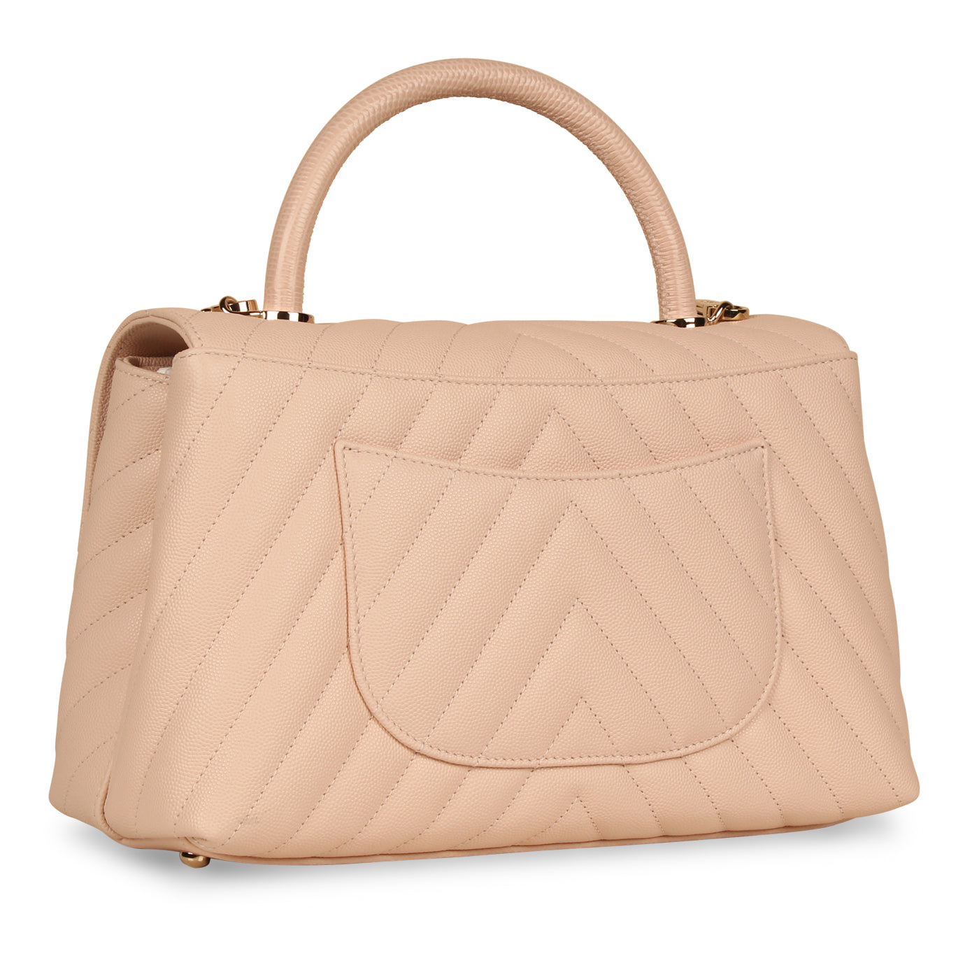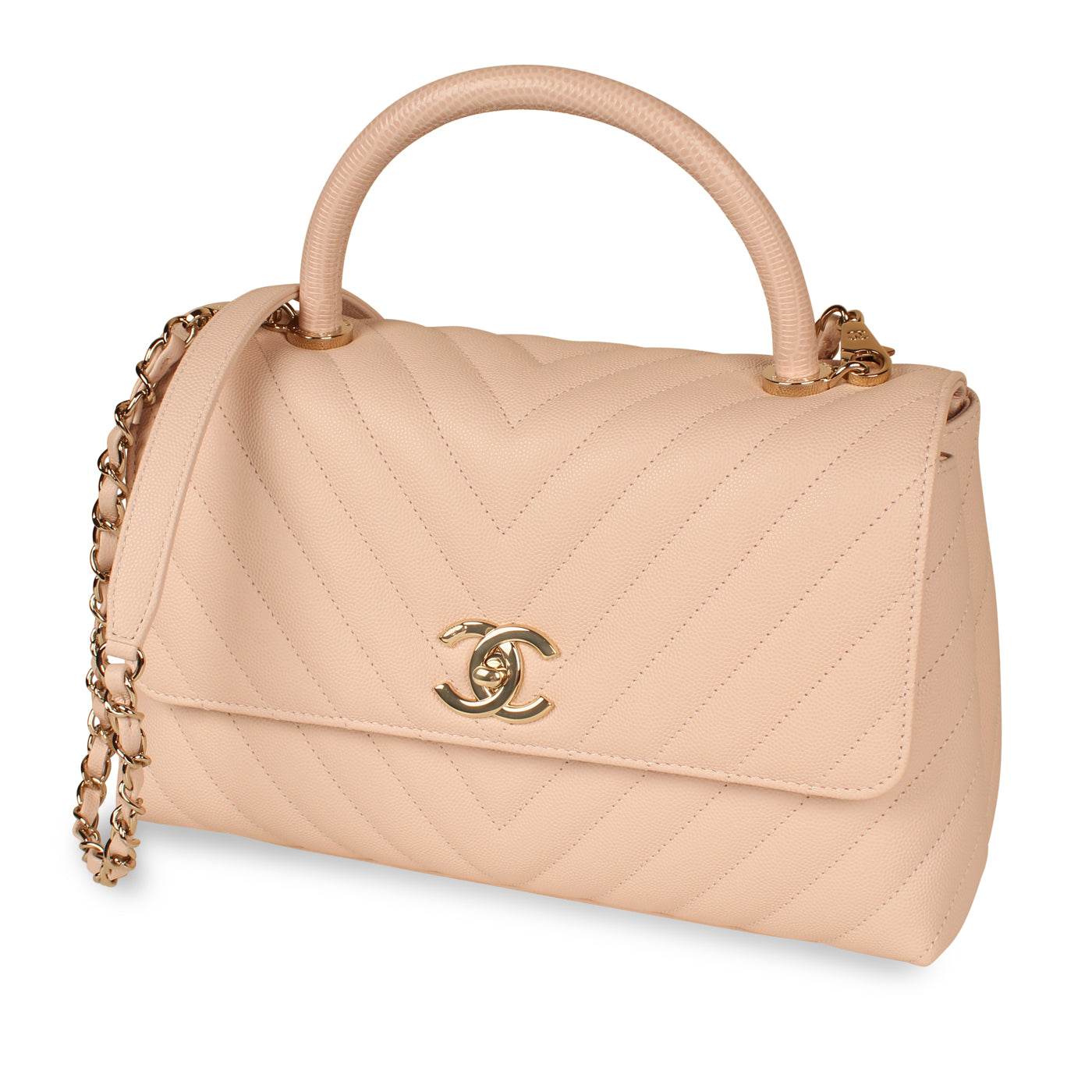 Crafted from caviar leather in a chevron style, Chanel presents the beloved Medium Coco Handle Flap in baby pink The handbag is adorned with champagne gold toned hardware and the fashion house’s quintessential interlocking CC closure. The shoulder bag features a sturdy rolled top handle in python leather and a detachable shoulder strap, making this magnificent handbag great for both meetings and dinners, dresses and trousers. The flap opens up to a well partitioned fabric interior with ample space for your necessities, from slip pockets to zip pockets; there is very little this handbag lacks.
