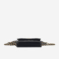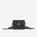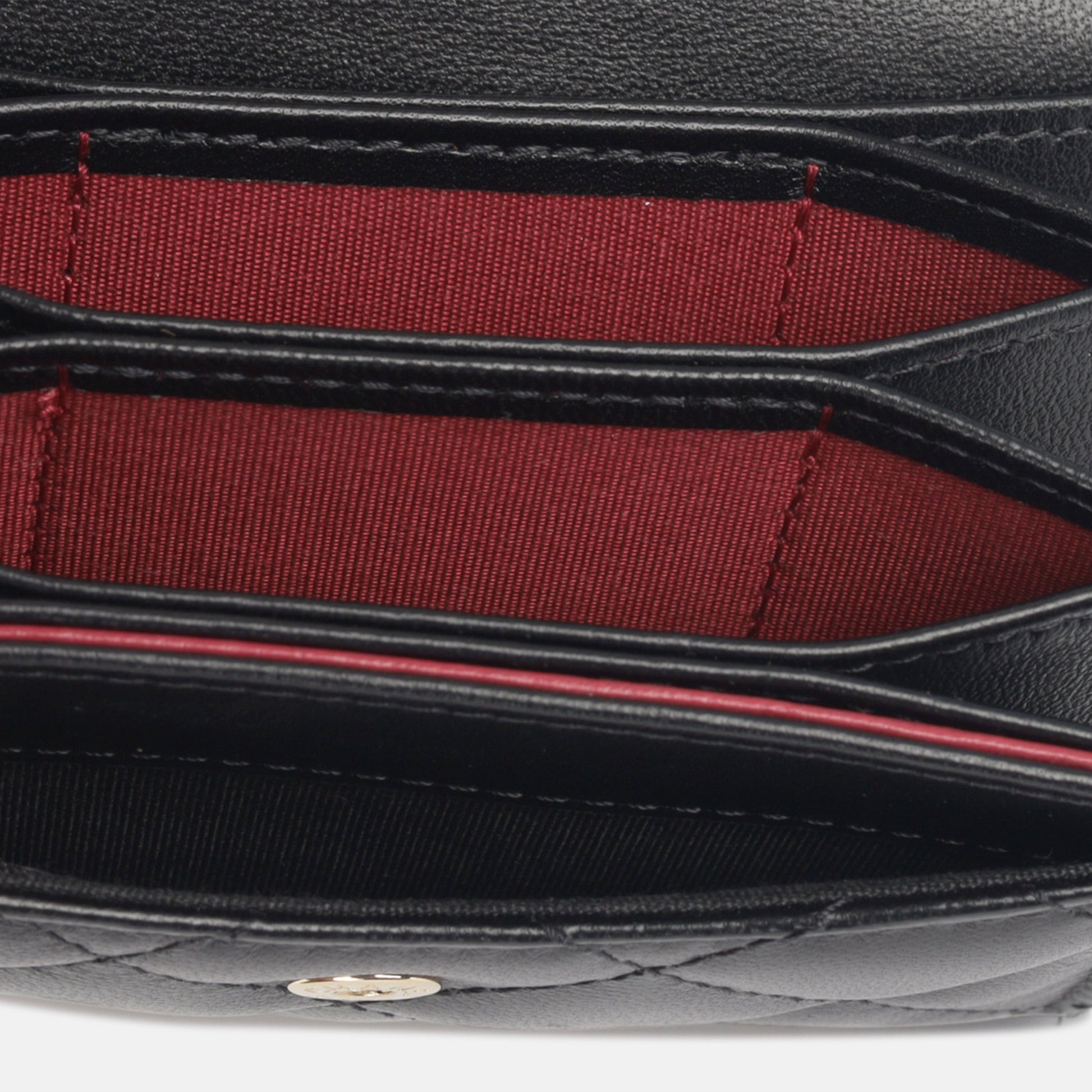 This quilted romance sling is a different take on the card holder on chain from Chanel. This piece is unique as it features a gathered leather panel on the chain, adding both comfort and detail when wearing across the body. Wear this on its own when you just need to carry cards with you, or as a layering piece with another bag to add dimension.