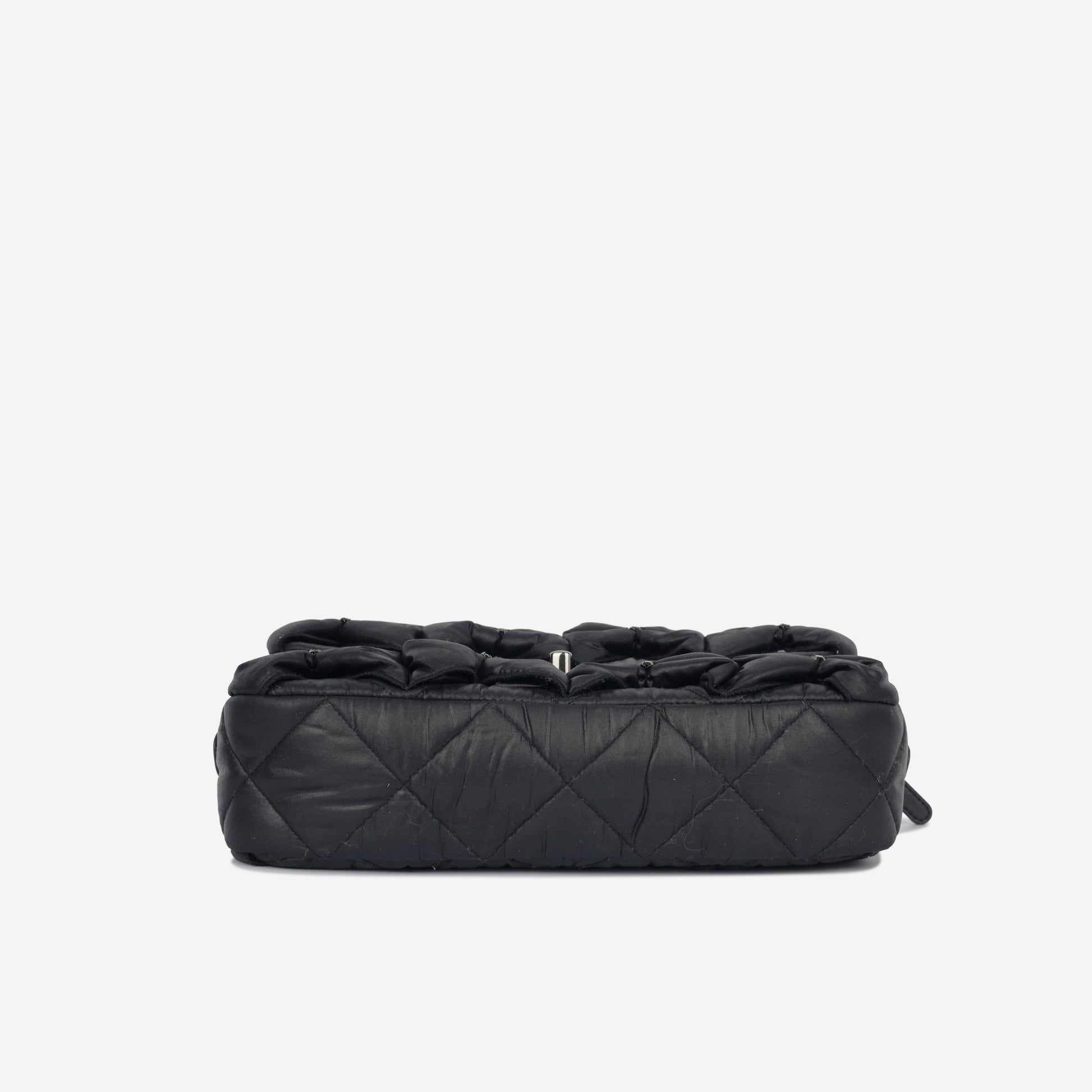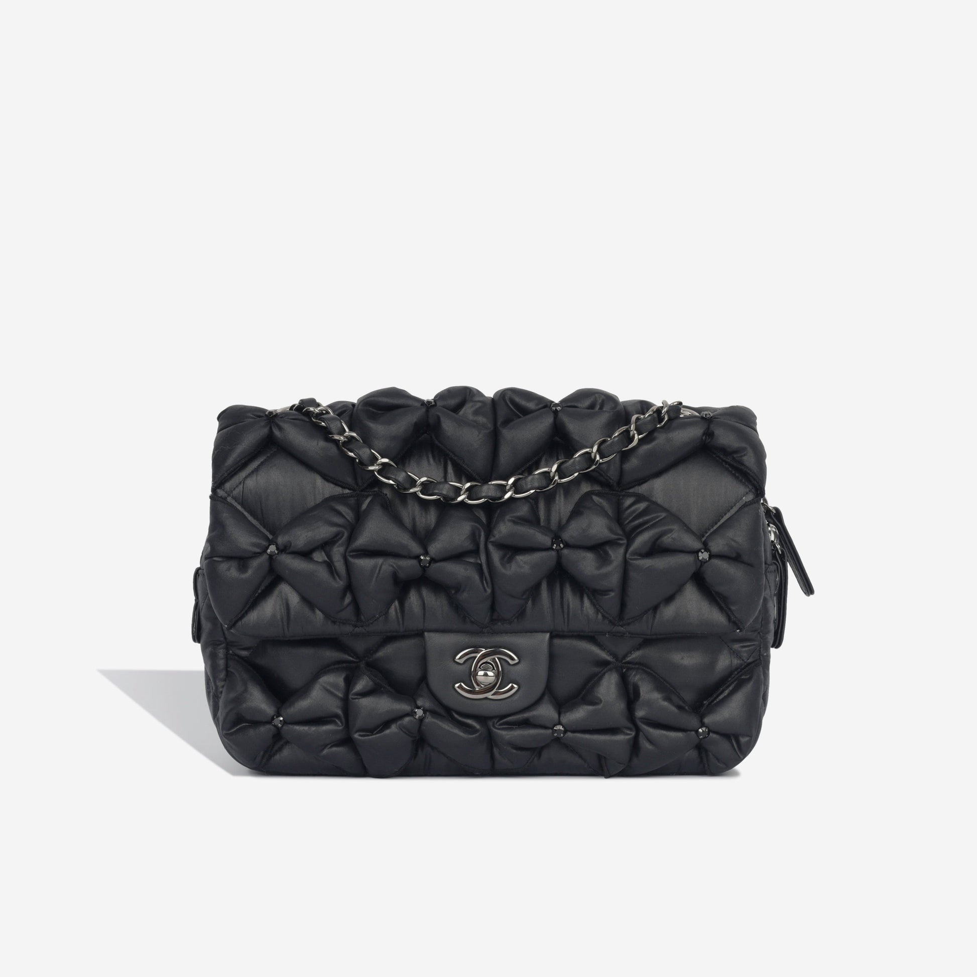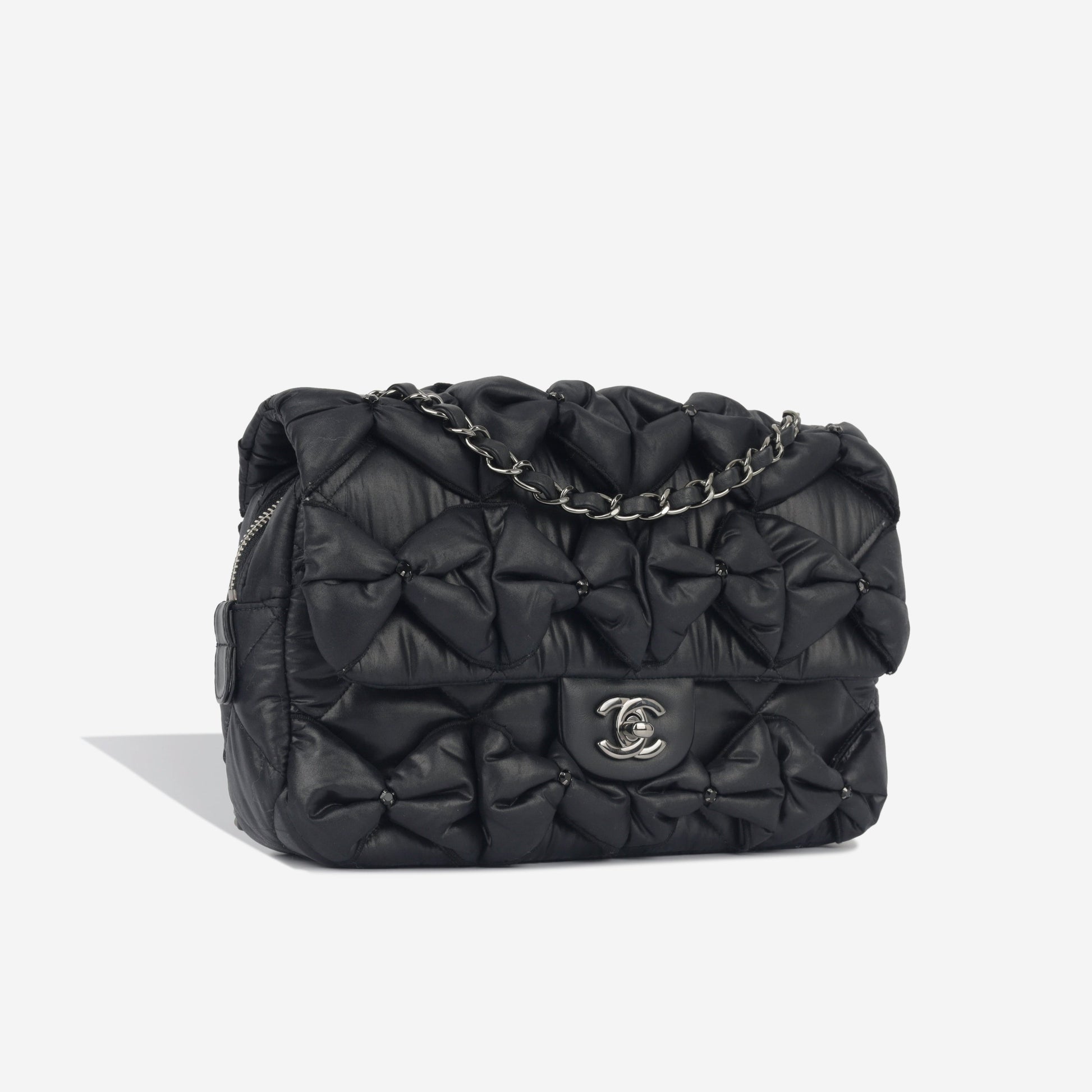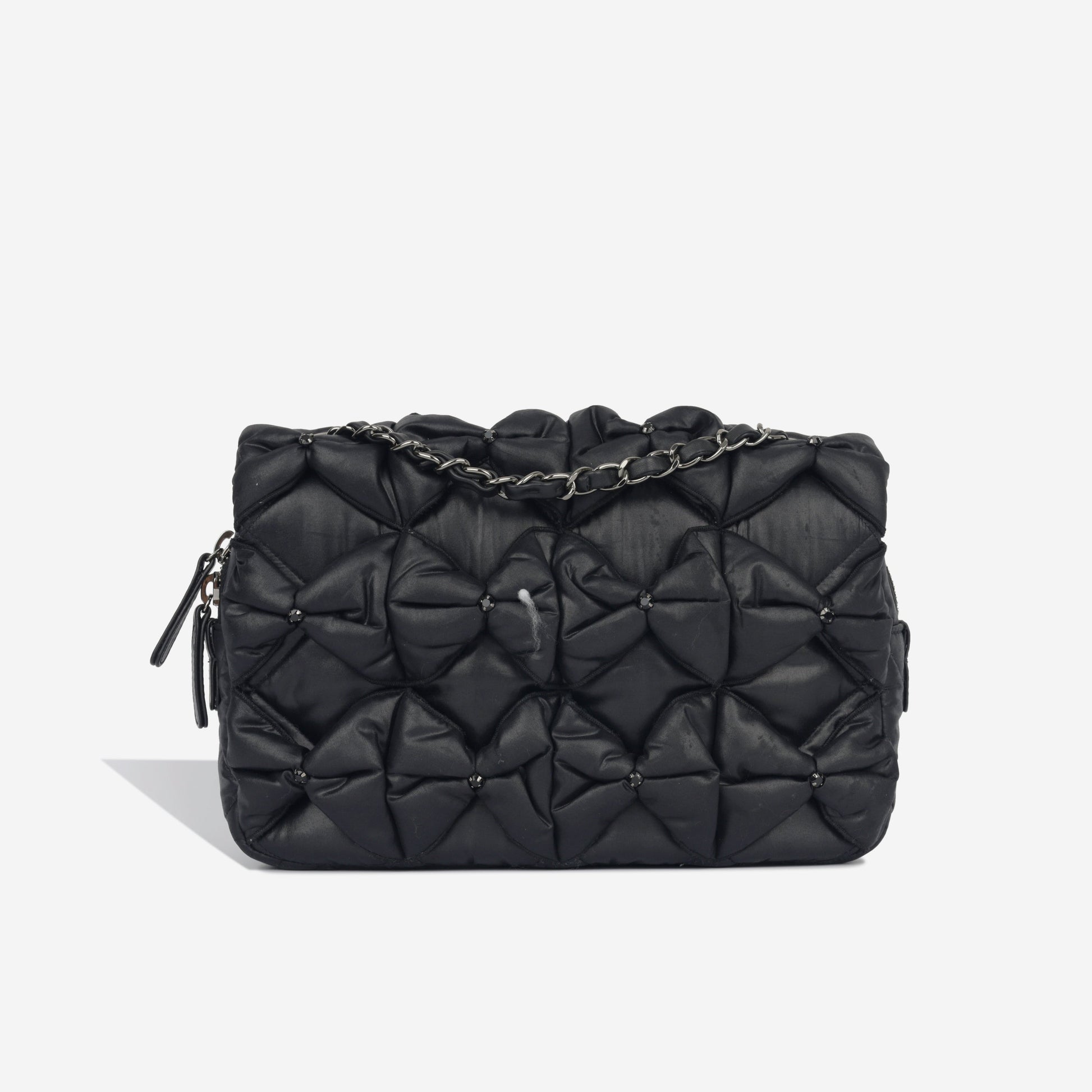 This unique seasonal fabric flap bag from Chanel is full of detail and texture. The draped fabric is collected together into bows and accented with crystal embellishment to formulate a truly statement piece. The combination of black nylon and gunmetal hardware makes this a perfect evening choice to take to your next dinner. Large enough to fit all your necessary belongings, this bag will look after you wherever you go.