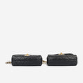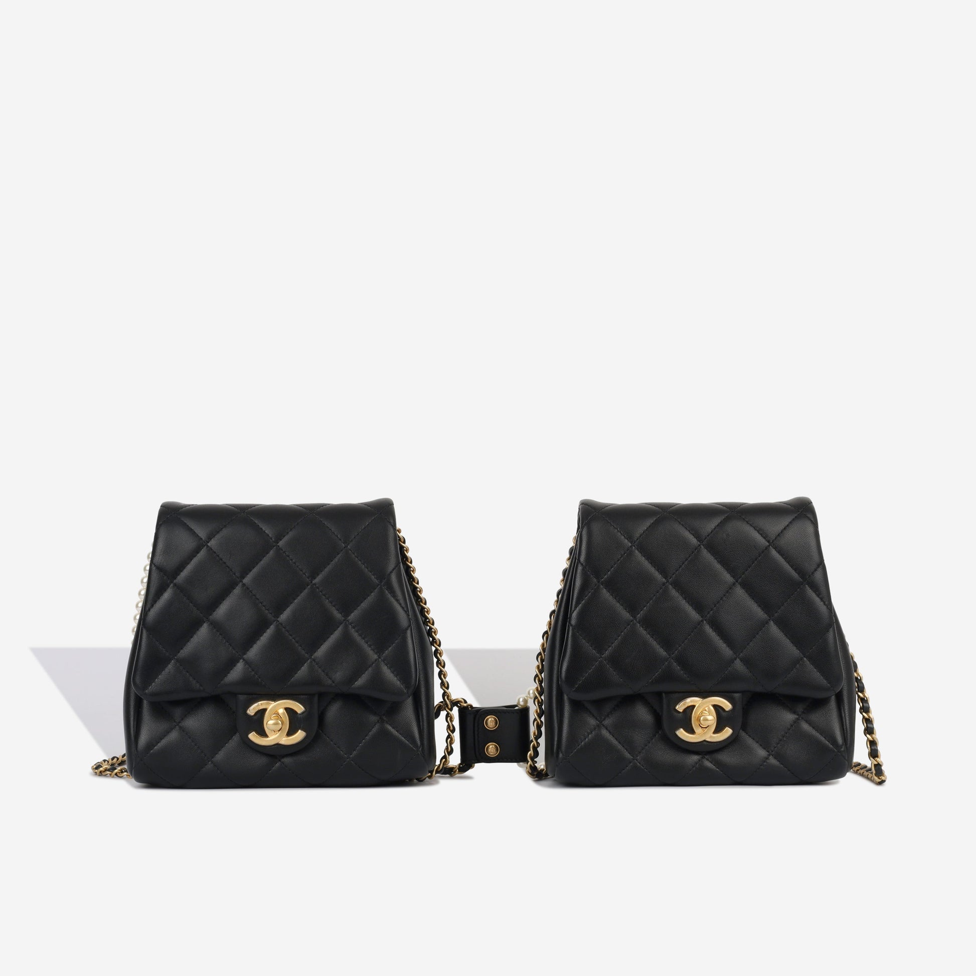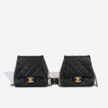 This unique flap bag set from Chanel is designed to be worn in duo crossing over each hip. The hardware emblem sits in the centre of the body to connect them. Both bags are conjoined and designed identically like twins. Created using black lambskin leather and champagne gold hardware, this bag remains iconic to the brand with these elements.