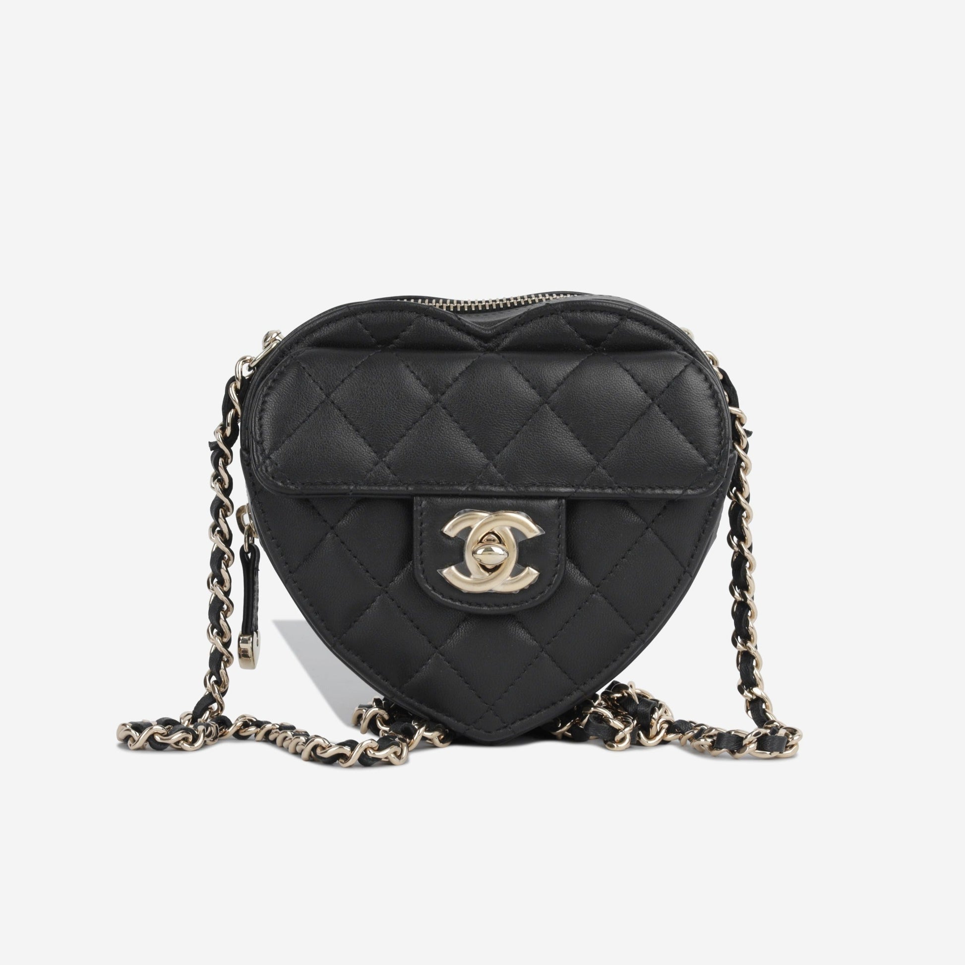 The Chanel Heart Bag is still sought after and we've got it here at Prestige Totes. Sold in a range of sizes and colour options, this is a modern and romantic piece to add to your winter wardrobe. Crafted from classic black lambskin and romantic champagne gold hardware, this bag will compliment all of your outfits.