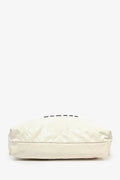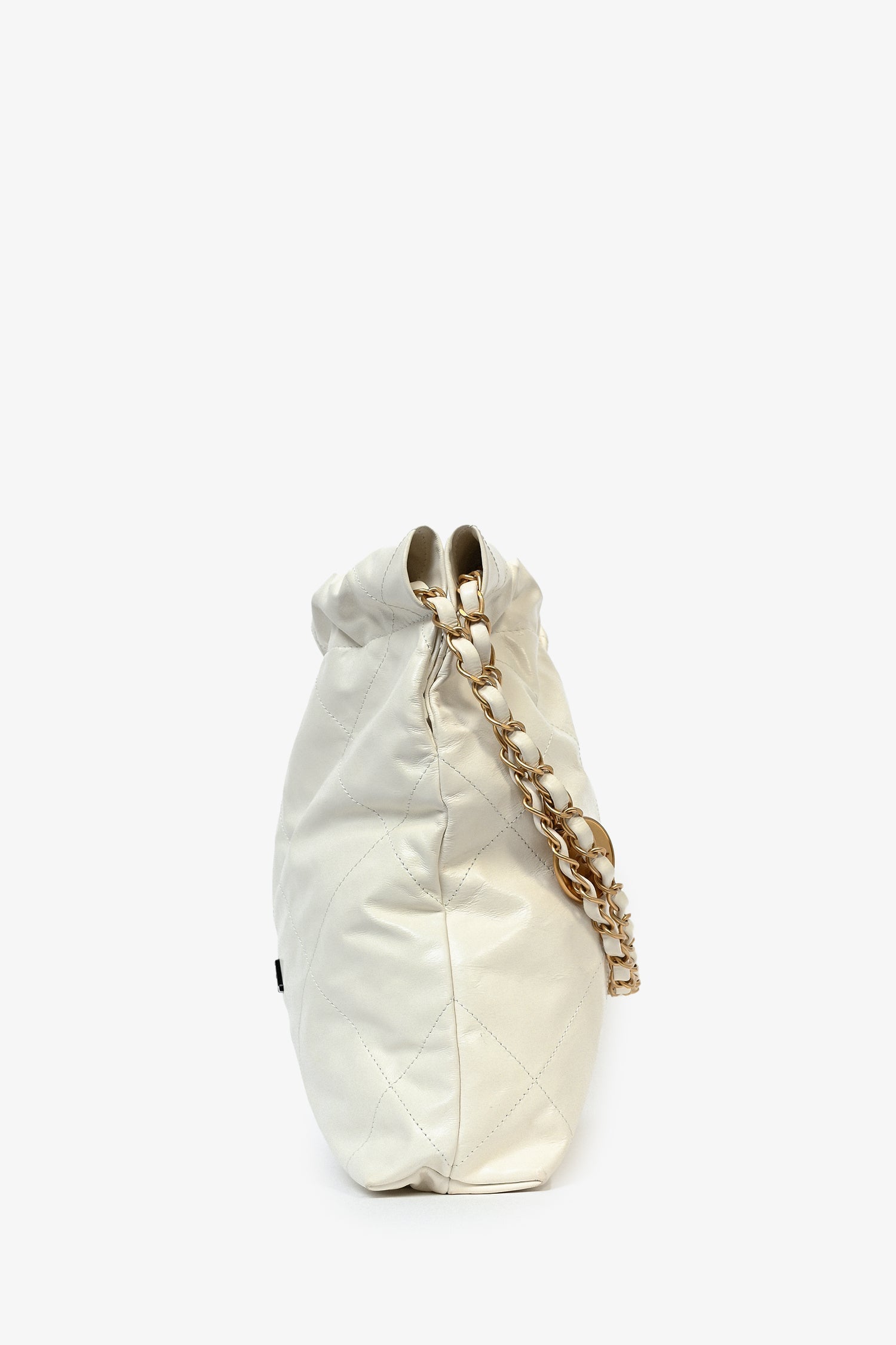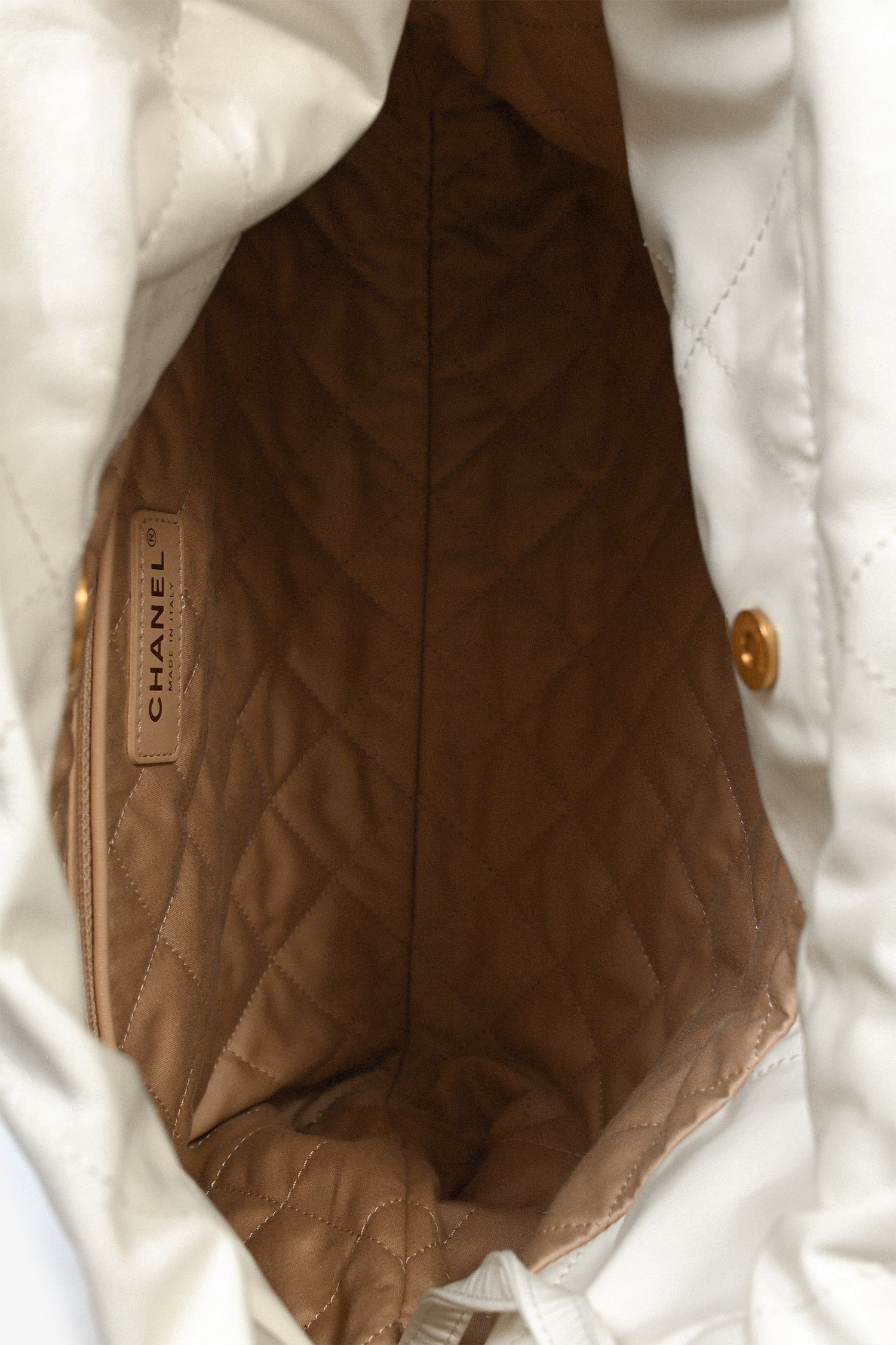 Pre-Loved Chanel™ White Leather Small Chanel 22 Shoulder Bag. Dual handles. Top magnetic closure. Snap button closure at each top rear. Open compartment with a wall pocket with zipper closure. Interior pouch with top zipper closure. Gold charm on strap. Lined. Gold-tone hardware. Tonal stitching.