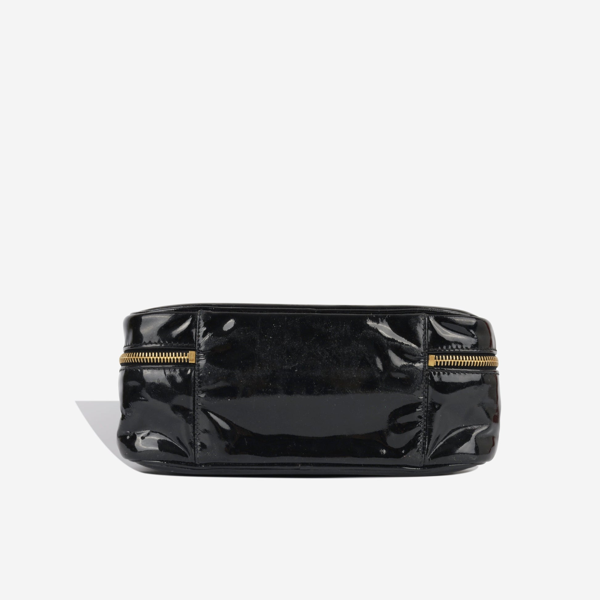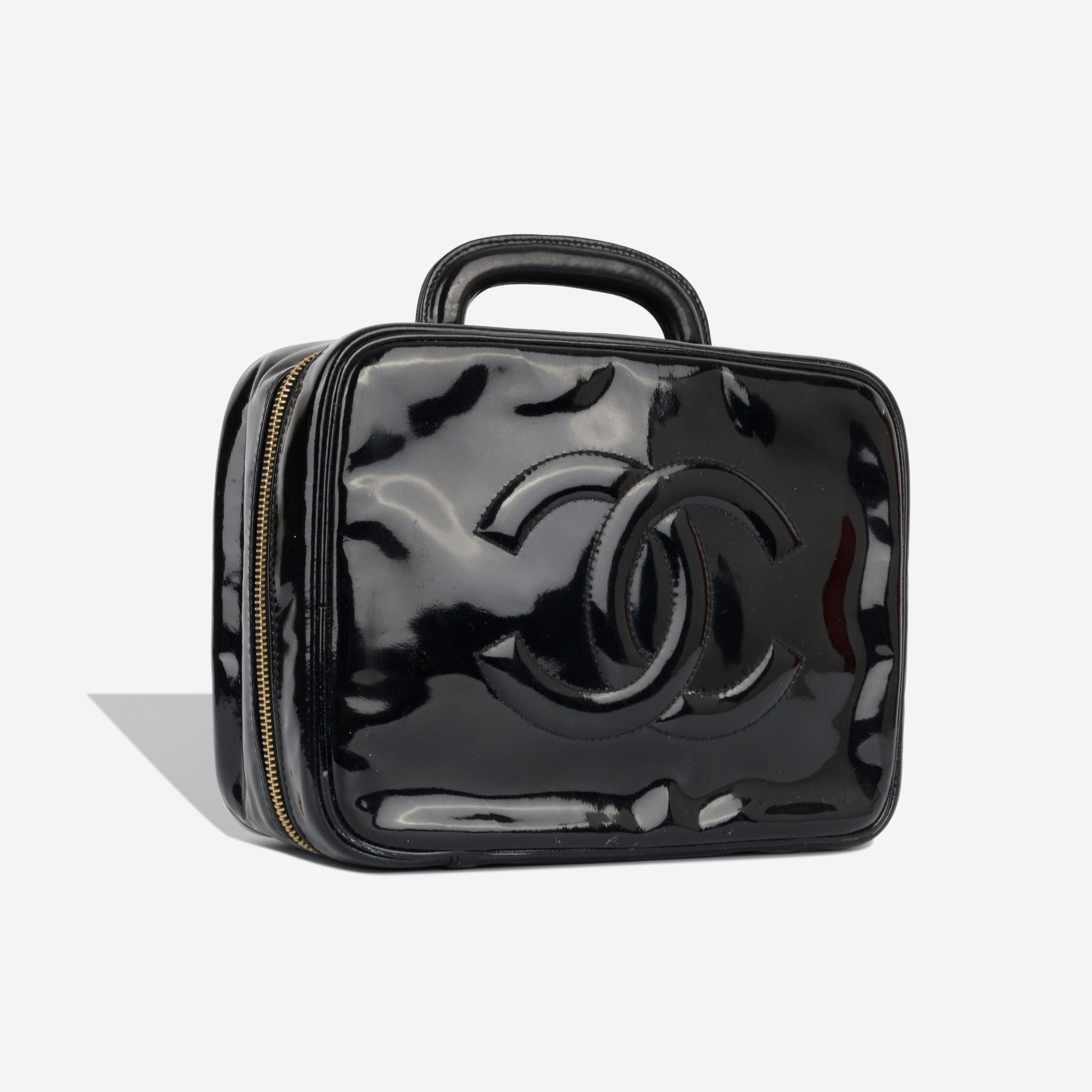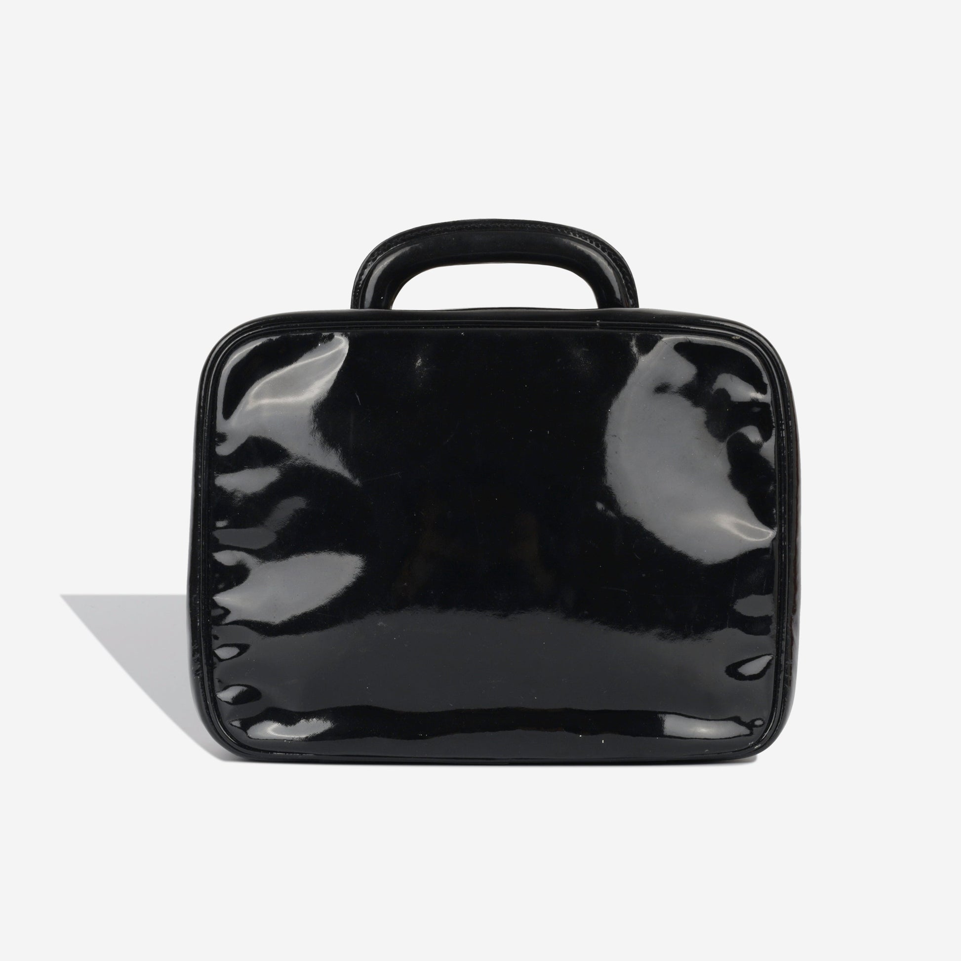 Here we present one of its highly sought and rare gems, the Chanel Vanity Case. Primarily developed for storing your makeup and other small necessities, the vanity case has come a rather long way since its birth; as is observable from the runways. This vanity case is presented in gorgeous black patent leather and features an embossed CC stitched logo alongside complimentary gold toned hardware.