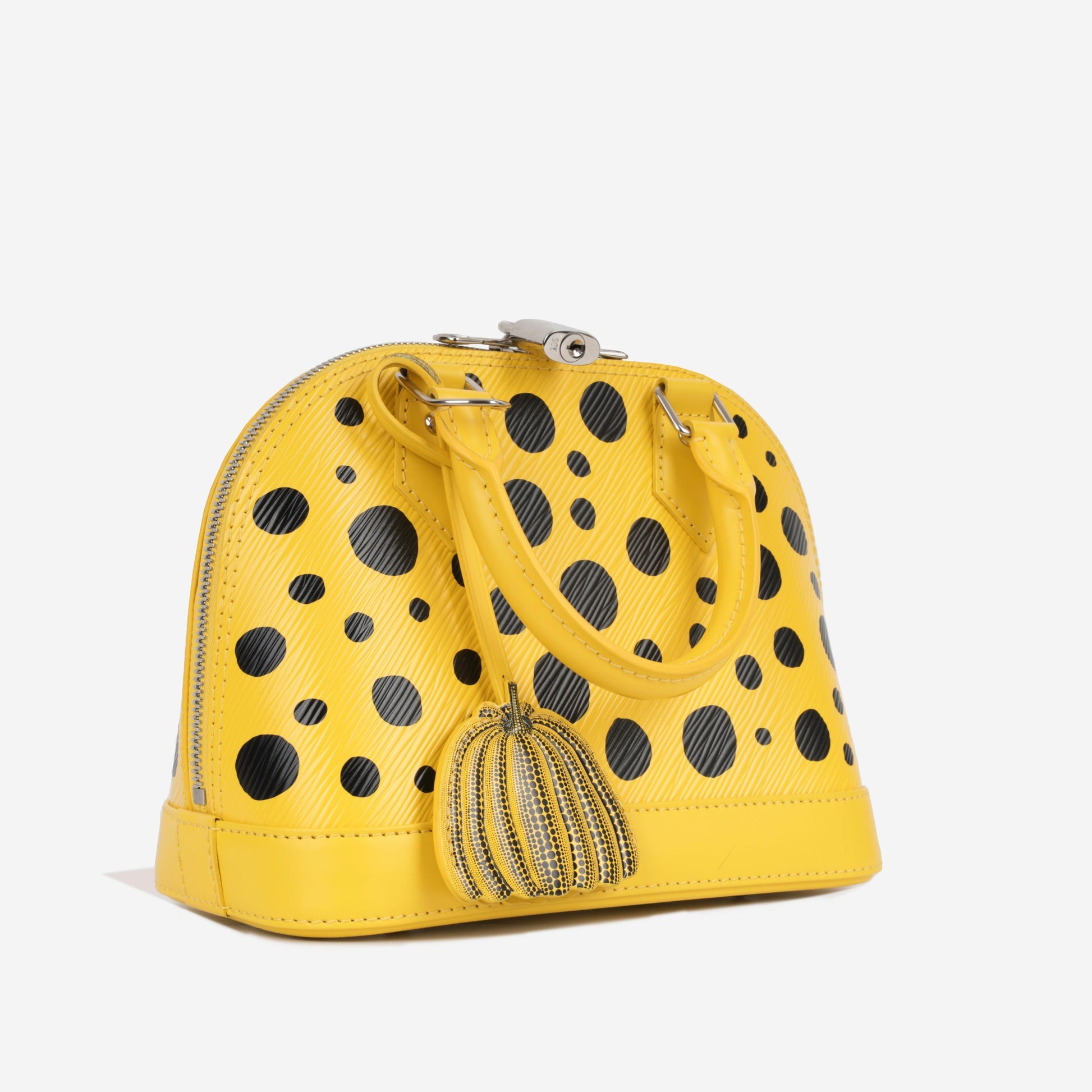 Part of the 2023 recent Louis Vuitton X Yayoi Kusama Collection, the Alma BB is an artsy update of a classic piece. It presents the renowned Japanese artist’s signature dotted print in a contrasting combination of yellow and black. Louis Vuitton describe it is a sophisticated multi step printing process to create a realistic painted affect.