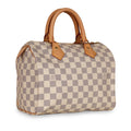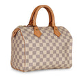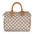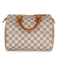Carefully crafted from LV's signature Damier Azur checkered canvas, the Speedy 25 is the ideal bag for any woman on the go. Although the Speedy is most common in sizes 30 and 35, the 25 is the perfect option for a petite woman. With a spacious interior, two top handles, and timeless silhouette - the Speedy is the ultimate go-to bag for running errands or accompanying you to lunch. Carry all your every day essentials inside the generous compartment while remaining stylish. The perfect compliment to light wash jeans and a basic tee, or culottes and a blouse. It's simple, easy, and a well-worthy addition to any luxury handbag collection.
