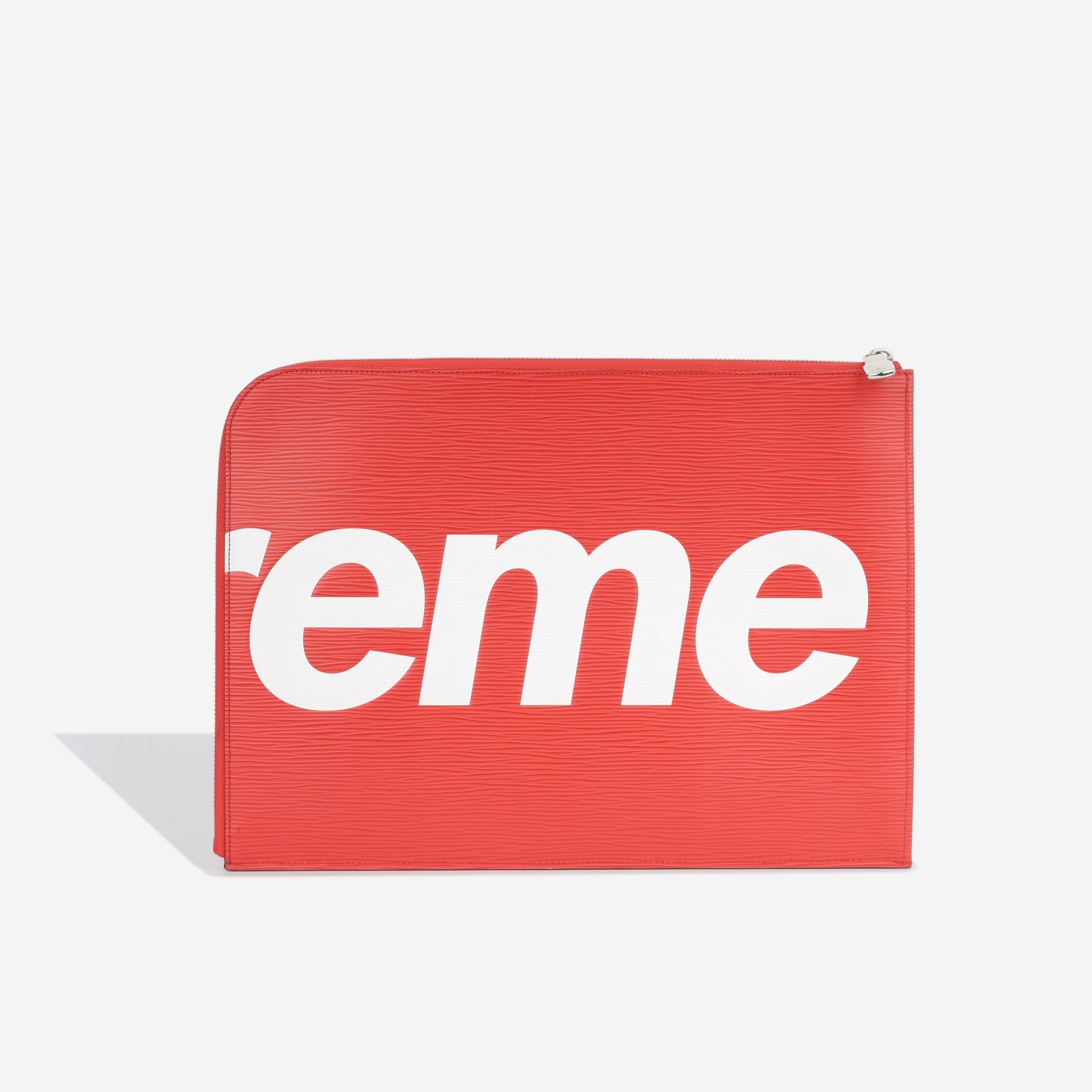 The perfect balance between fashion and function, Louis Vuitton and Supreme presents their limited edition Pochette Jour. Use this as a pouch or laptop case, you'll be sure to stand out wherever you go. Featuring Louis Vuitton’s Epi leather in bright red and a bold, enlarged Supreme logo. The Louis Vuitton and Supreme collaboration features a wide array of leather goods, debuted at Louis Vuittons 2017 menswear show in Paris. For the workaholic, it’s the perfect companion and a true must have for any individual on the go.