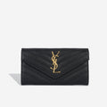 Crafted from black grained chevron leather, this card holder from Saint Laurent is a true must have. With the signature YSL logo in gold tone hardware, this piece is sleek, stylish and sophisticated. This card holder is the perfect piece to keep all your cards safe, in style. This little piece is a well worthy addition to any luxury handbag collection.