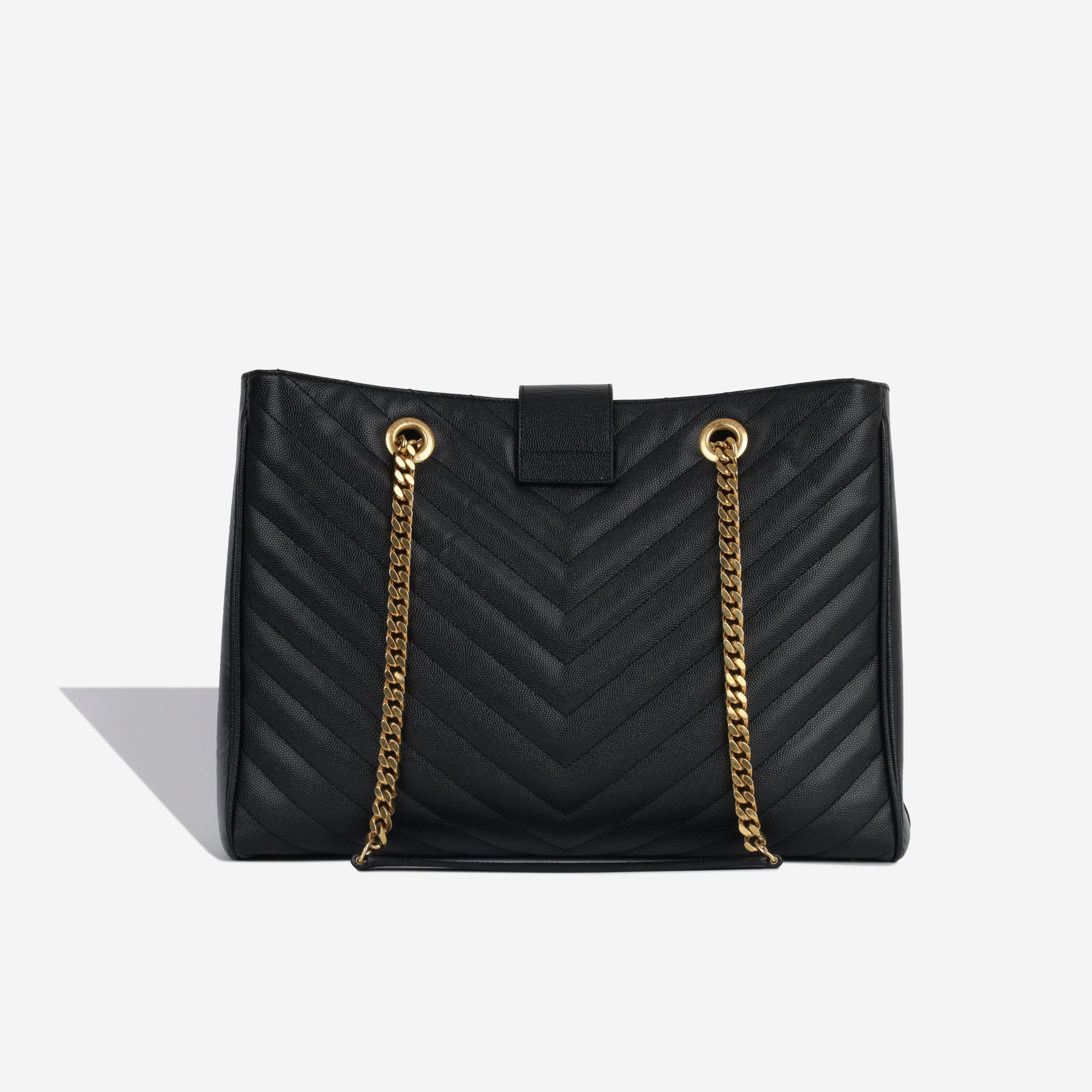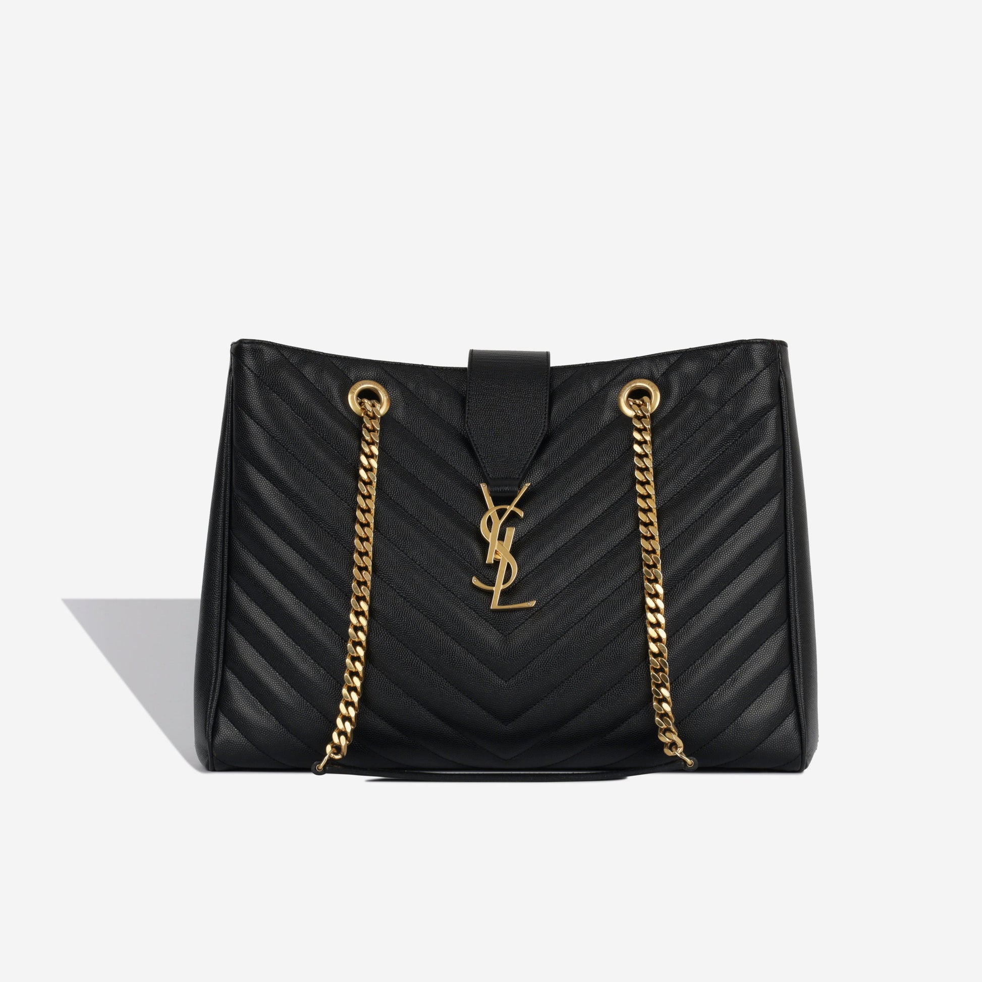 Carefully crafted from grained leather with a chevron design, the Cassandre shopper tote is the newest addition to the LouLou collection. Fans of this signature line can now carry their whole worlds with them everywhere they go by throwing whatever they may need throughout the day inside the spacious interior. With its classic, prominent YSL logo, this is a true must-have for any Saint Laurent lover.