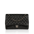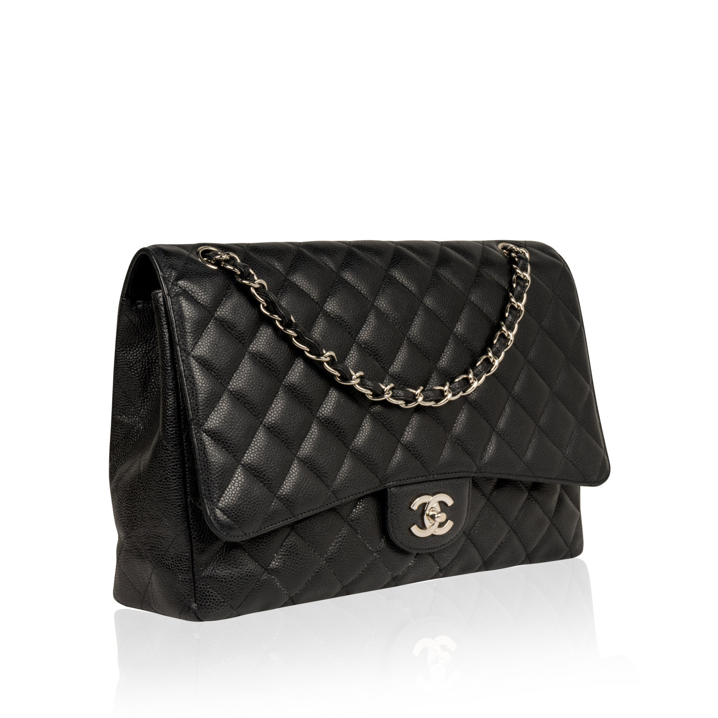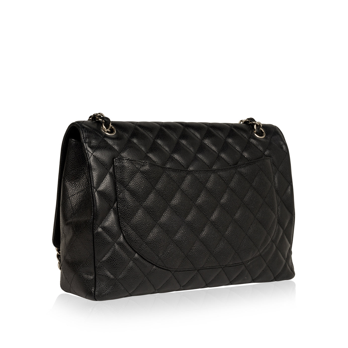 The Chanel Maxi Classic Flap is the largest of the Chanel classic flap family and by far and away the most practical if you're looking to use the bag throughout the day. This particular piece encompasses silver toned hardware contrasted against magnificent black caviar leather. Featuring Chanel’s iconic turn lock closure and palladium chain with braided leather, this Chanel handbag is of no doubt as chic as it is sophisticated. Its interior features matching leather and the coveted double flap.