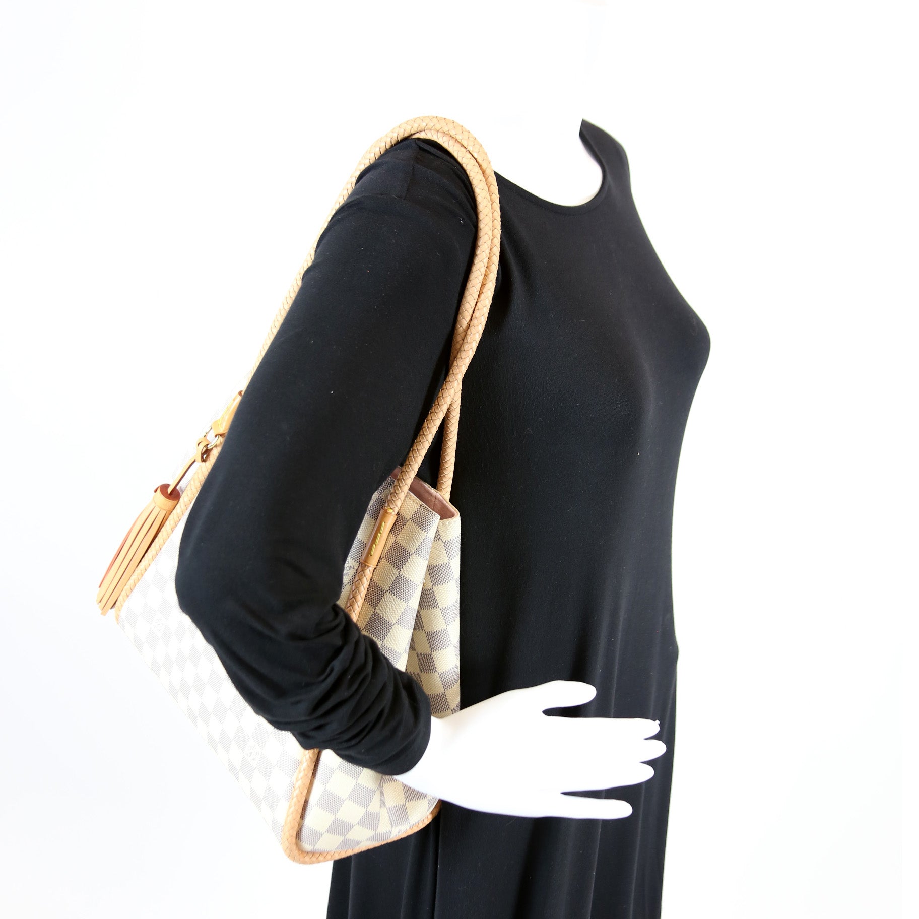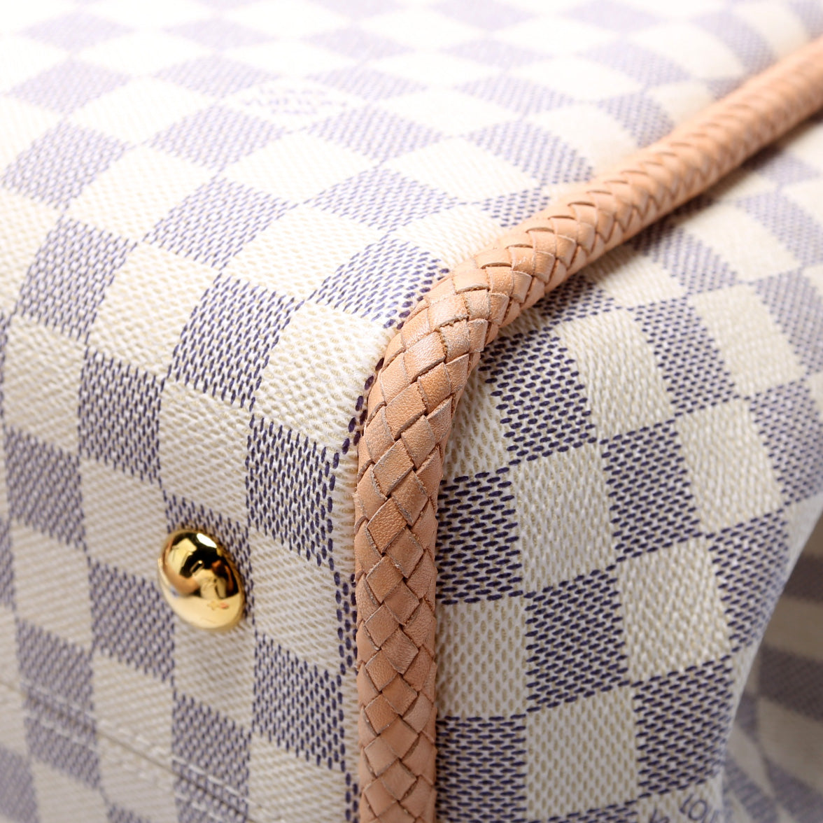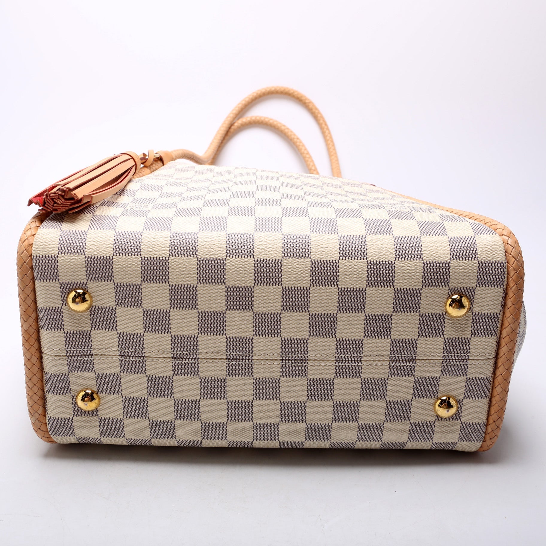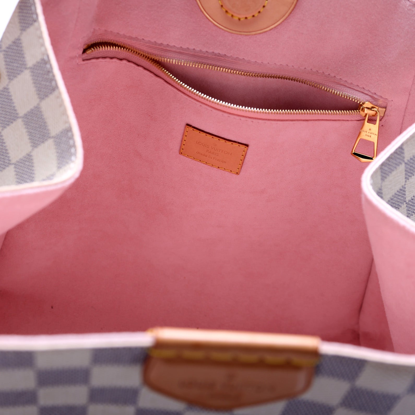 This Louis Vuitton Proprianois eye catching bag. The exterior is in the classic Louis Vuitton Damier Azur coated canvas.