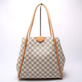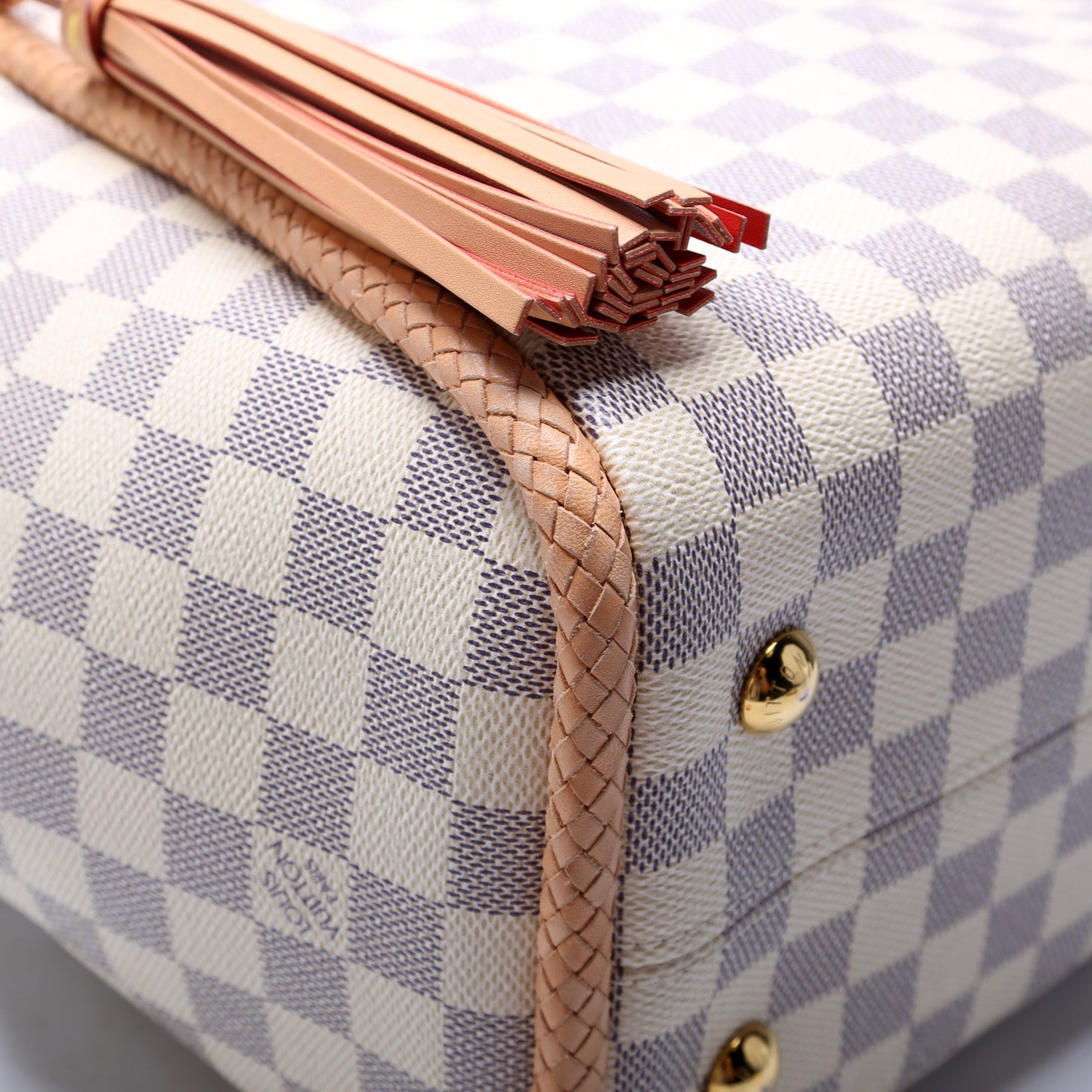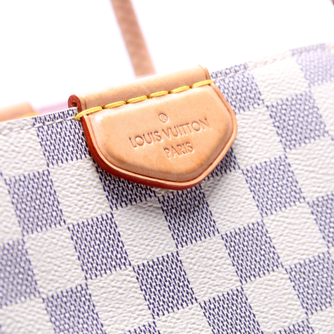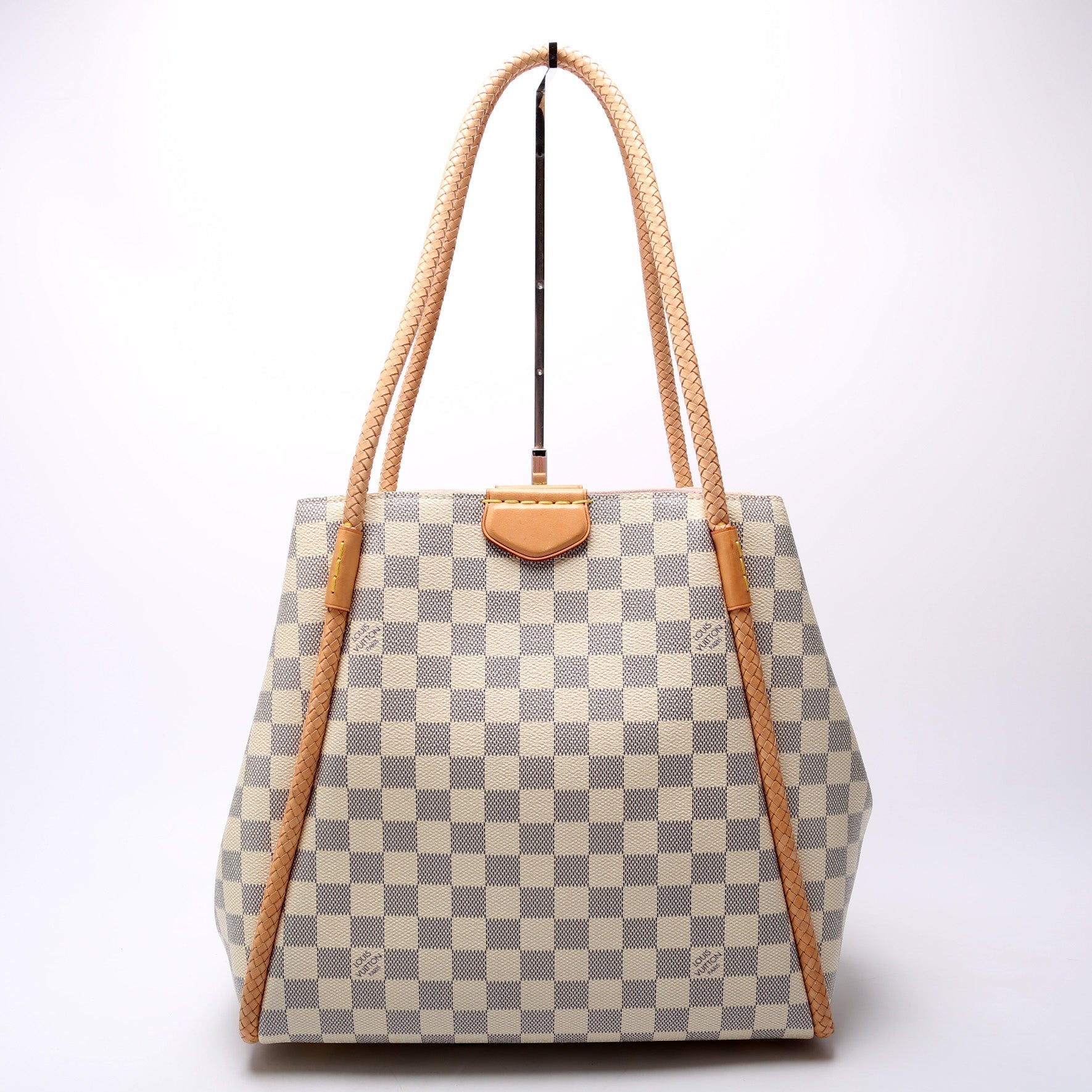 This Louis Vuitton Proprianois eye catching bag. The exterior is in the classic Louis Vuitton Damier Azur coated canvas.