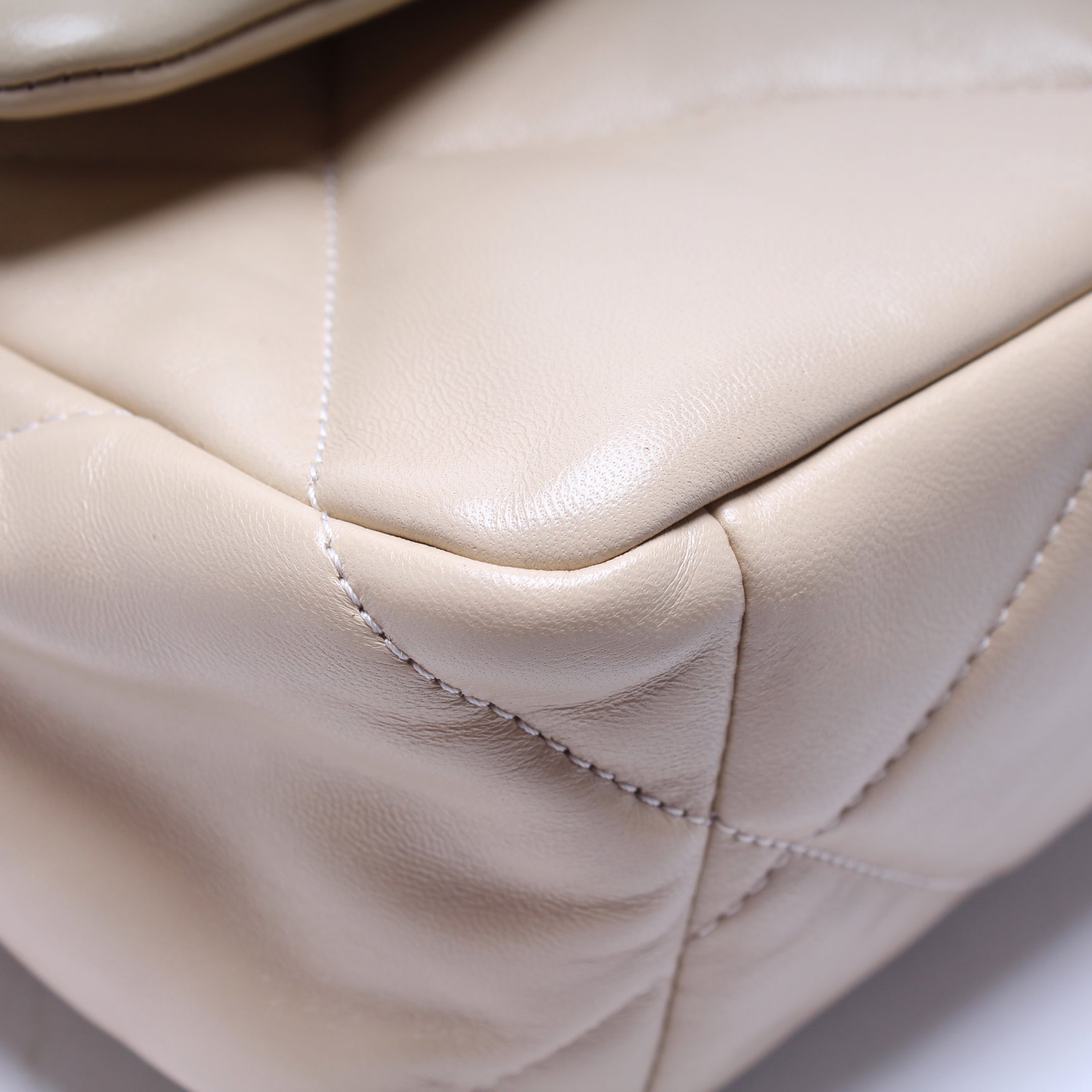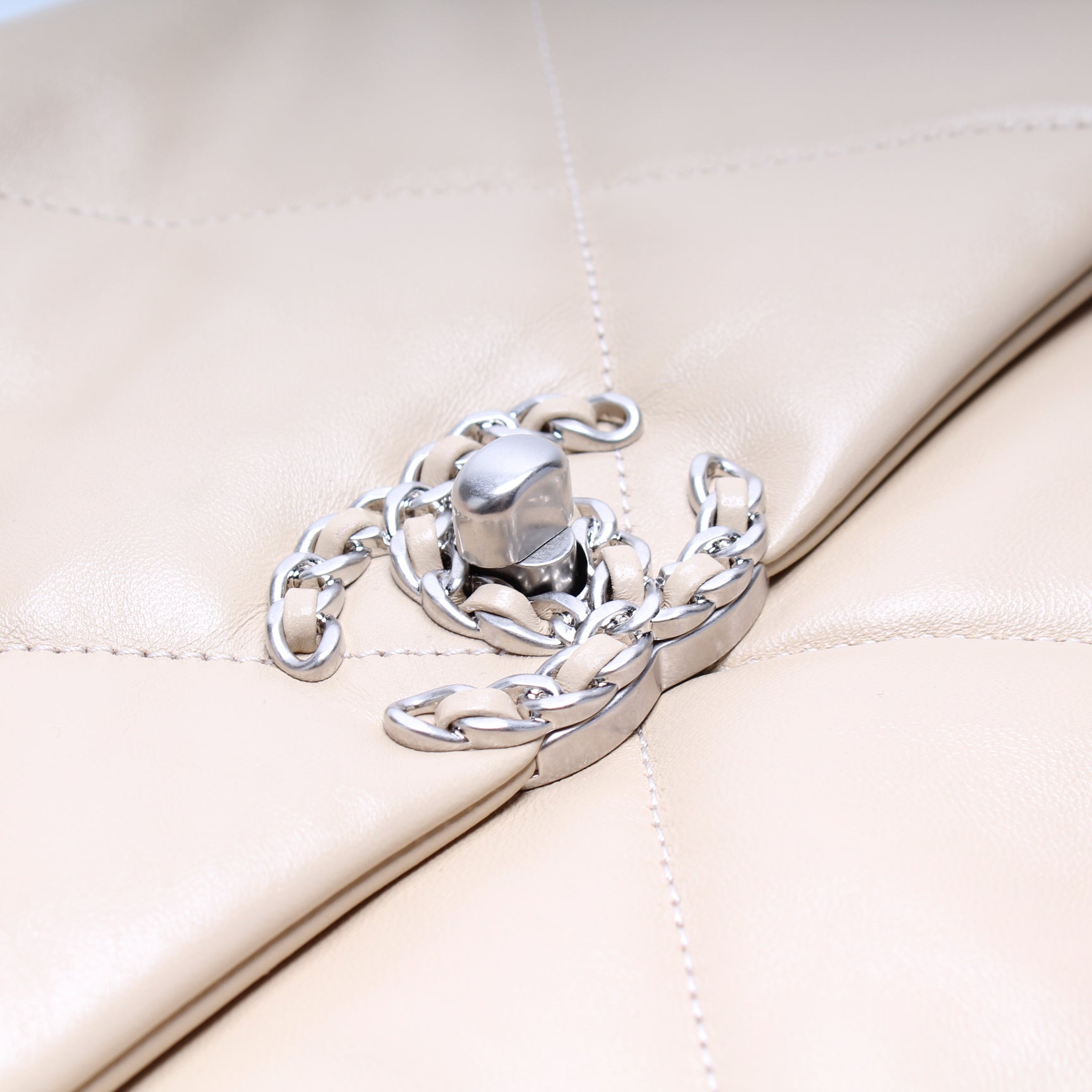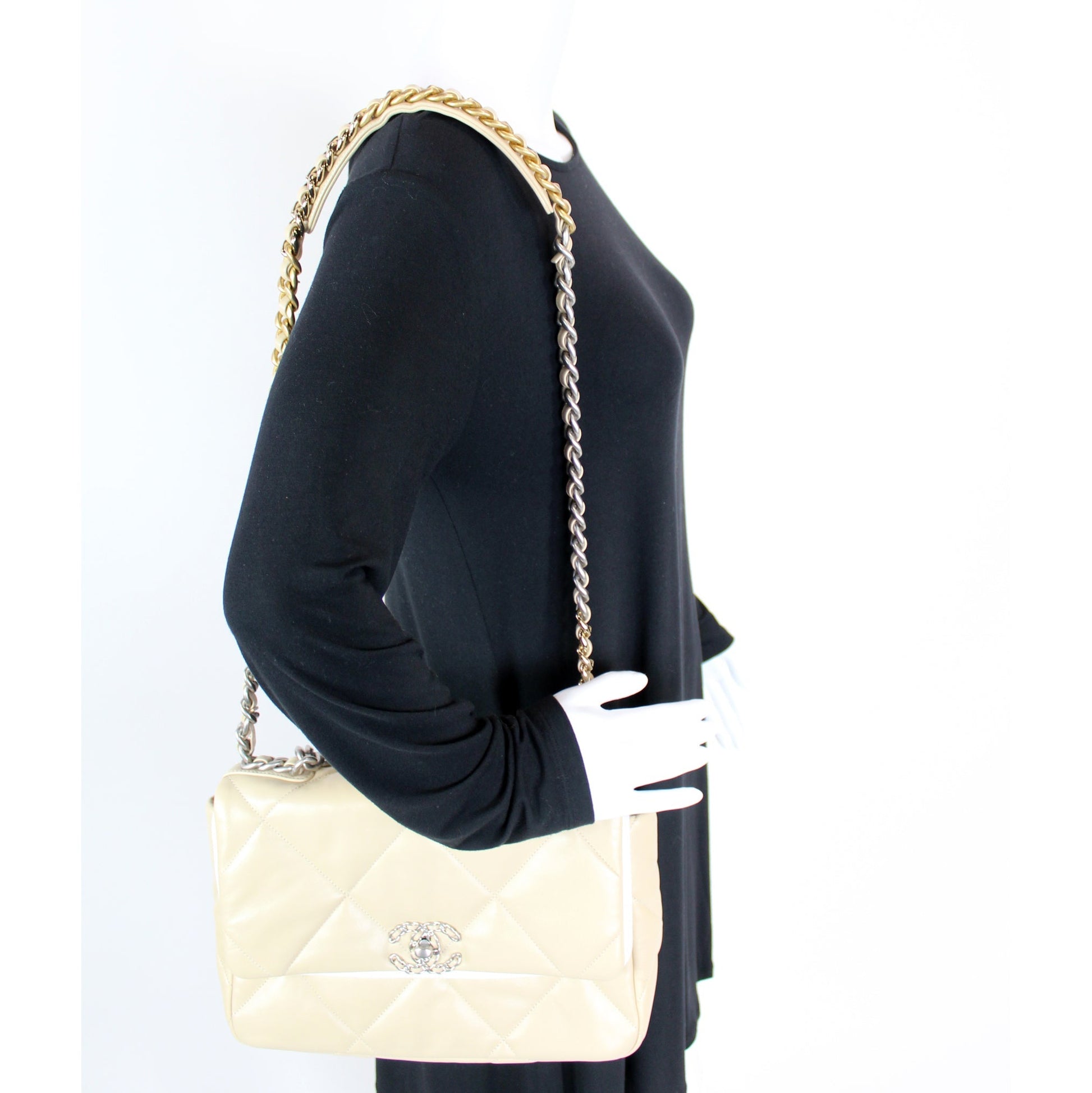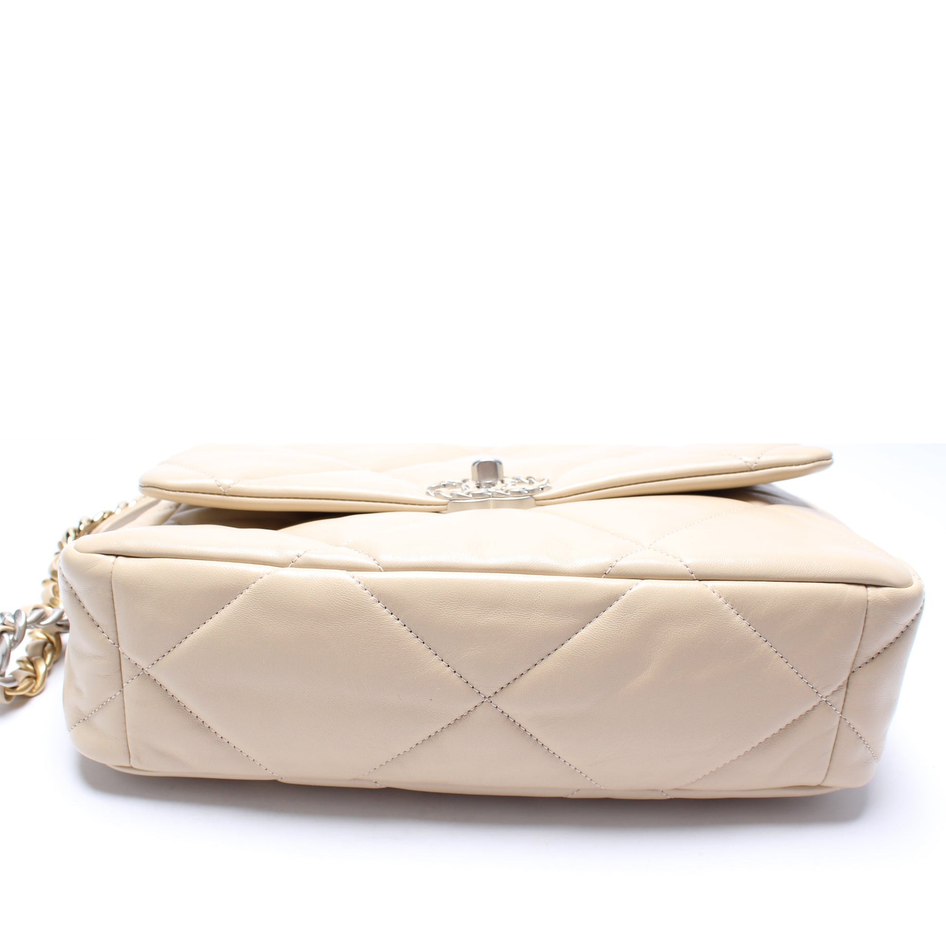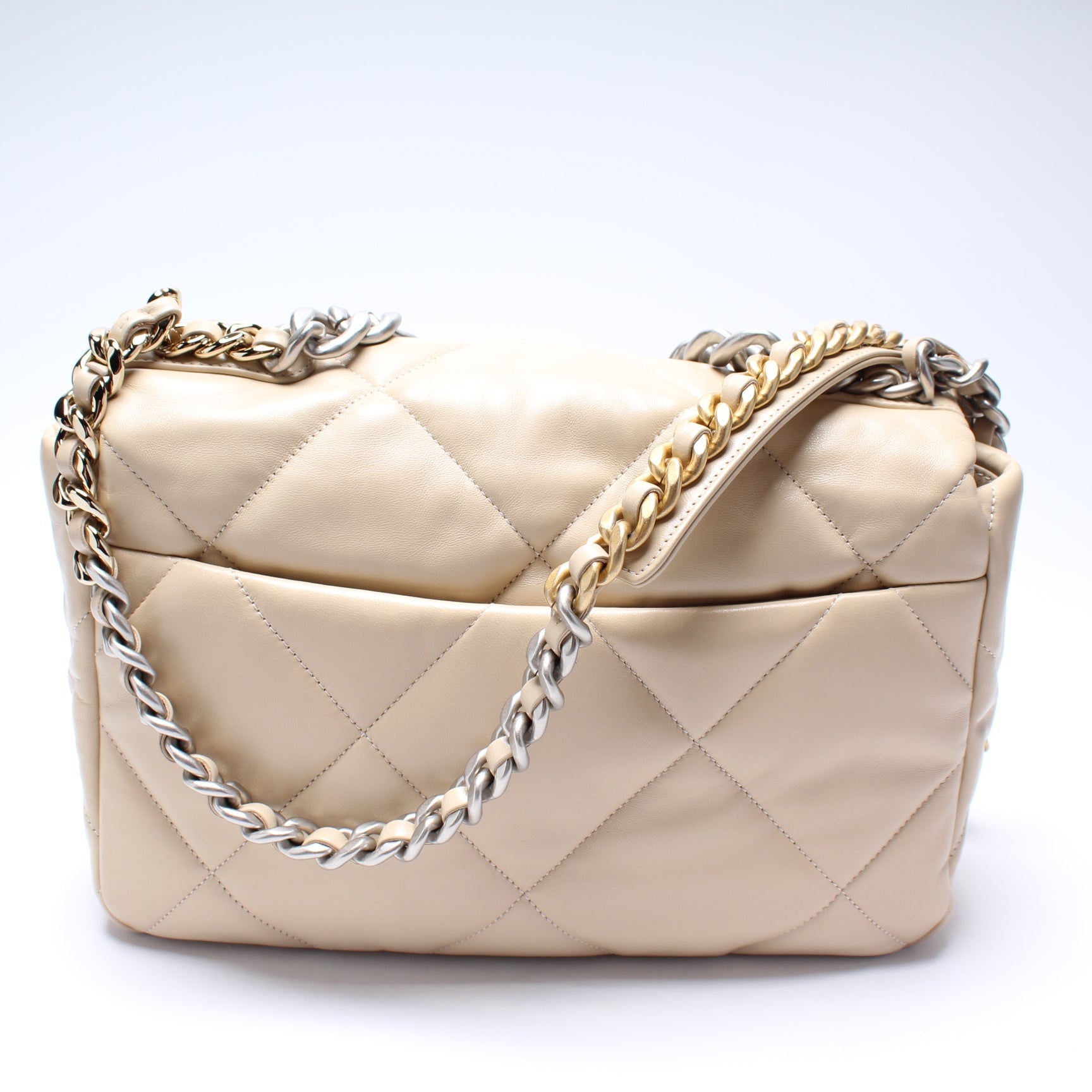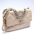This Chanel 19 Medium Flapis eye catching bag. The exterior is in the Chanel Quilted goatskin.