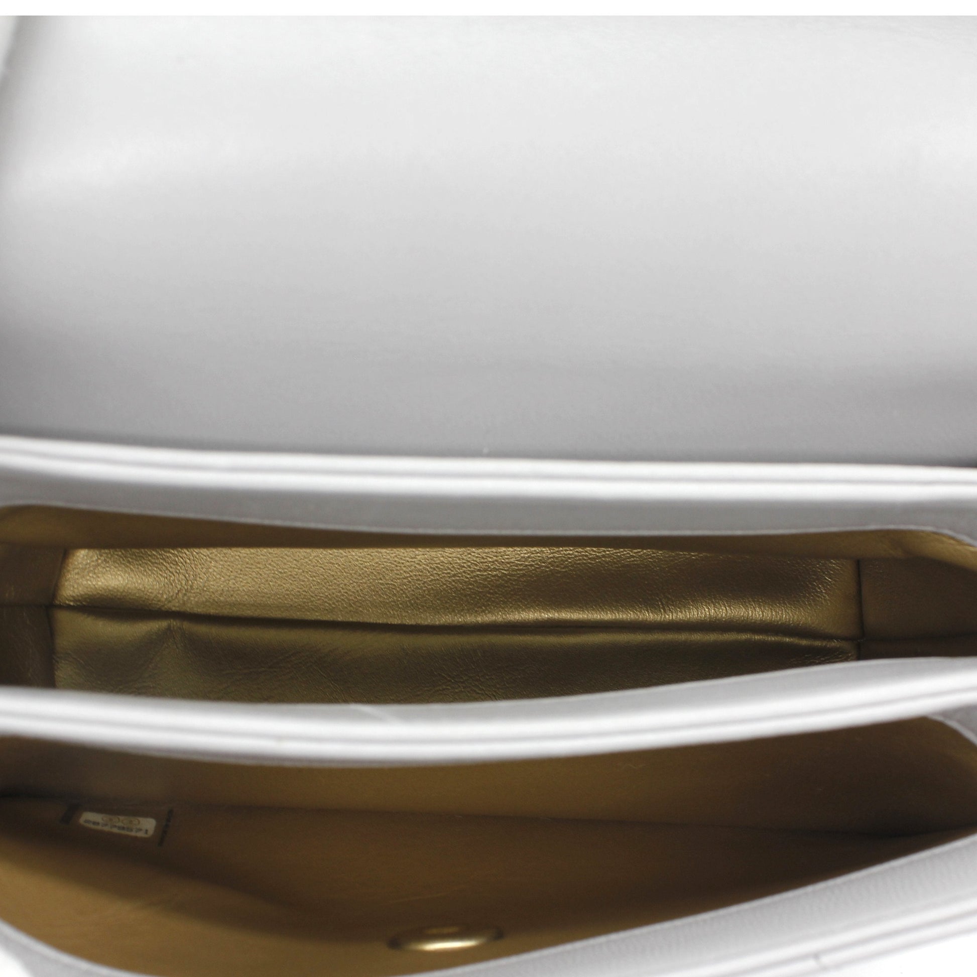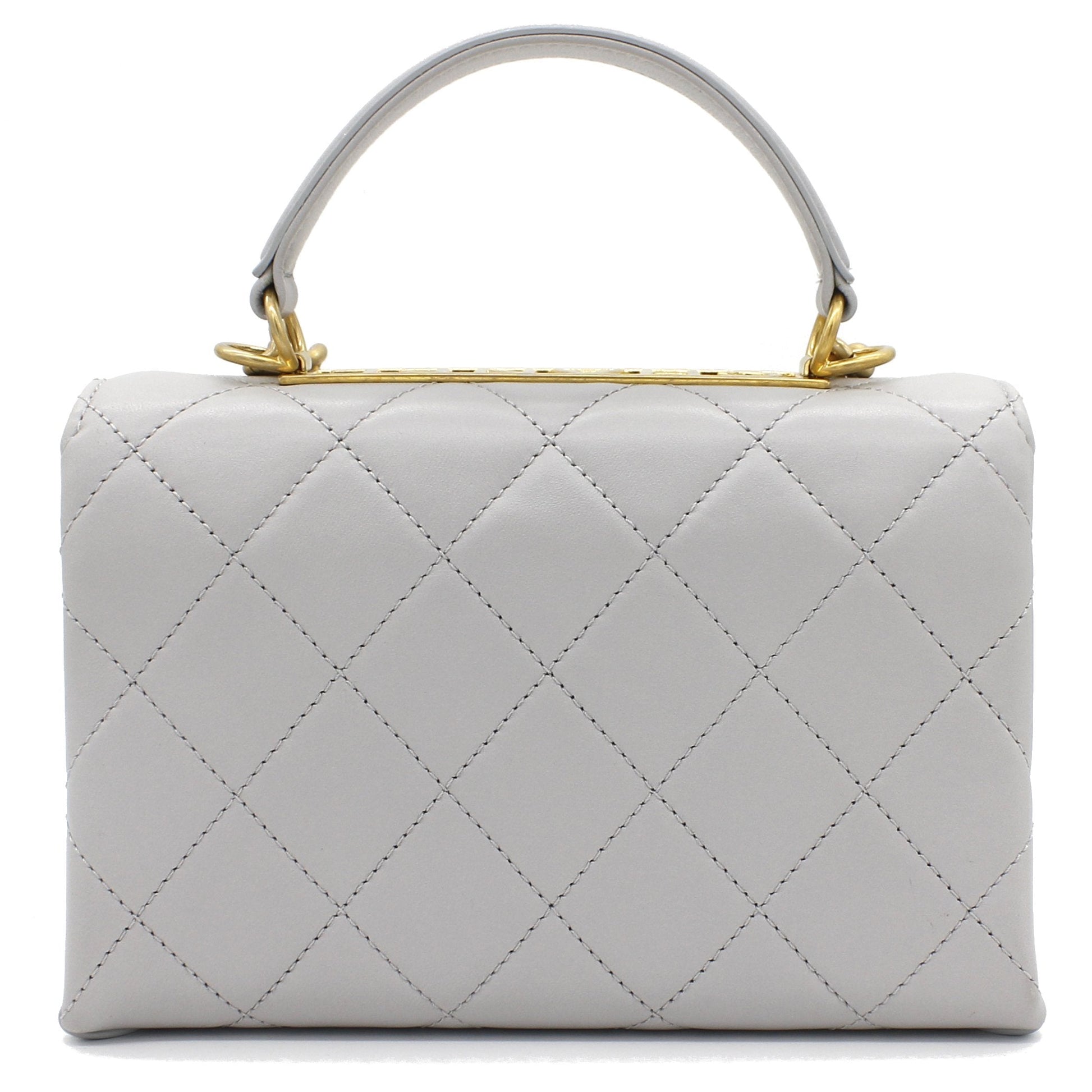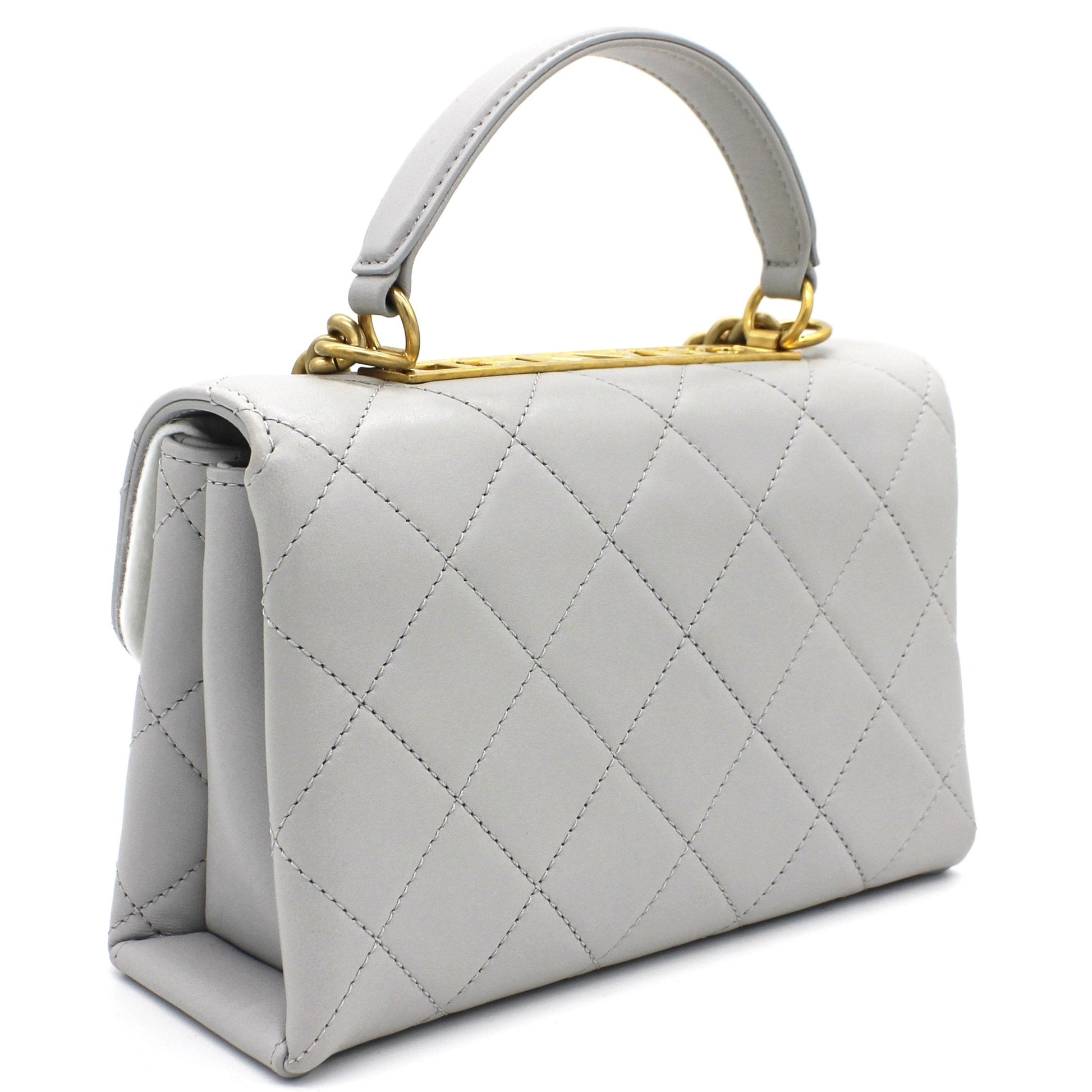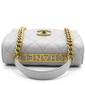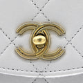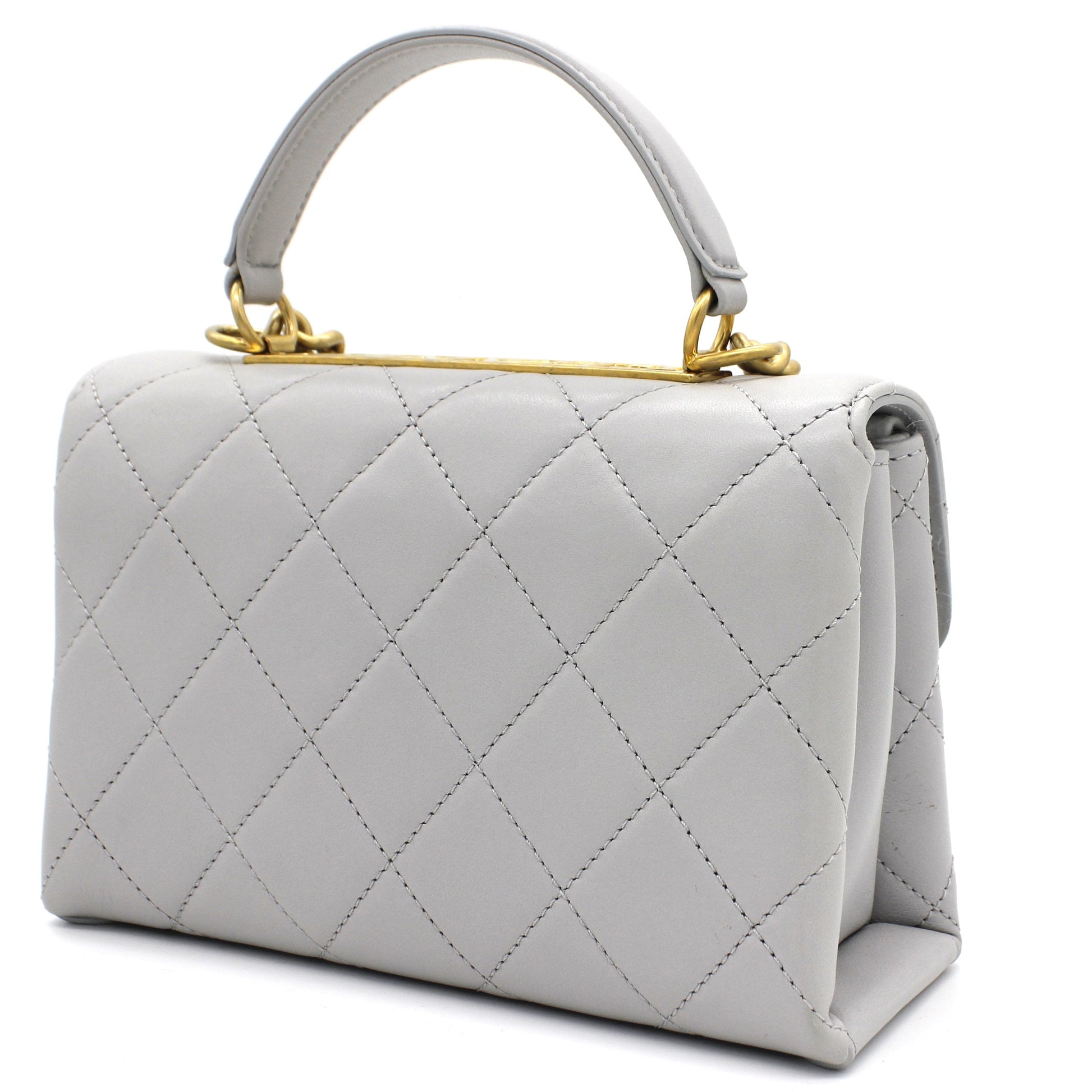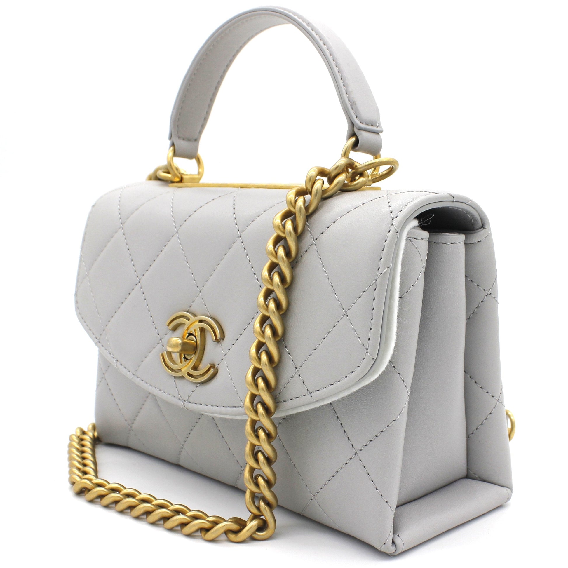 | This stylish yet practical Flap bag from Chanel is a fabulous everyday bag! Featuring gorgeous quilted lambskin leather and gorgeous shiny goldtone hardware, this bag can be carried on the arm or shoulder. It features a metal Chanel plate at the top and closes with a shiny CC turnlock. This bag is one you'll love to keep in your collection for years to come! | Exterior Material: White grey quilted lambskin with top handle comes with gold-tone hardware, single flat top handle, single chain-link shoulder strap with shoulder guard, logo hardware embellishment at top. Interior Material: Gold leather lining with dual compartments and CC turn-lock closure at front flap. Accessories: Receipt; Card; Dust Bag; Box Serial Number: 28779571 Bought Year: 2019 | ![]() |