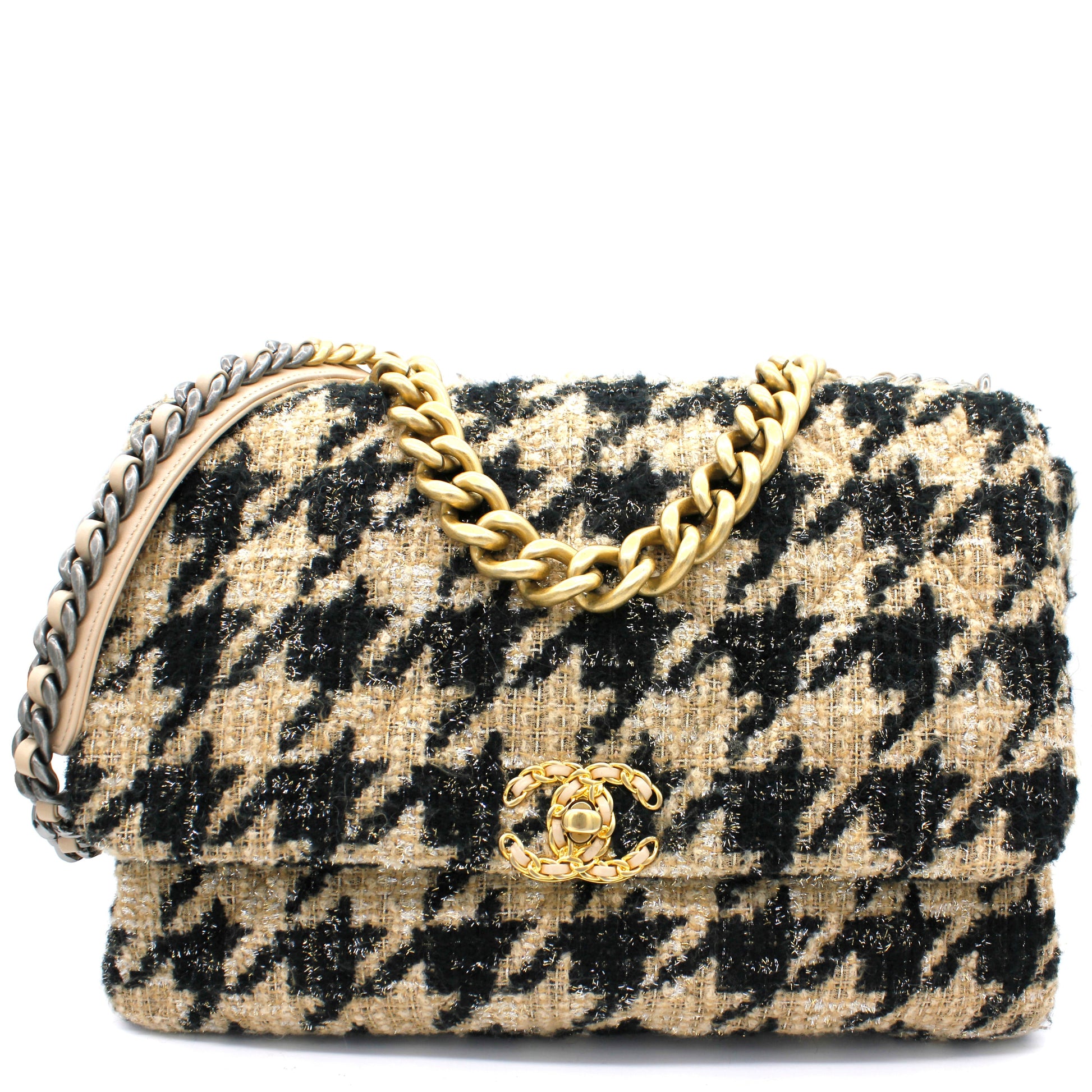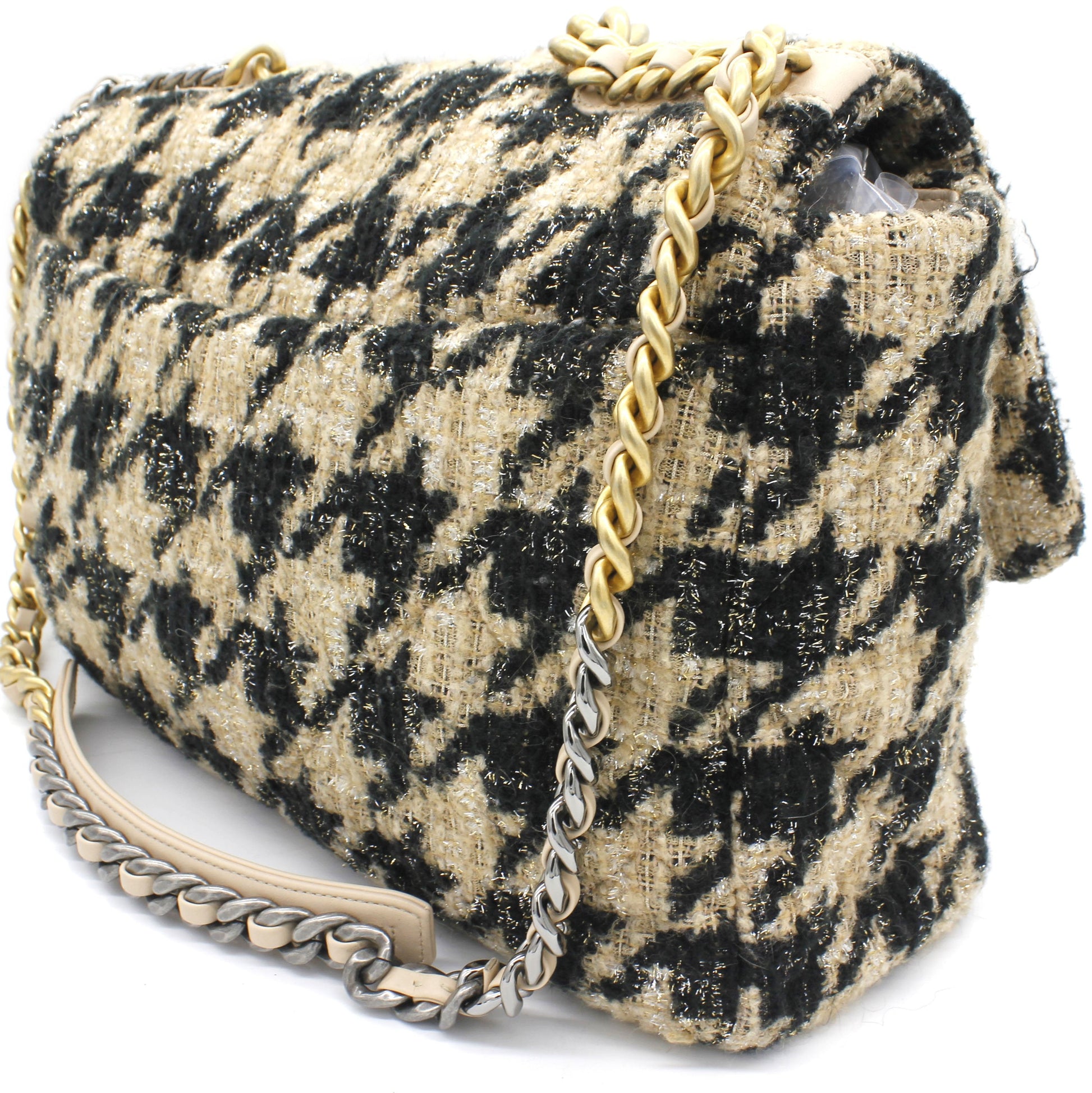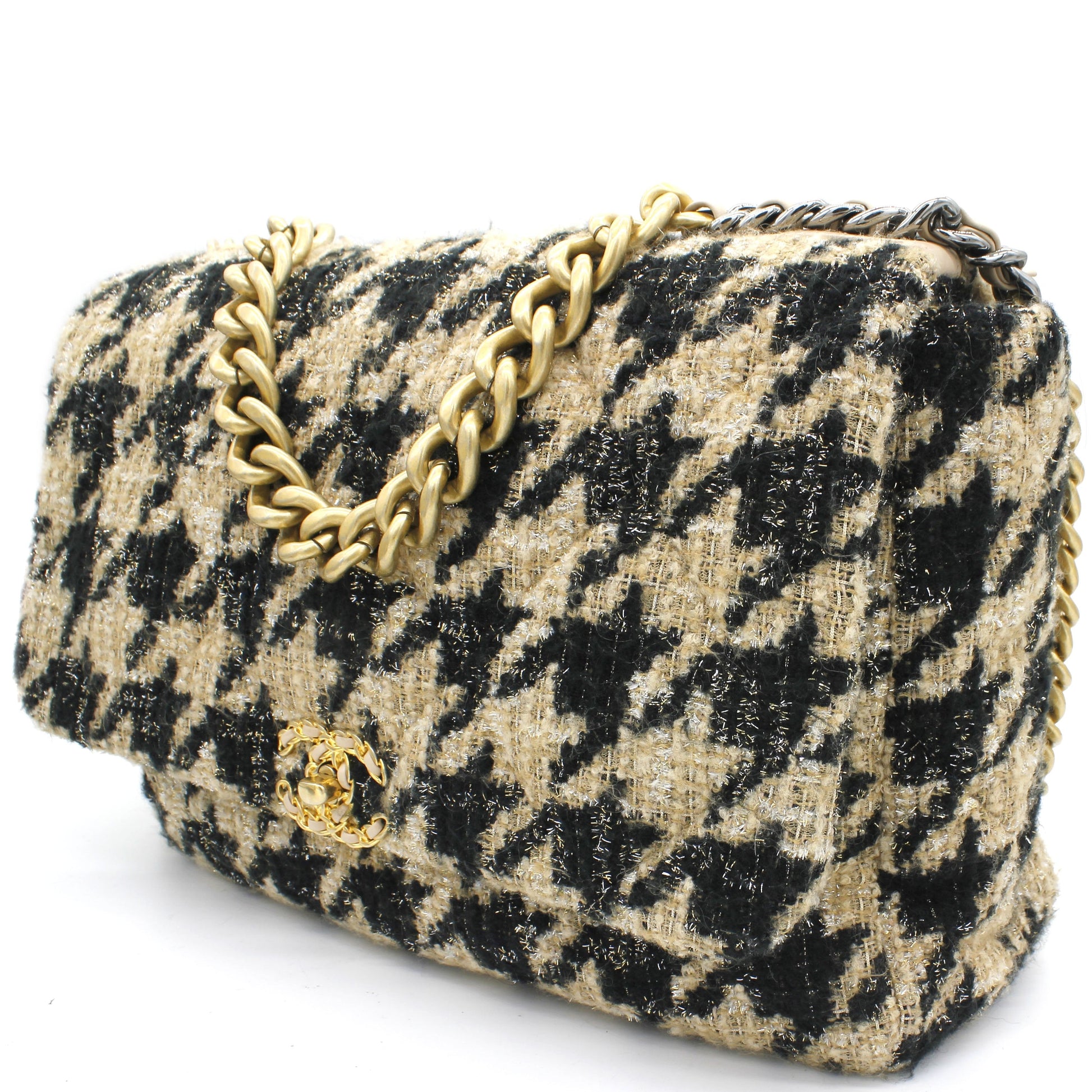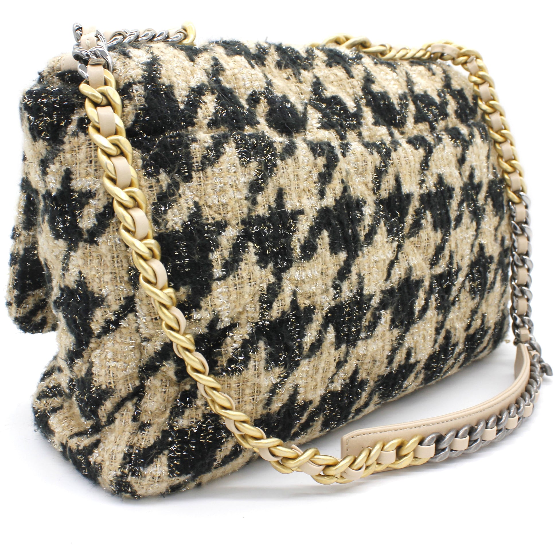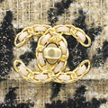 | This pillowy soft shoulder bag is crafted of oversized Brown,Black and white tweed . The refined bag features a chain detail CC turn lock on the flap, a magnetic snap pocket at the rear, and a leather threaded aged gold, ruthenium, and dark silver chain link shoulder strap with a leather shoulder pad. The front flap opens to a beige fabric interior with a zipper pocket. | Exterior Material: ?Brown,Black and white tweed exterior with a chain detail CC turn lock, a leather threaded chain link shoulder strap and a chain handle strap. Interior Material: Beige fabric lining with one main compartment and one zipped pocket. Accessories: FULL SET: Receipt; Card; Dust Bag; Box Bought Year: 2019 | ![]() |