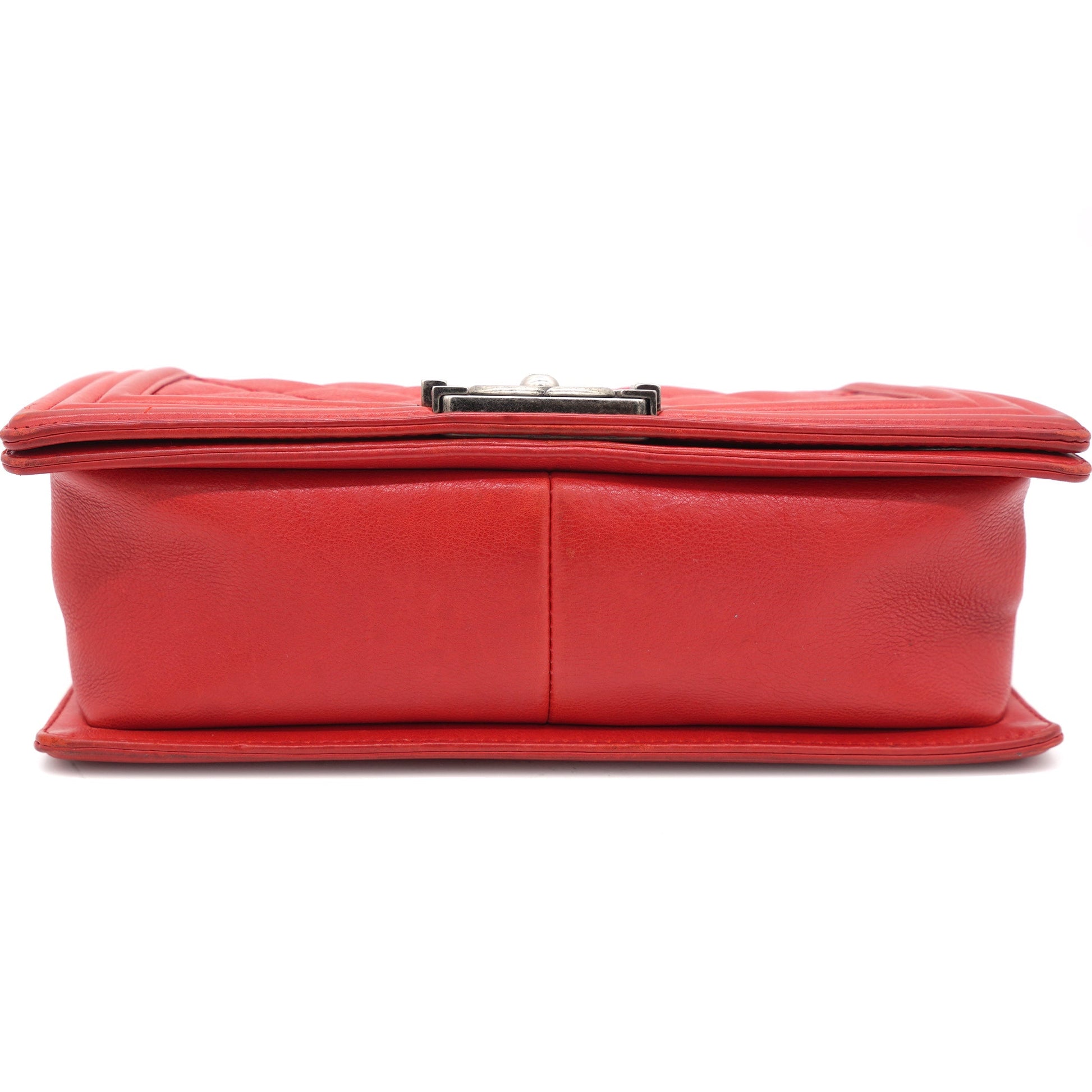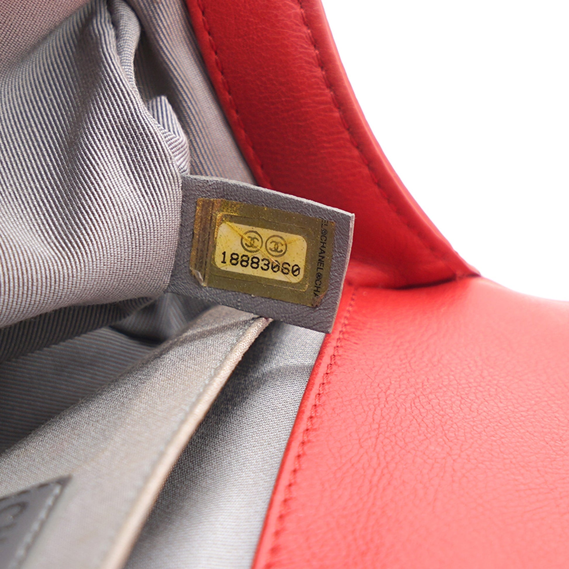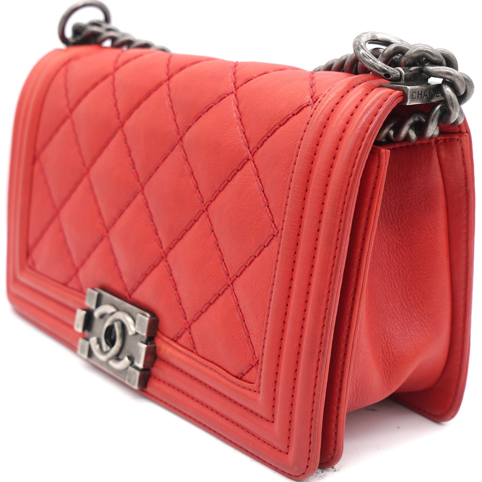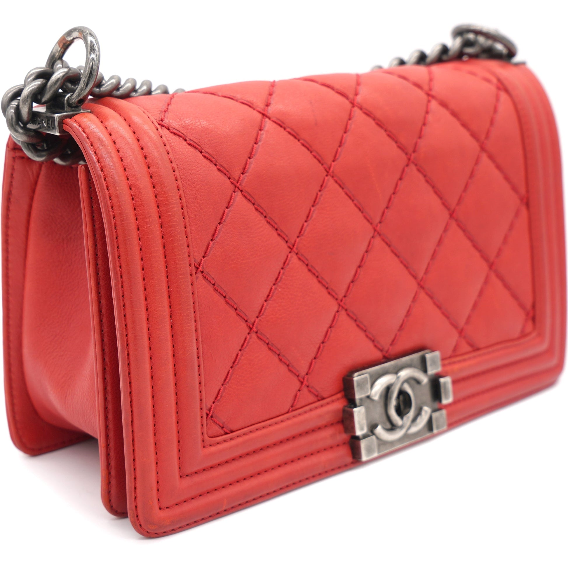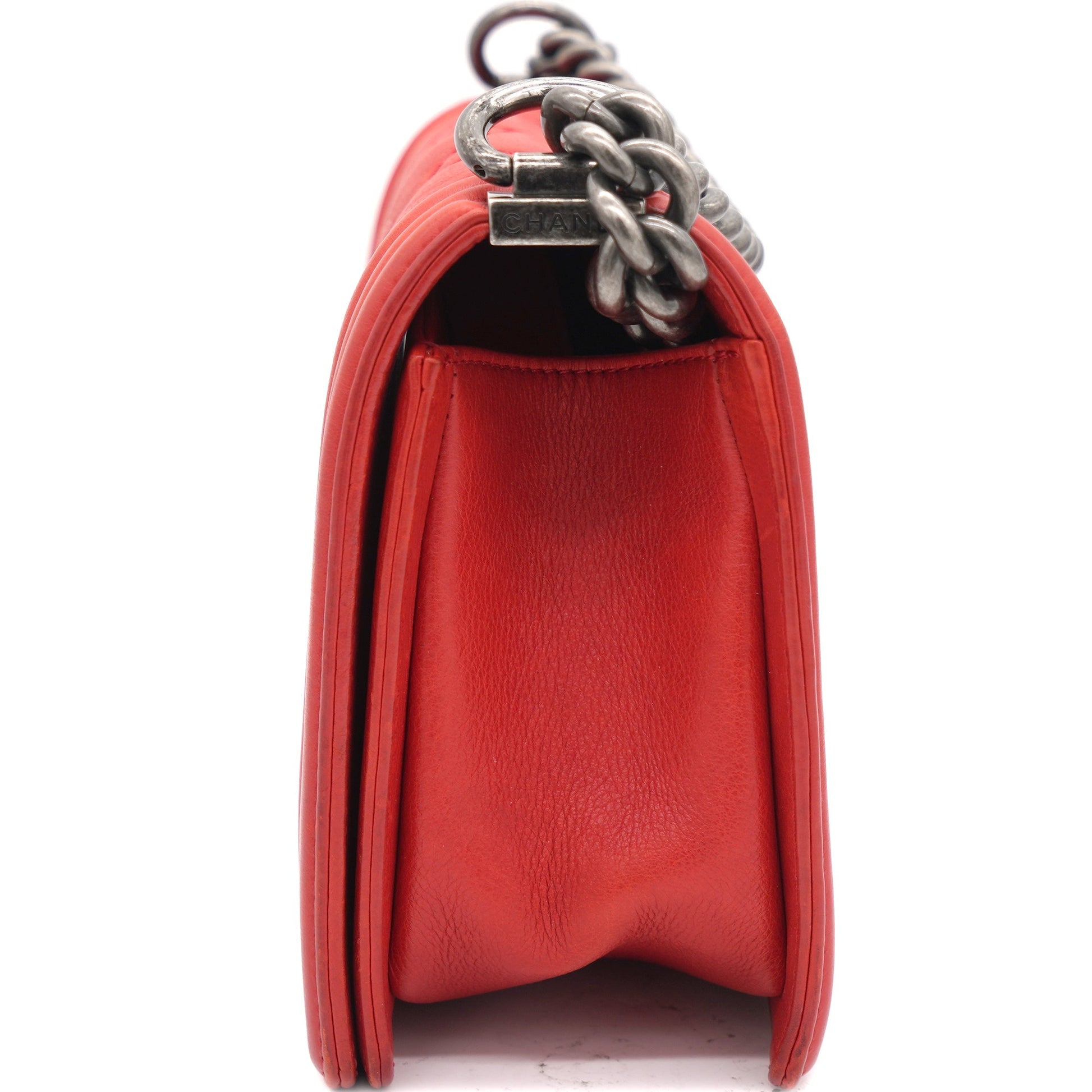 | Red double-stitched quilted leather Chanel Medium Boy Bag with ruthenium-tone hardware, convertible chain-link shoulder strap with leather shoulder guard, tonal grosgrain interior lining, single slip pocket at interior wall and CC push-lock closure at front flap. . | Material: Leather Lining: Textile Hardware: Silver color finish Metal Accessories:Dust Bag Serial Number: 18883060 Production Year: 2013 | ![]() |