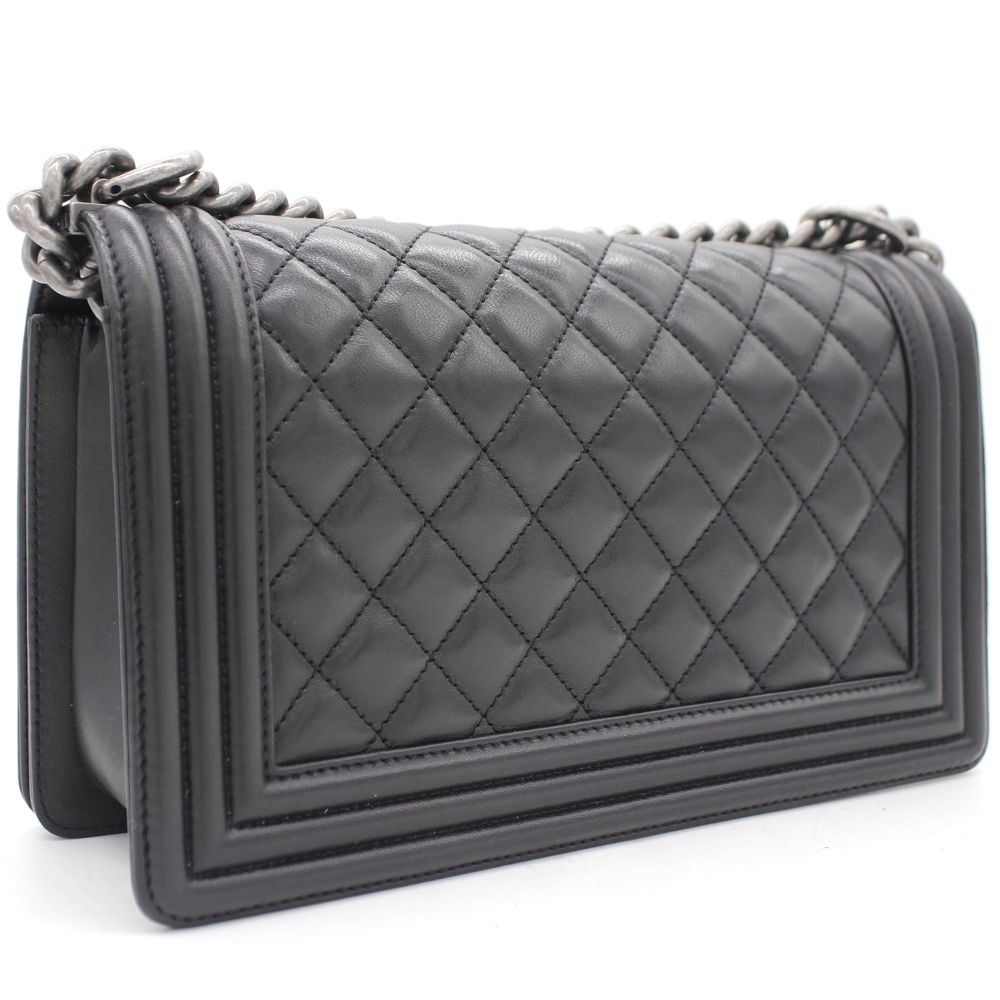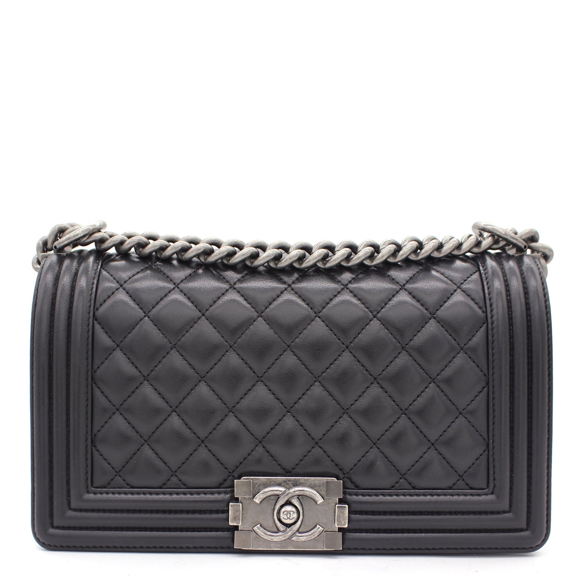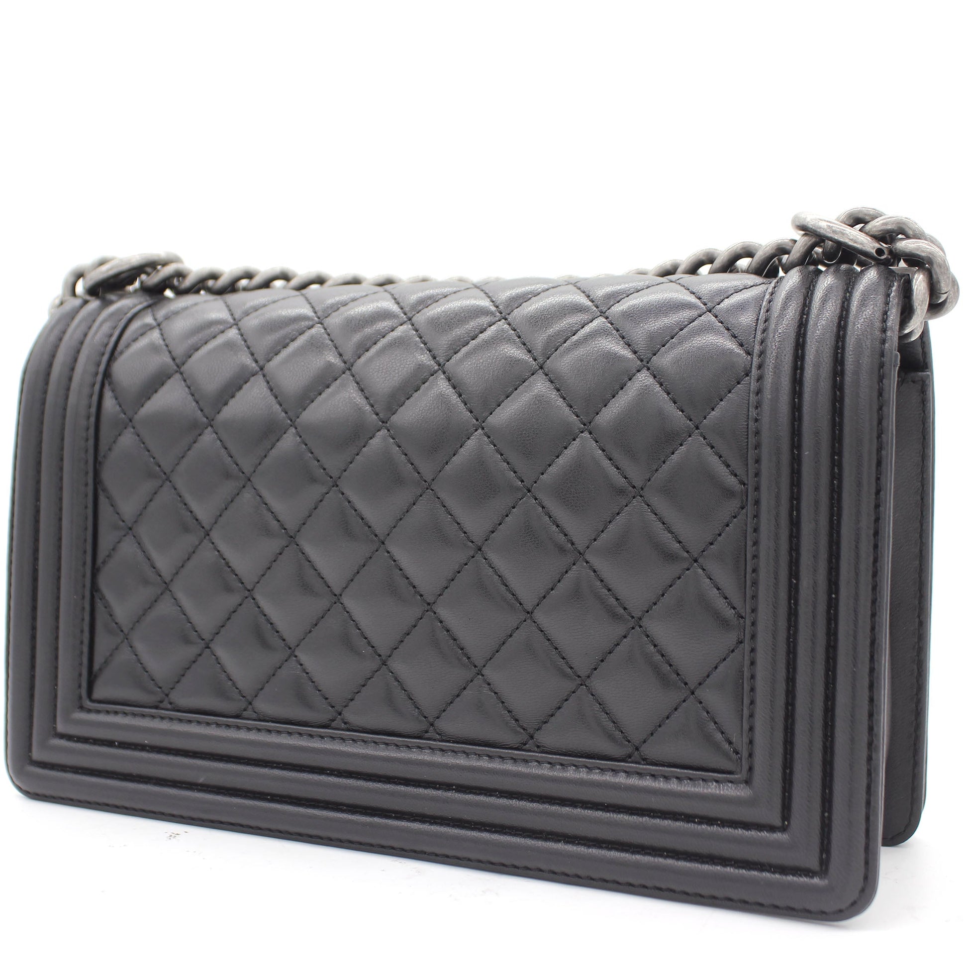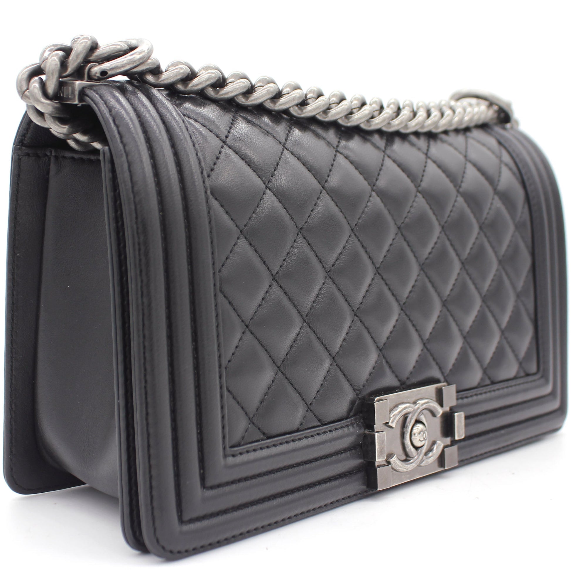 | Black double-stitched quilted leather Chanel Medium Boy Bag with silver-tone hardware, convertible chain-link shoulder strap with leather shoulder guard, tonal grosgrain interior lining, single slip pocket at interior wall and CC push-lock closure at front flap. | Material: Leather Lining: Textile Hardware: Silver-tone Hardware Accessories: Dust Bag;Box Measurement: Serial Number: 24207912 Bought Year: 2017 | ![]() |