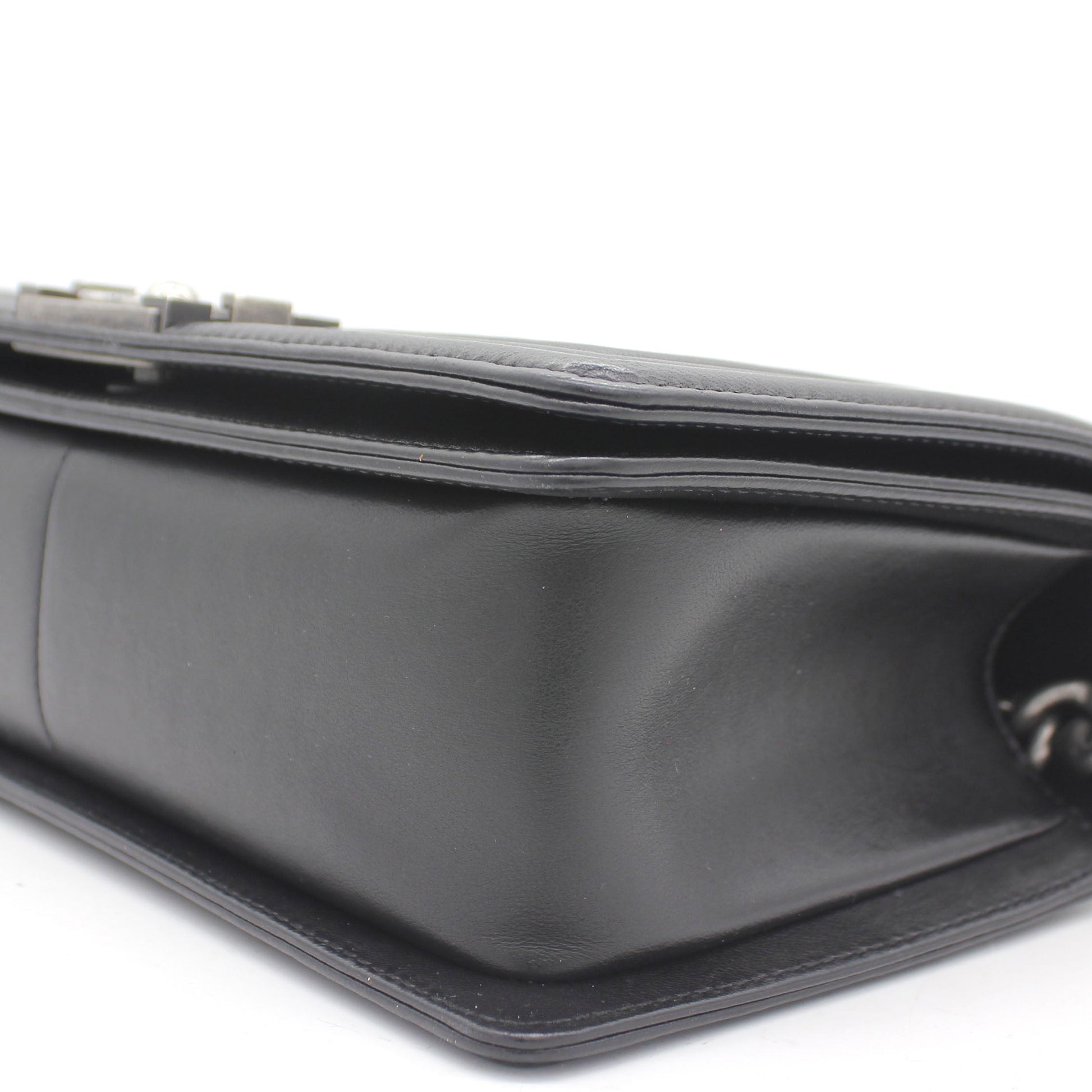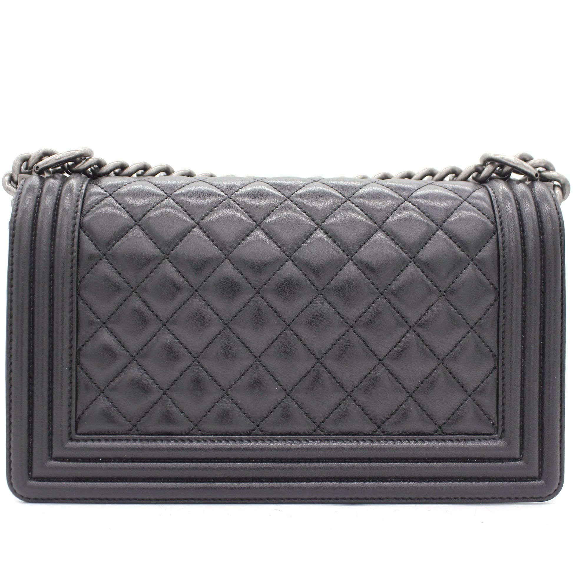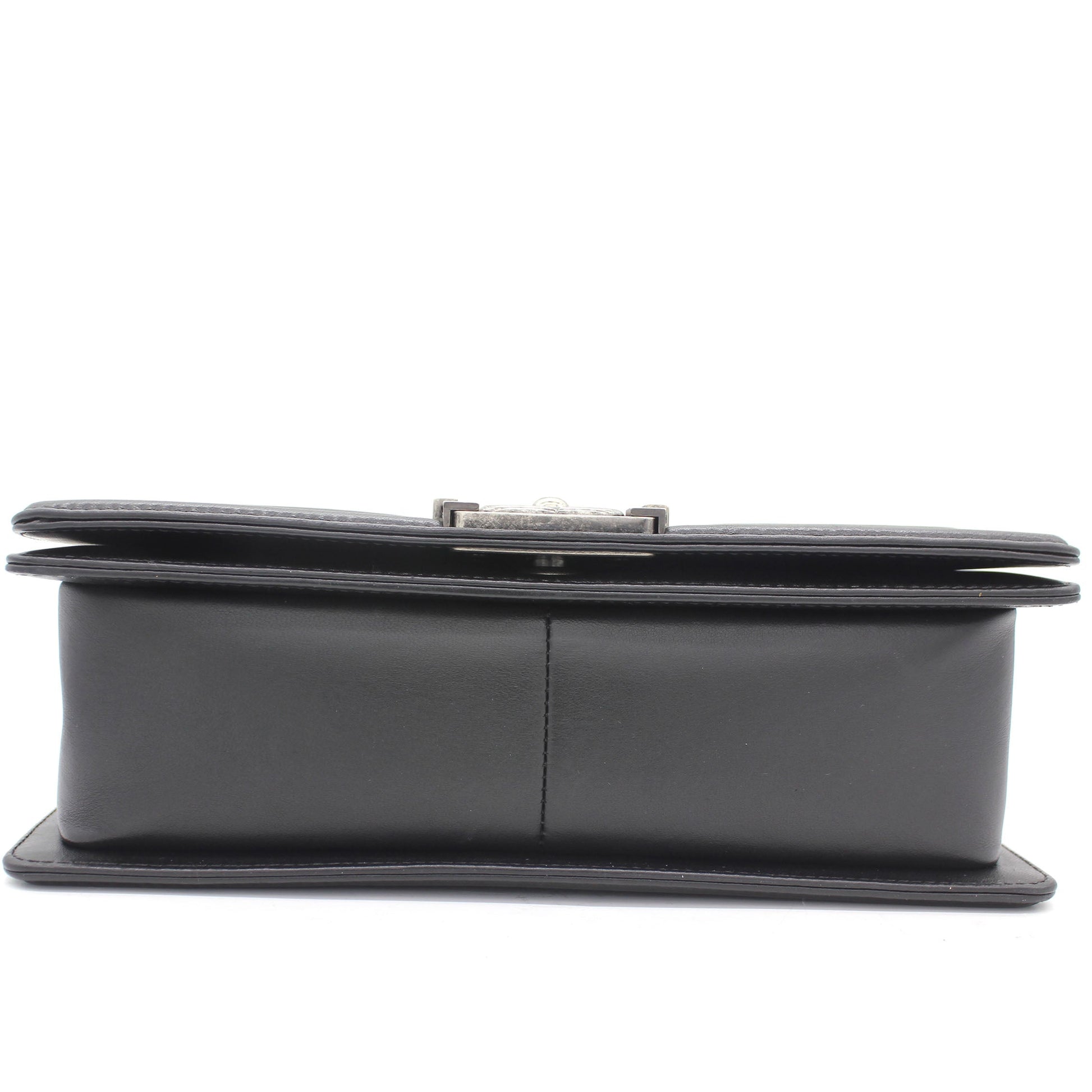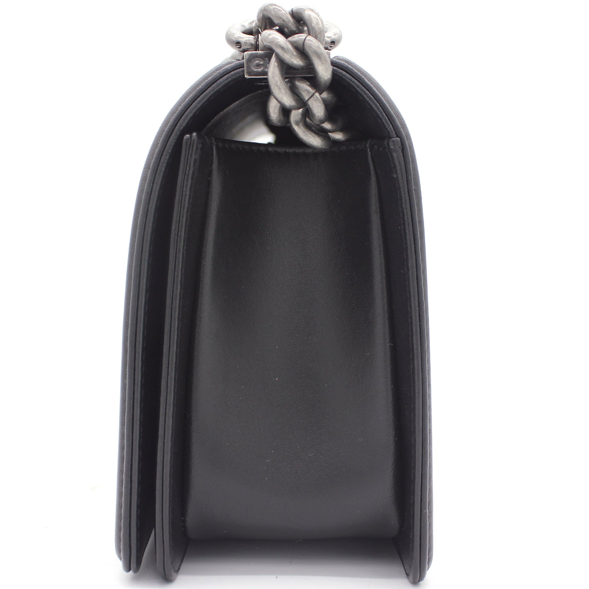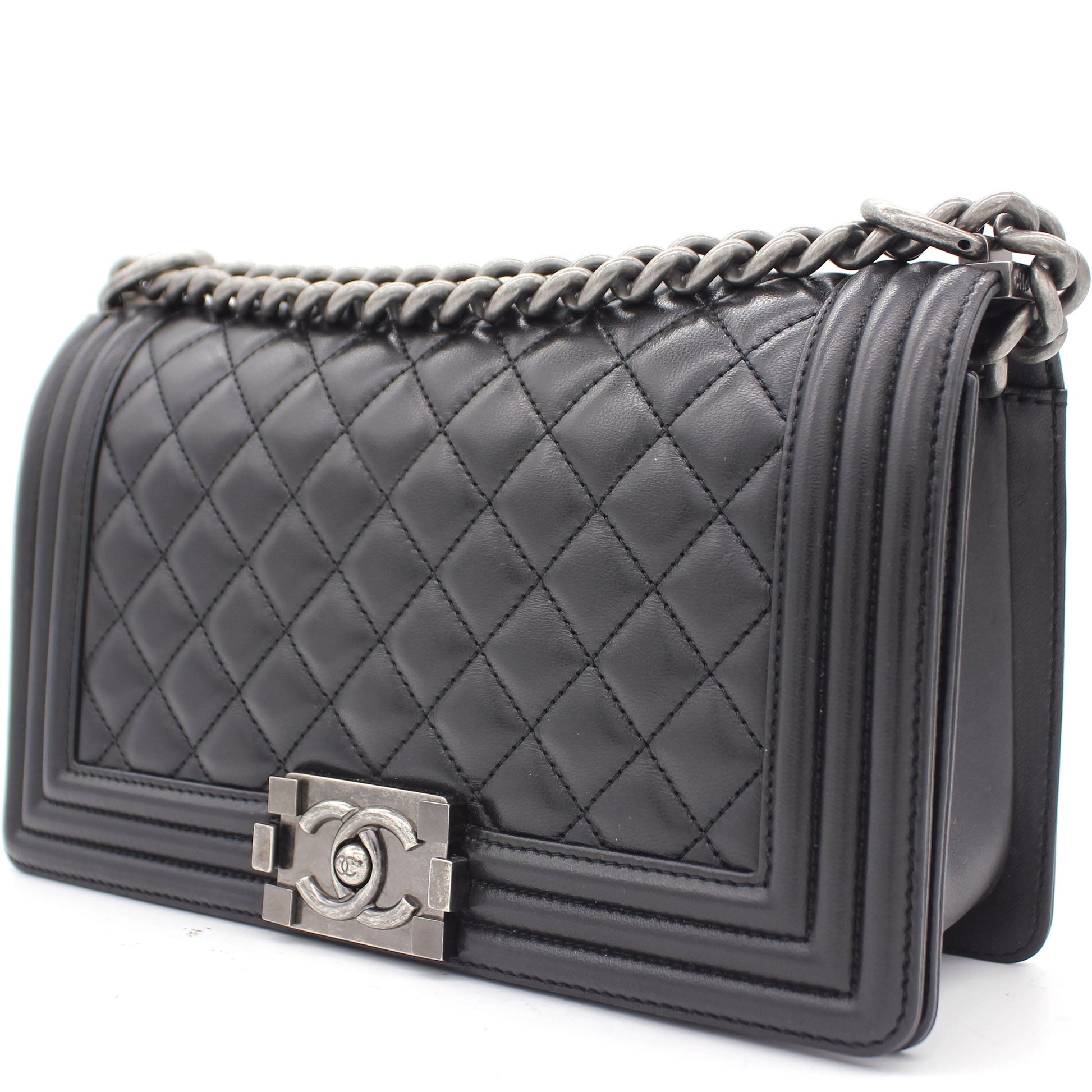 | Black double-stitched quilted leather Chanel Medium Boy Bag with silver-tone hardware, convertible chain-link shoulder strap with leather shoulder guard, tonal grosgrain interior lining, single slip pocket at interior wall and CC push-lock closure at front flap. | Material: Leather Lining: Textile Hardware: Silver-tone Hardware Accessories: Dust Bag;Box Measurement: Serial Number: 24207912 Bought Year: 2017 | ![]() |