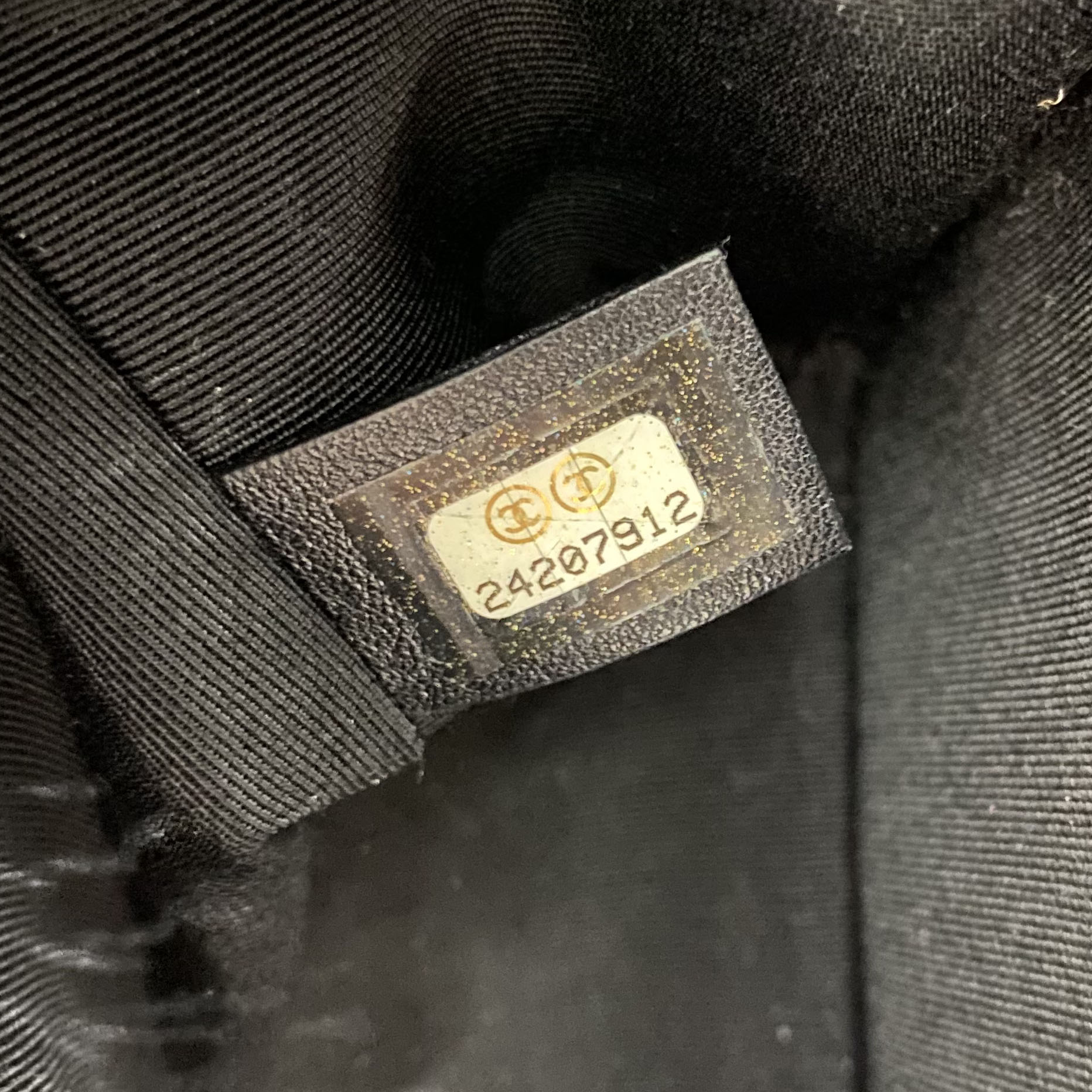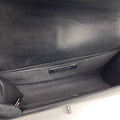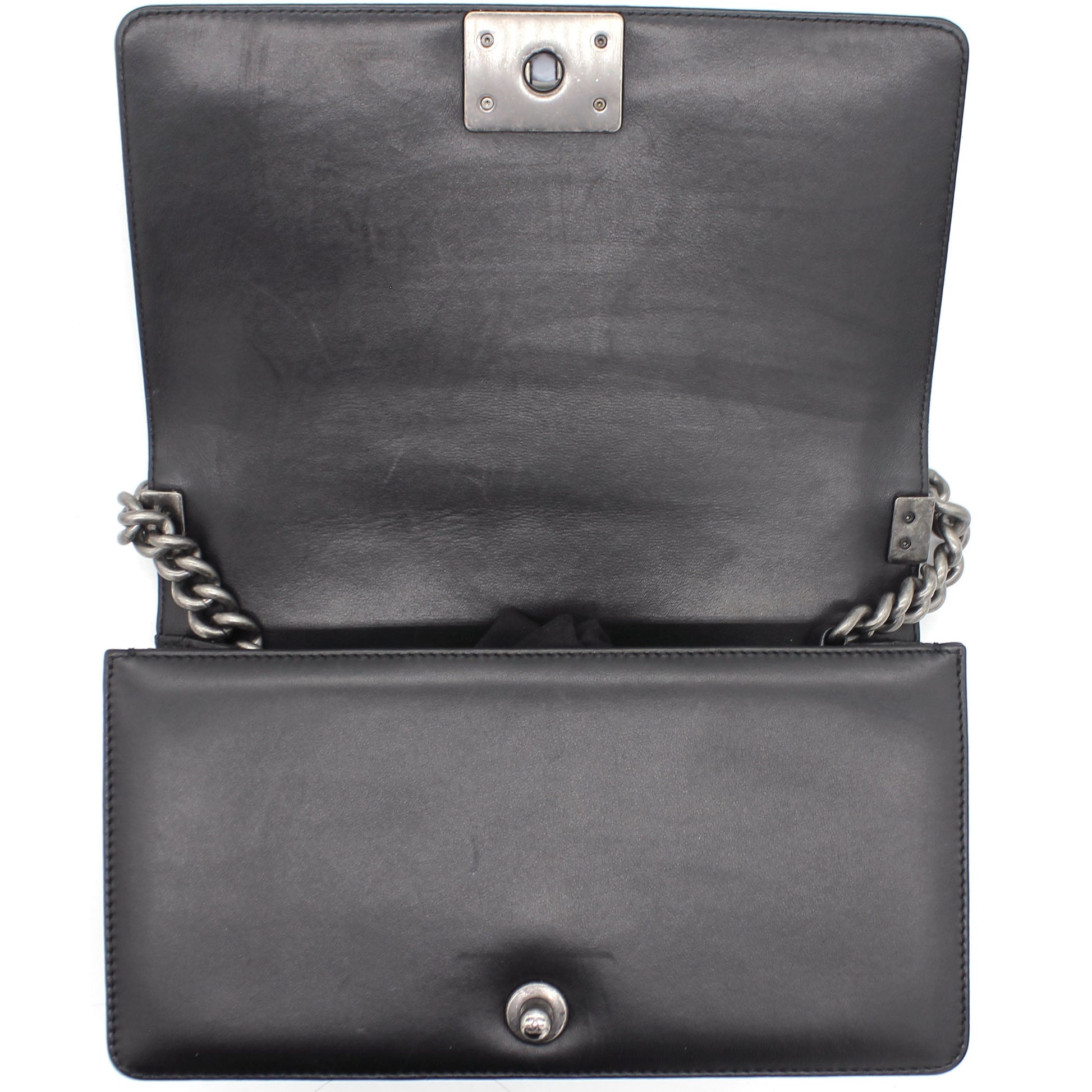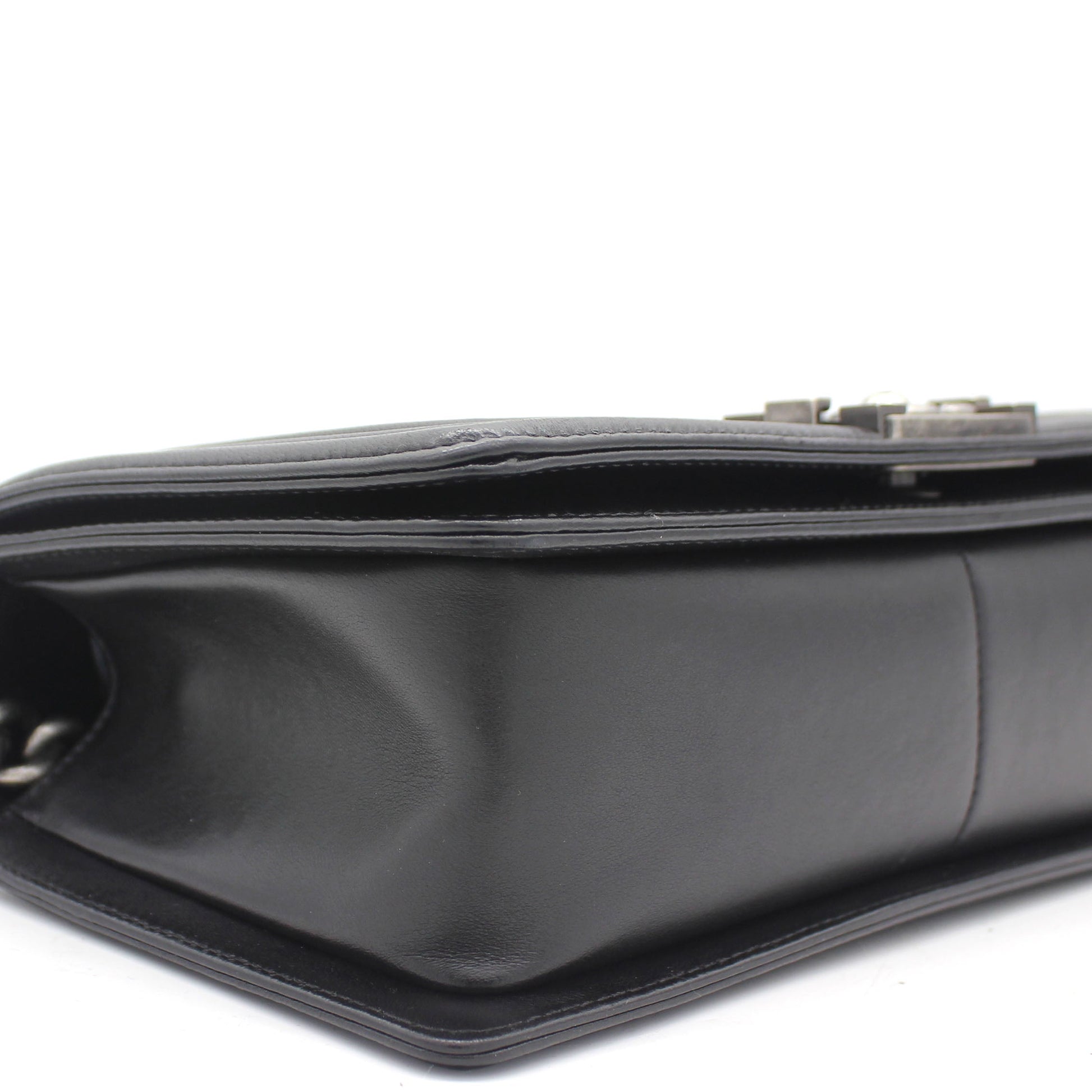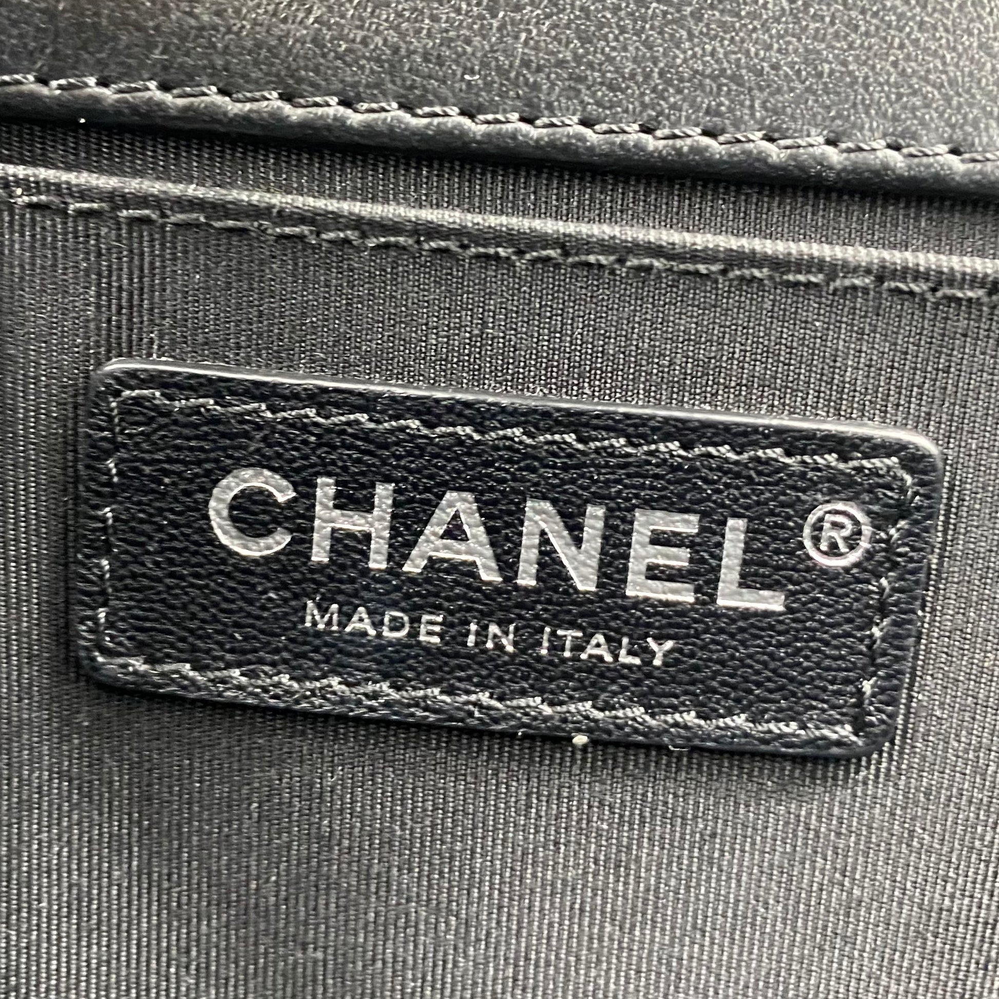 | Black double-stitched quilted leather Chanel Medium Boy Bag with silver-tone hardware, convertible chain-link shoulder strap with leather shoulder guard, tonal grosgrain interior lining, single slip pocket at interior wall and CC push-lock closure at front flap. | Material: Leather Lining: Textile Hardware: Silver-tone Hardware Accessories: Dust Bag;Box Measurement: Serial Number: 24207912 Bought Year: 2017 | ![]() |