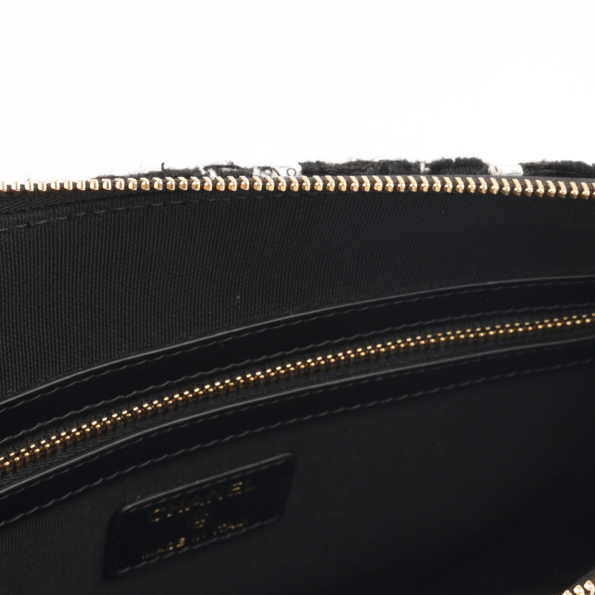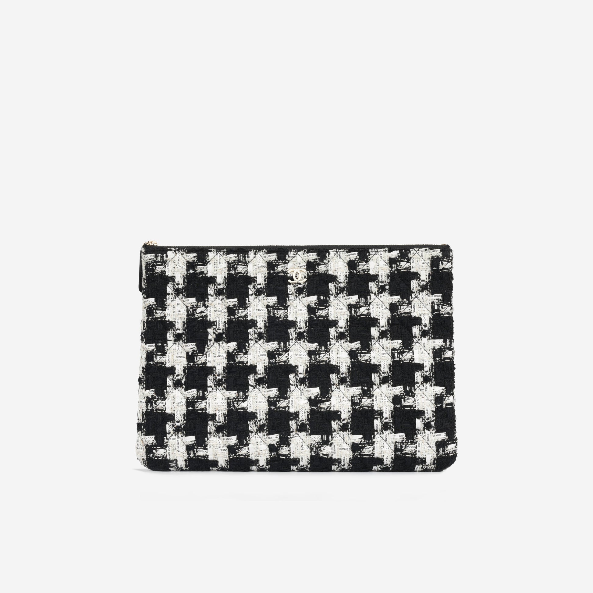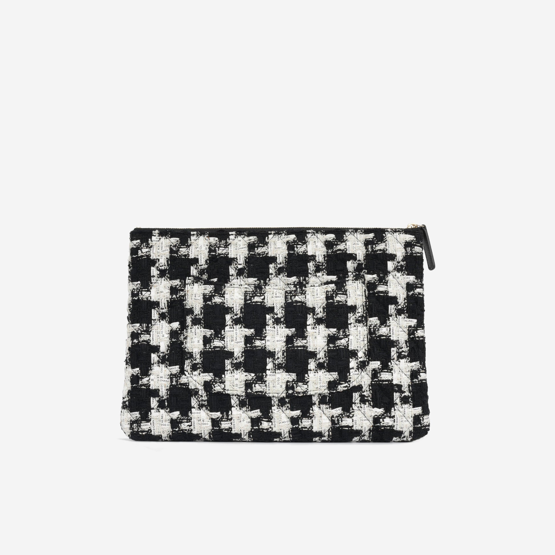Crafted from a combination quilted black/white houndstooth tweed fabric and black lambskin leather, Chanel presents their classy and practical O-case pouch. This piece is sleek, stylish and sophisticated. The ideal every day clutch, the O-Case by Chanel is understated and elegant while remaining timeless and fashion forward.