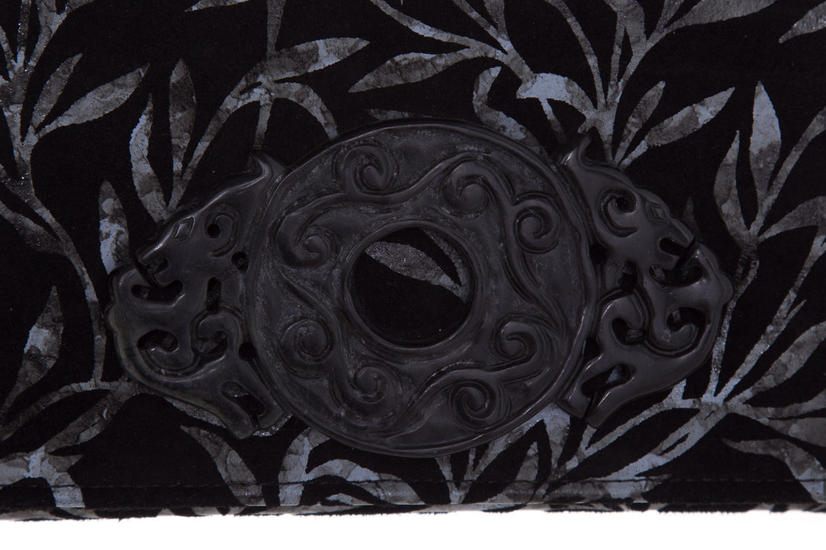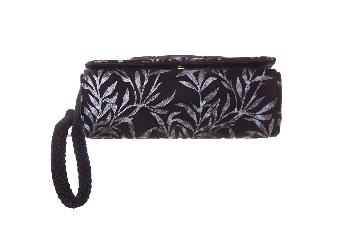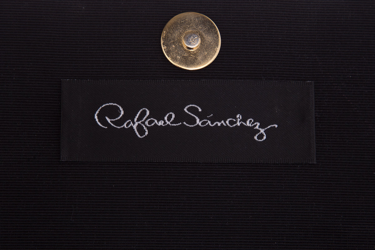 Vintage Rafael Sanchez Black Printed Shoulder Bag with button front snap for closure. This item is vintage and in good condition.
