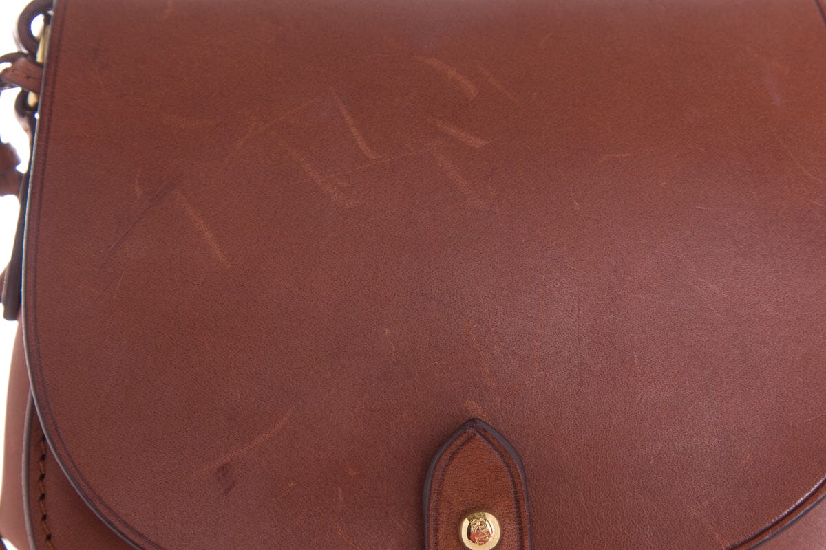 Ralph Lauren Collection Small Brown Handbag with Gold Hardware. This item is in fair condition; visible scratching/marks on exterior.