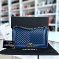 *Receipt, Full Set* Chanel Boy Old Medium 25CM Chevron Lambskin Leboy Dark Blue RSHW No 24