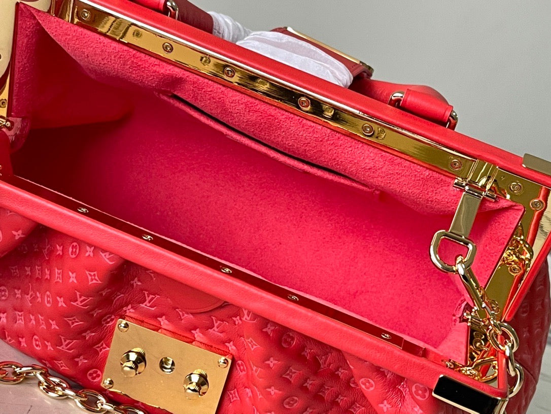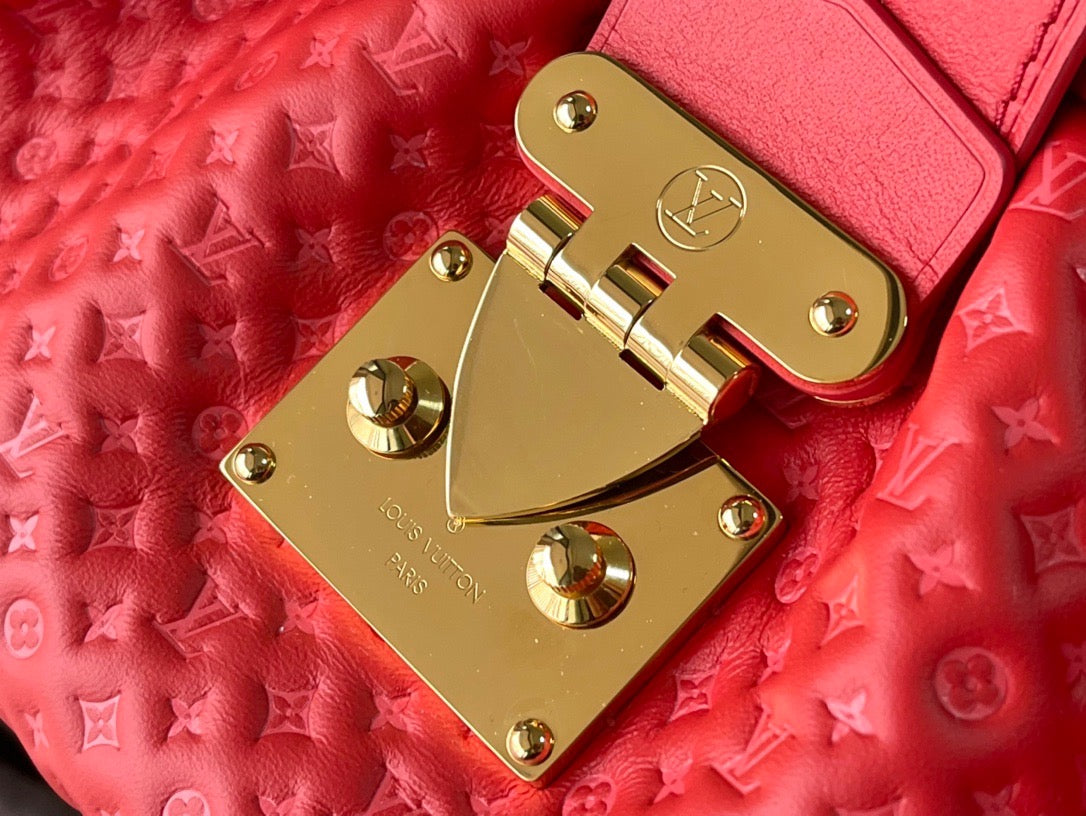 The Monogram Clutch is a part of the latest Nanogram collection and features a unique rotating handle design that can be concealed inside the bag for an elegant hand-carry look. Made of supple calfskin leather, this clutch boasts an embossed Monogram pattern that creates a subtle two-tone effect.
