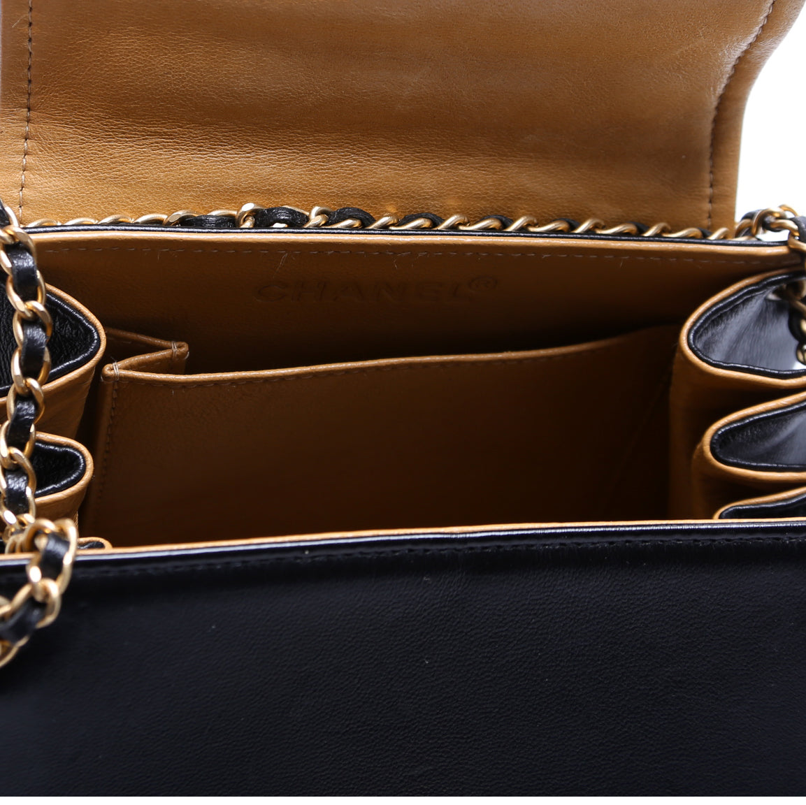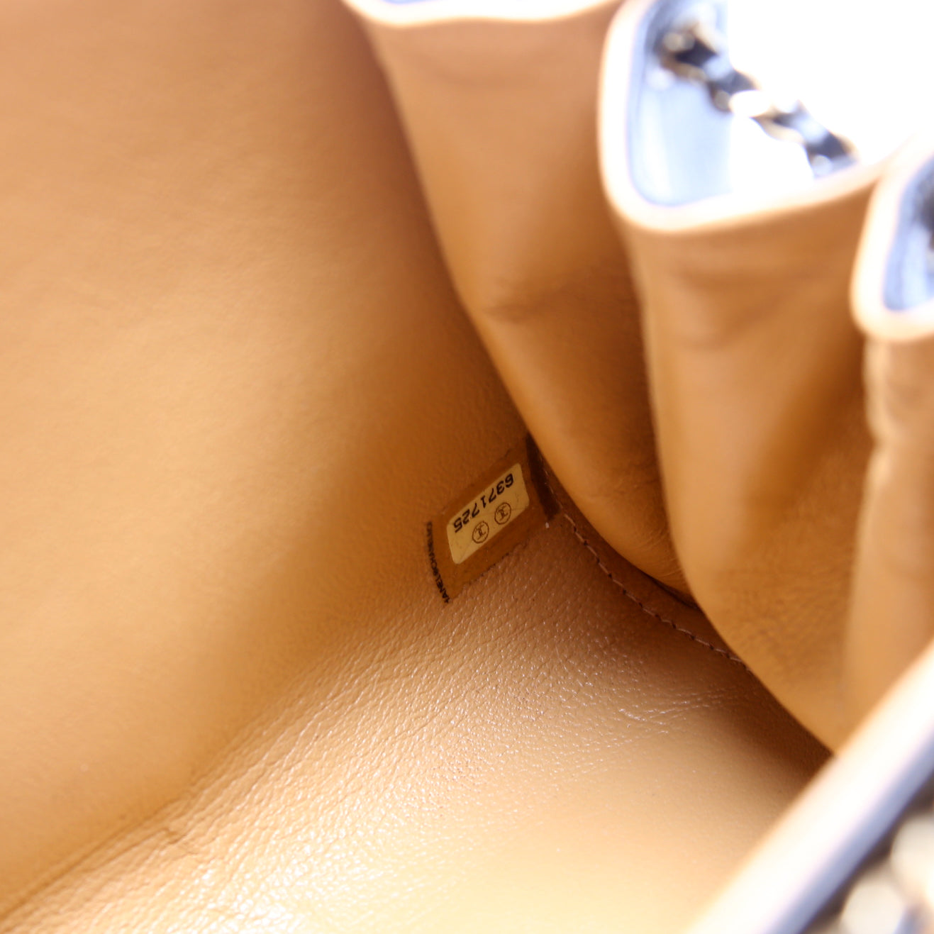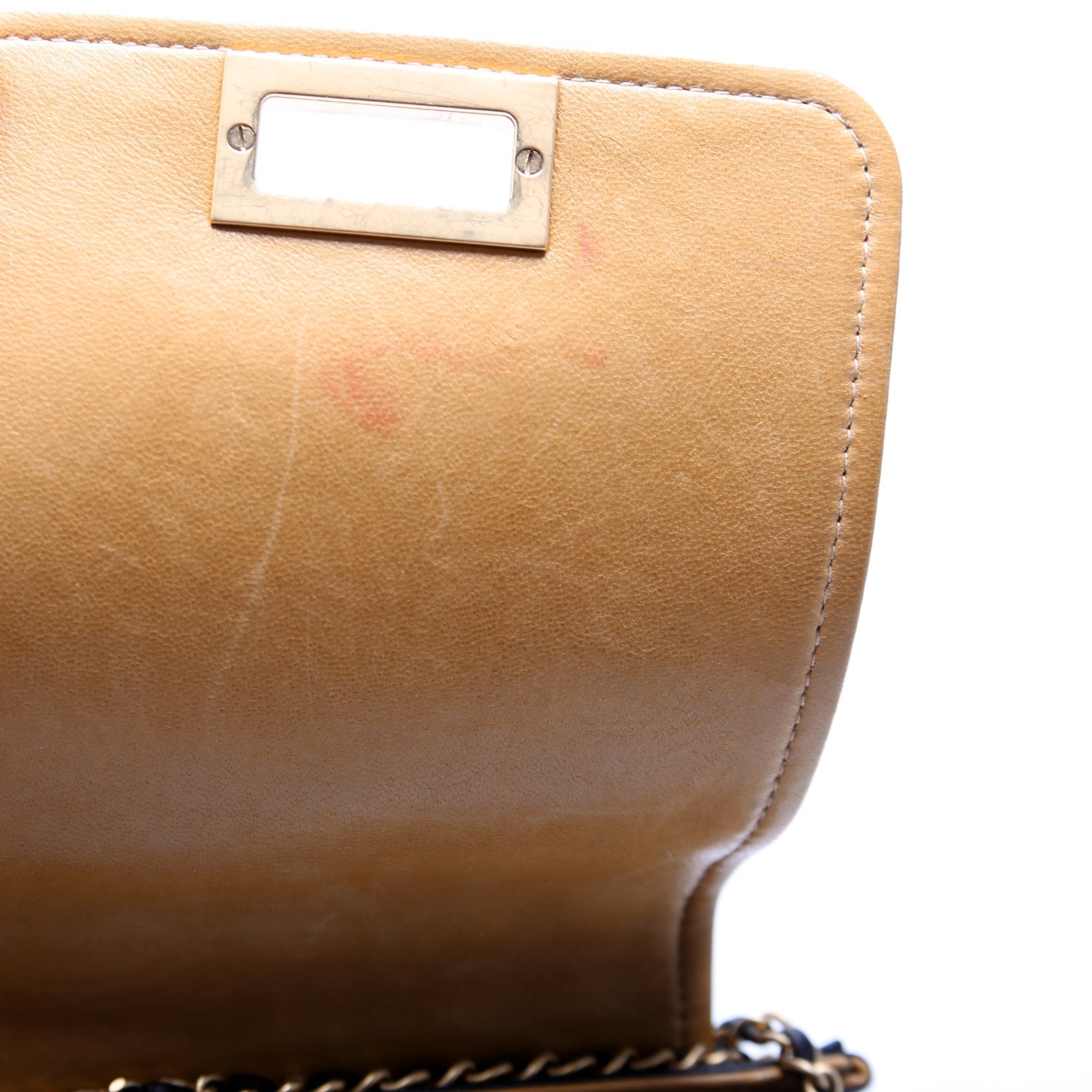 Interior: The interior is clean and free of rips or tears. The interior features one open pocket. The leather has scuffs throughout.