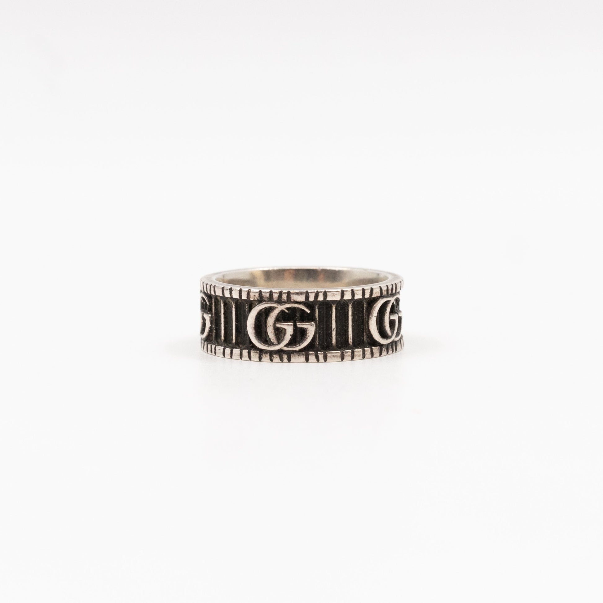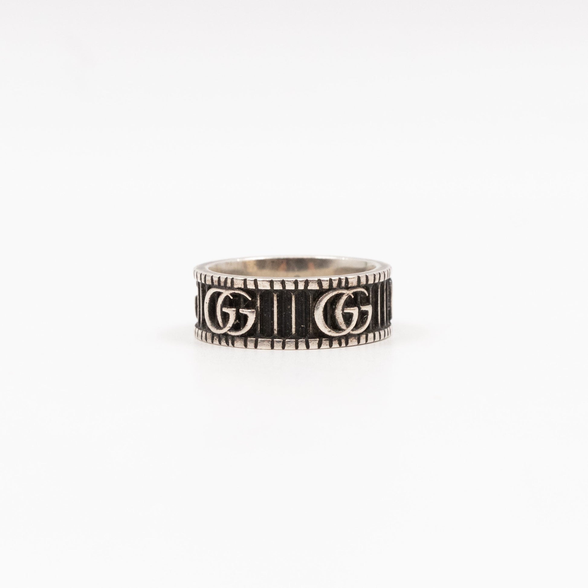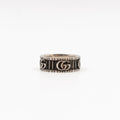 This is a stylish Gucci ring with double G in 925 silver. This ring designs is take on an archival Gucci belt from the '70s, the distinctive symbol is combined with engraved patterns on a collection of silver jewellery. There is a three-dimensional striped design with a bicolour effect, the emblematic code brings dimension to a thin ring. Current retail price €380.