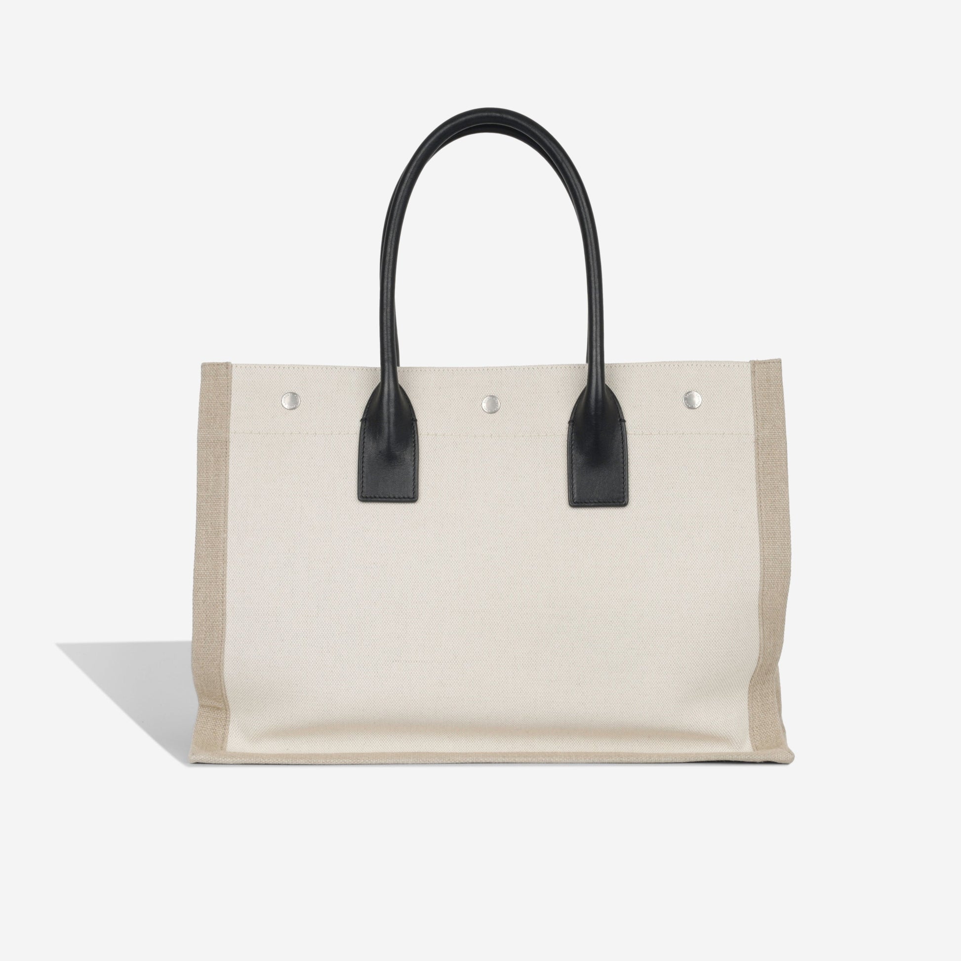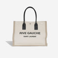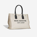 Acclaimed for its minimalist silhouettes, the Rive Gauche tote from Saint Laurent is the ideal accessory for any woman with a chic, simple sense of style and a love for luxury. Crafted from beige canvas and contrasting black lettering, the bag is large enough to carry around everything with you for a day of errands or shopping.